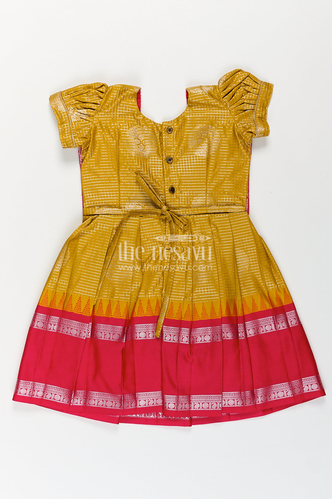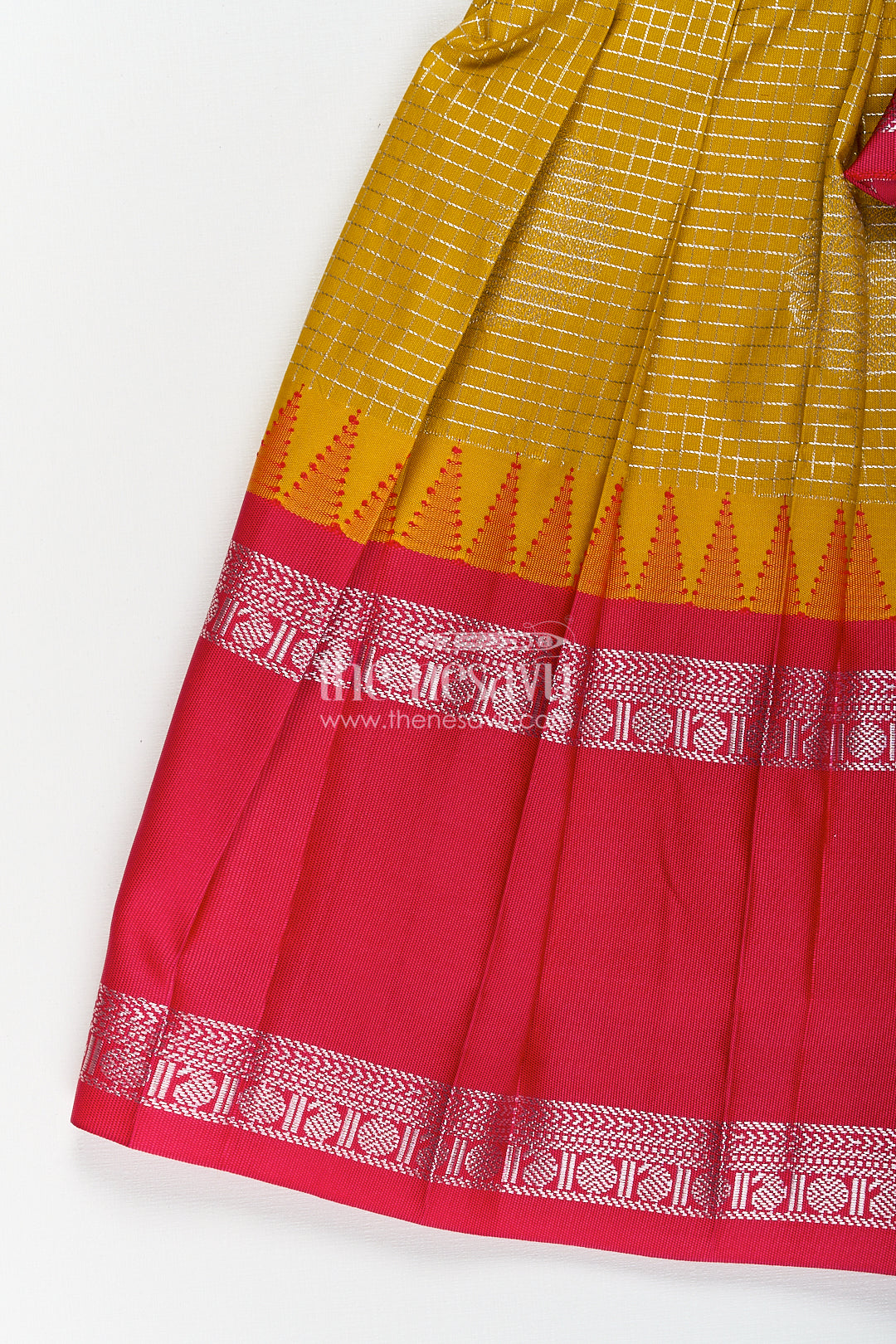 The Nesavu Silk Frock Girls Raw Silk Short Frocks in Semi Kanchivaram with Traditional Pink and Mustard Zari Border and Puff Sleeves Nesavu 14 (6M) / Yellow / Style 1 SF857AA-14 Nesavu Traditional Girls Raw Silk Short Frocks Semi Kanchivaram Pink Zari Border Mustard Base