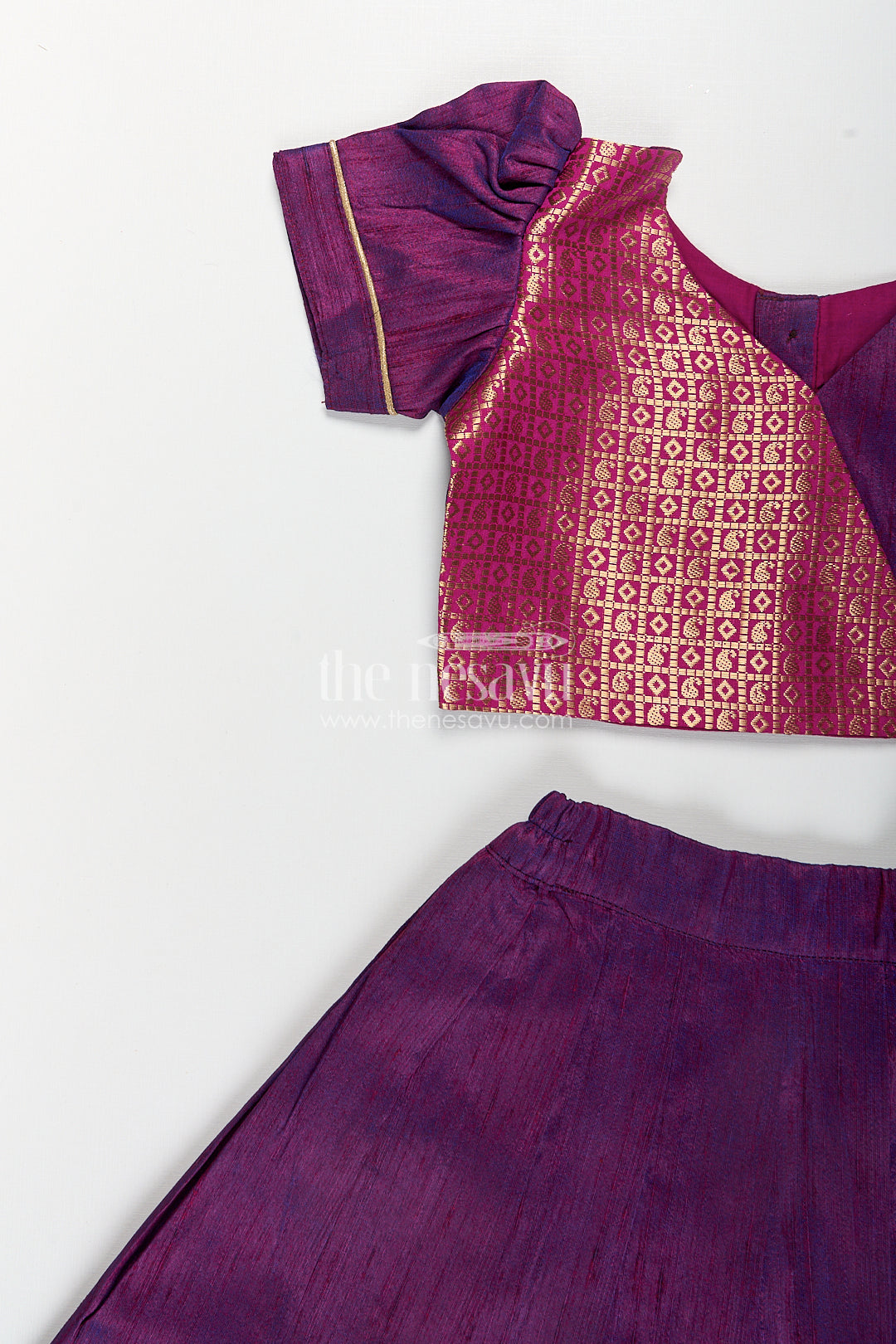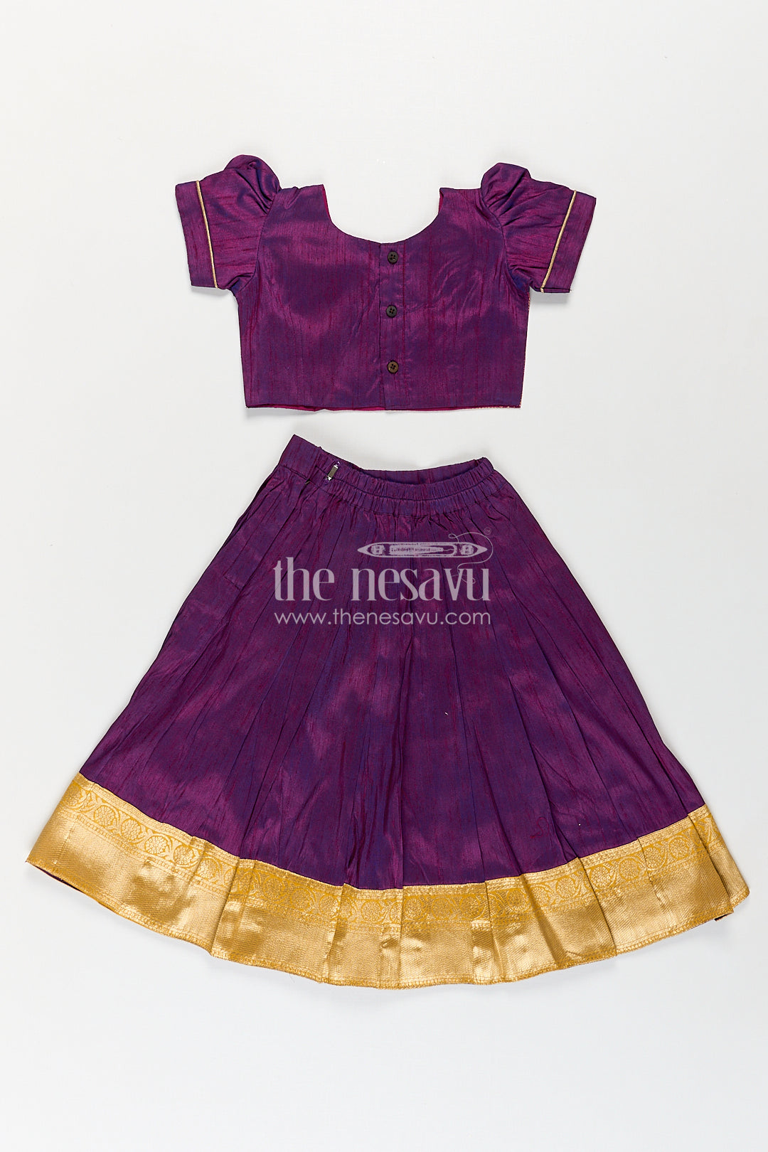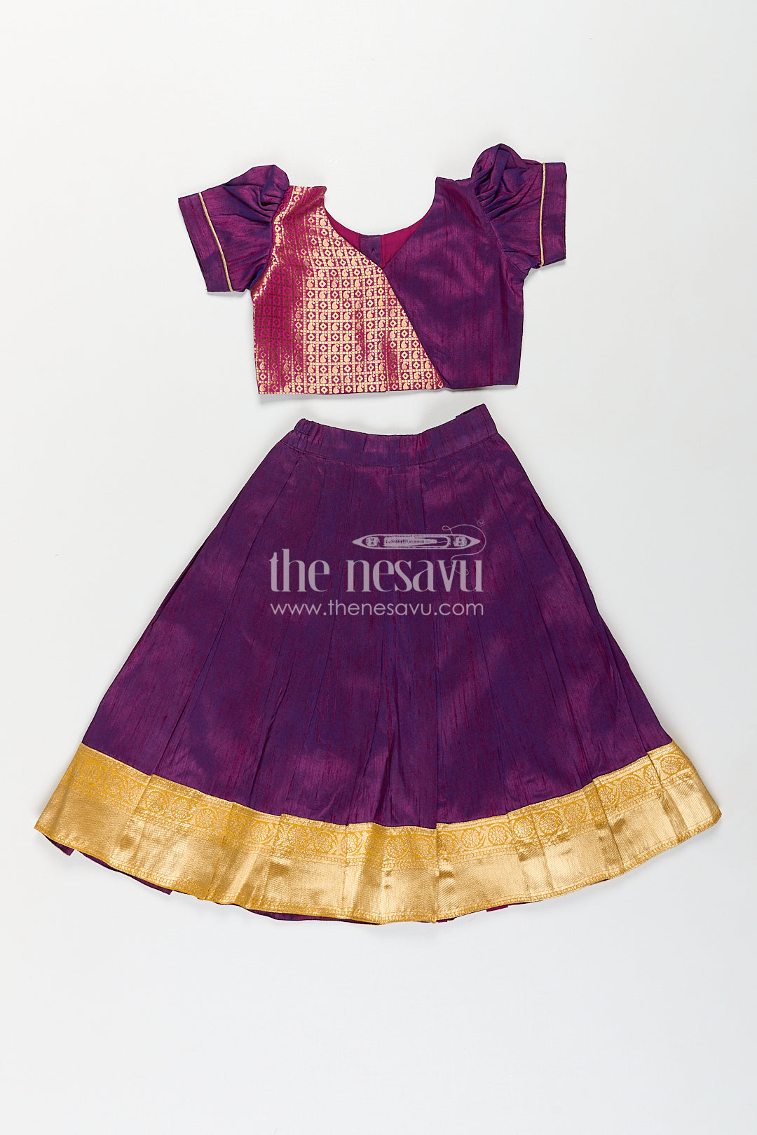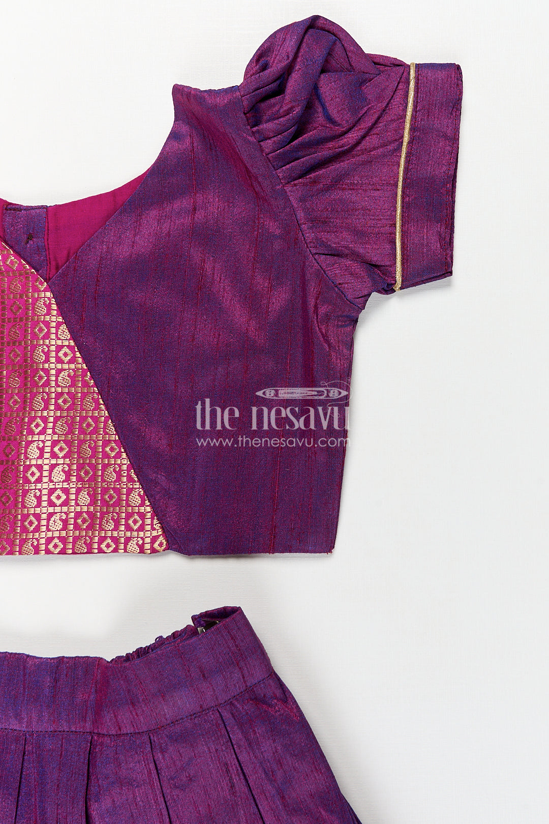 This exquisite silk banarasi lehenga is designed to bring out the grace and charm of your little girl. Crafted from semi banarasi jacquard paired with a raw silk bottom, the ensemble offers a perfect blend of traditional richness and modern sophistication. The deep purple hue accented with a contrasting golden zari border gives it a timeless appeal, while the pleated lehenga allows for ease of movement. The top features structured puff sleeves and a stylish neckline with delicate banarasi motifs, enhancing the ethnic elegance of the outfit. Ideal for any festive moment or cultural celebration, this lehenga ensures both comfort and style with its soft fabric and breathable finish. It's an outfit your child will love to twirl in while feeling absolutely royal.