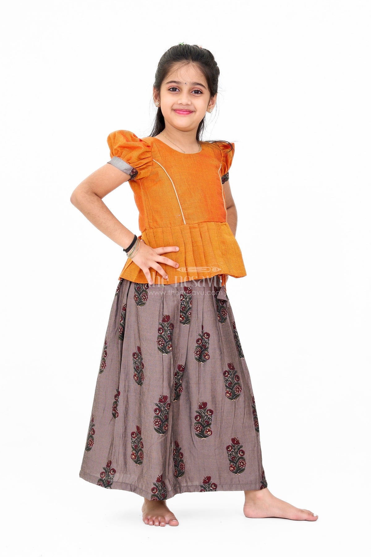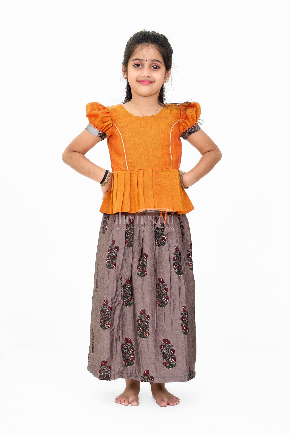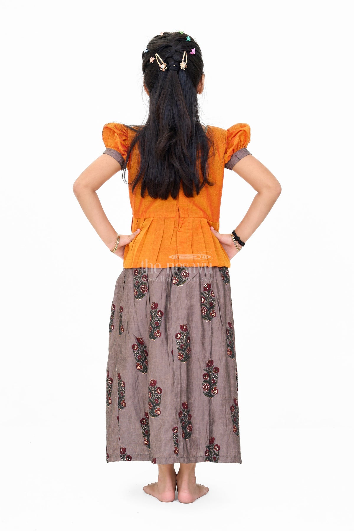 Pattu pavadai dress designs like this one bring timeless charm and traditional elegance to your little girl’s wardrobe. Crafted from a luxurious blend silk fabric, this vibrant orange and black ensemble showcases classic South Indian aesthetics. The orange blouse features a rich sheen with a structured fit, while the attached black skirt is adorned with subtle zari-inspired motifs that add a festive flair. Designed with both comfort and tradition in mind, the dress ensures ease of movement for active kids while maintaining a regal silhouette. Ideal for temple visits, cultural events, or family gatherings, the breathable silk blend keeps her comfortable all day long. The back closure allows for easy dressing, and the refined color combination makes it a standout choice for any celebration. This pattu pavadai dress effortlessly blends tradition with comfort, making it a cherished piece in every girl’s ethnic collection.
