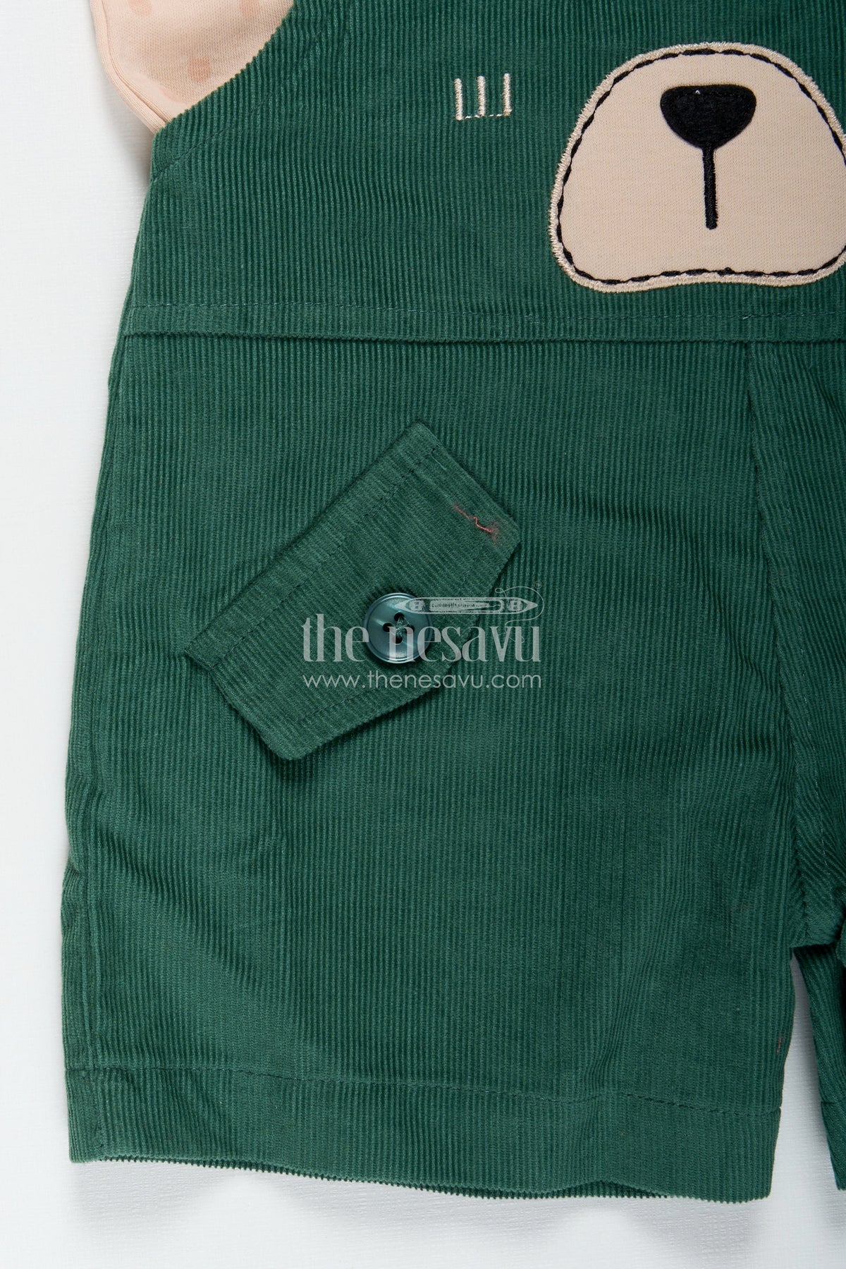 Your little one will look irresistibly cute and feel ultra-comfy in this charming green dungaree set for babies from Nesavu. The outfit features a soft beige printed T-shirt made from breathable knitted cotton jersey paired with green corduroy dungarees that sport a sweet bear face embroidery and buttoned pocket detail. Designed with gentle stretch and a relaxed fit, this set ensures comfort throughout the day—perfect for playdates or everyday outings. Easy-to-fasten shoulder buttons and fuss-free care make it a parent-approved choice. The classic color combo and adorable design offer timeless style for your baby boy.