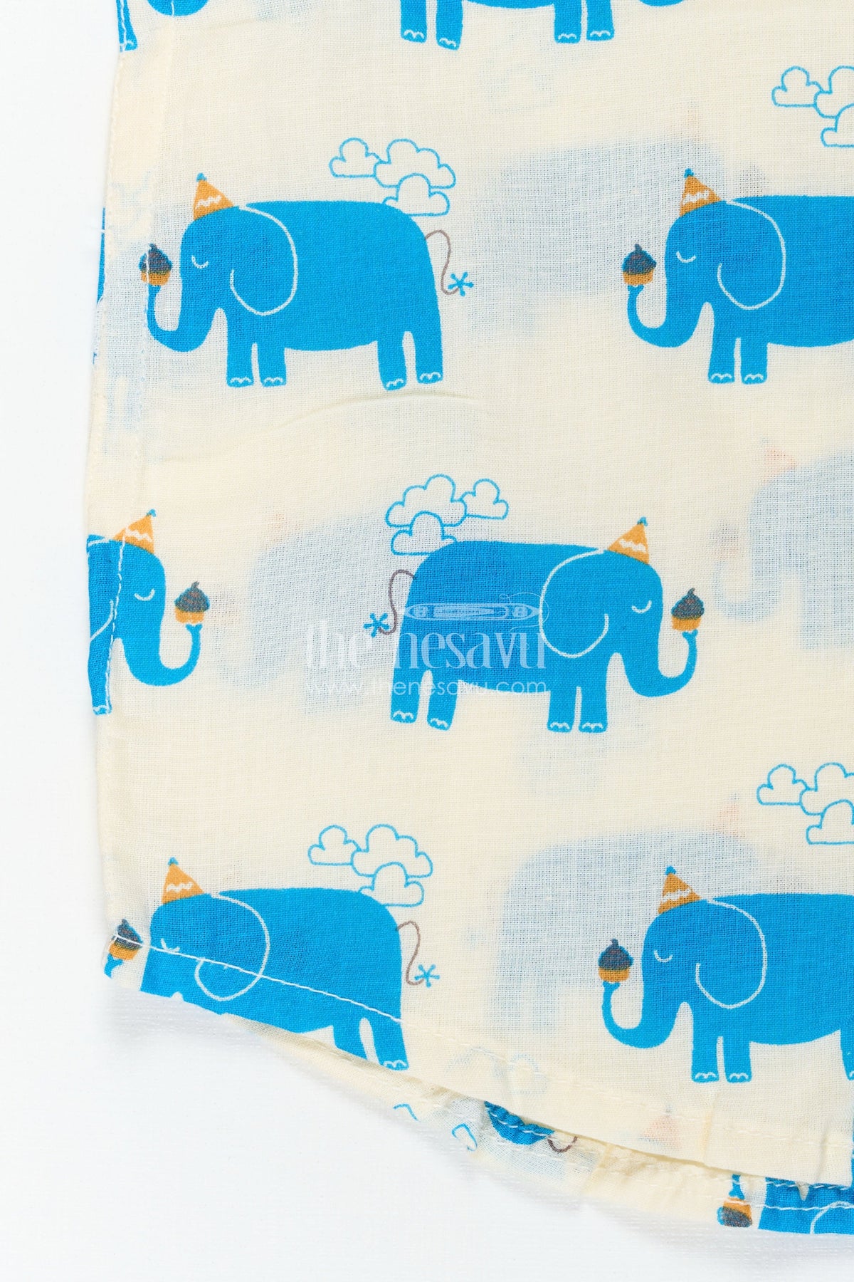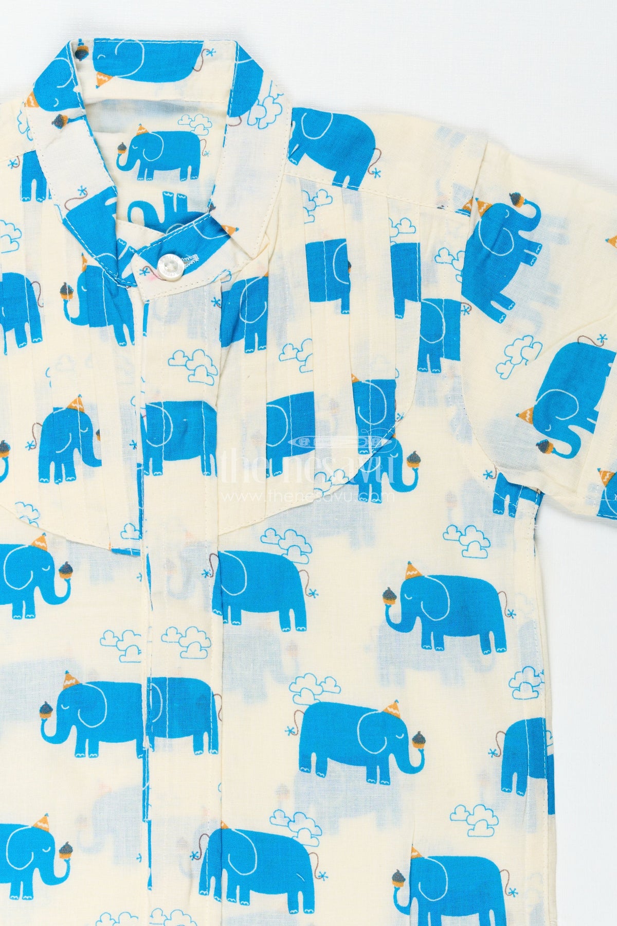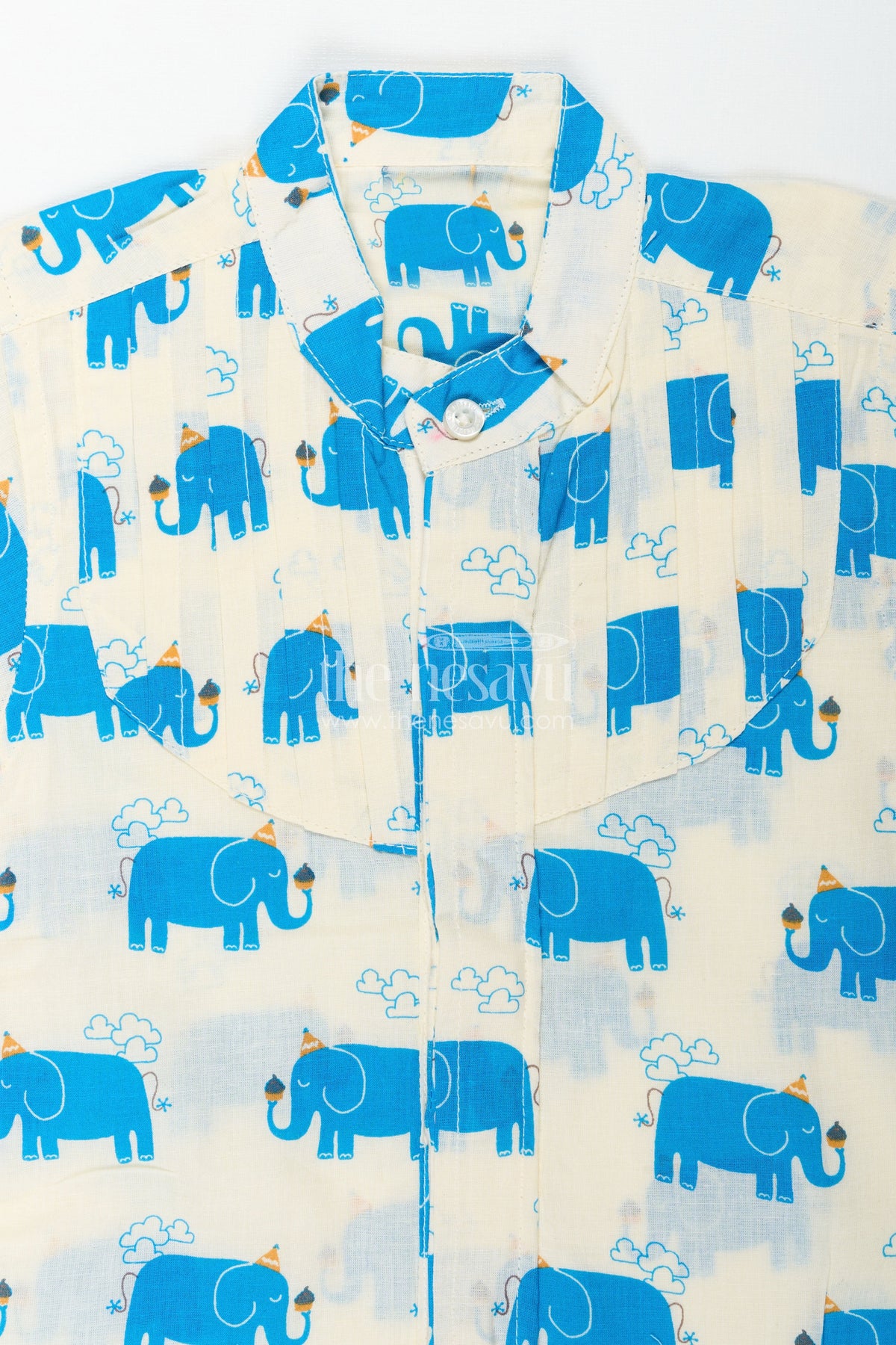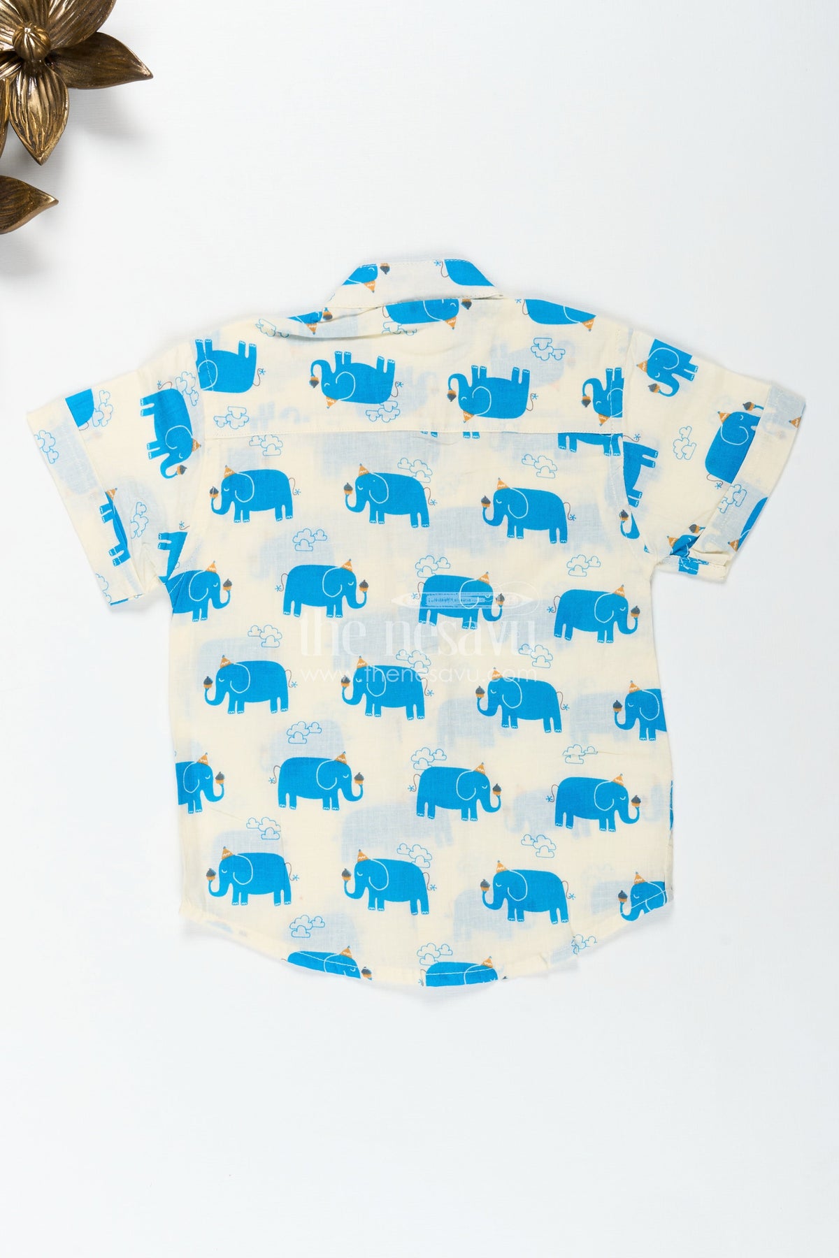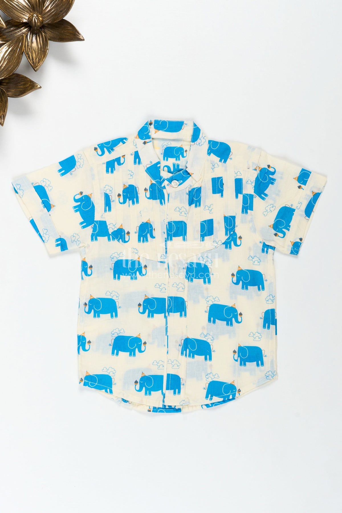 Handcrafted elephant design boys shirt is a unique expression of creativity and comfort, ideal for kids who love playful prints. This cotton shirt features vibrant blue elephants scattered across a cream base, giving it a handcrafted and artistic appearance. Perfect for daily wear or outings, it offers breathable comfort through lightweight cotton, short sleeves, and a relaxed fit. A smart mandarin collar and neat pleated front add to the shirt’s structured appeal, balancing casual fun with subtle formality. With button-down closure and easy wash care, this shirt is both practical and full of character - just right for the little explorer in your life.