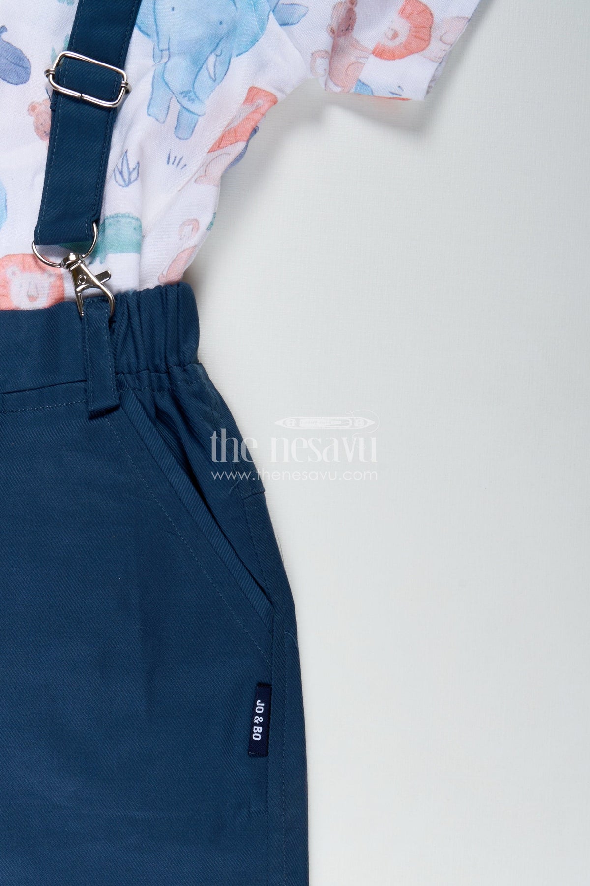 Add fun to your baby boy’s wardrobe with the infant navy blue dress set by Nesavu, featuring a playful digital print shirt and matching navy blue shorts. Made from lightweight cotton, the shirt is adorned with a safari of adorable animals including lions, elephants, crocodiles, and more, making it a delightful pick for daytime outings or playdates. A navy blue bow tie adds a smart finishing touch to the button-down shirt. The shorts are crafted from soft, durable cotton with suspenders for extra charm and a secure fit. Designed for both comfort and mobility, this two-piece set is perfect for your infant’s first steps into style and adventure.