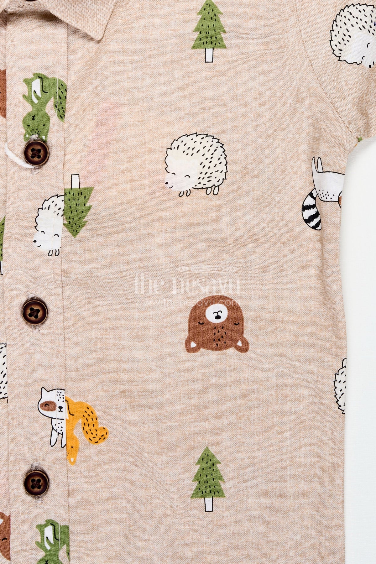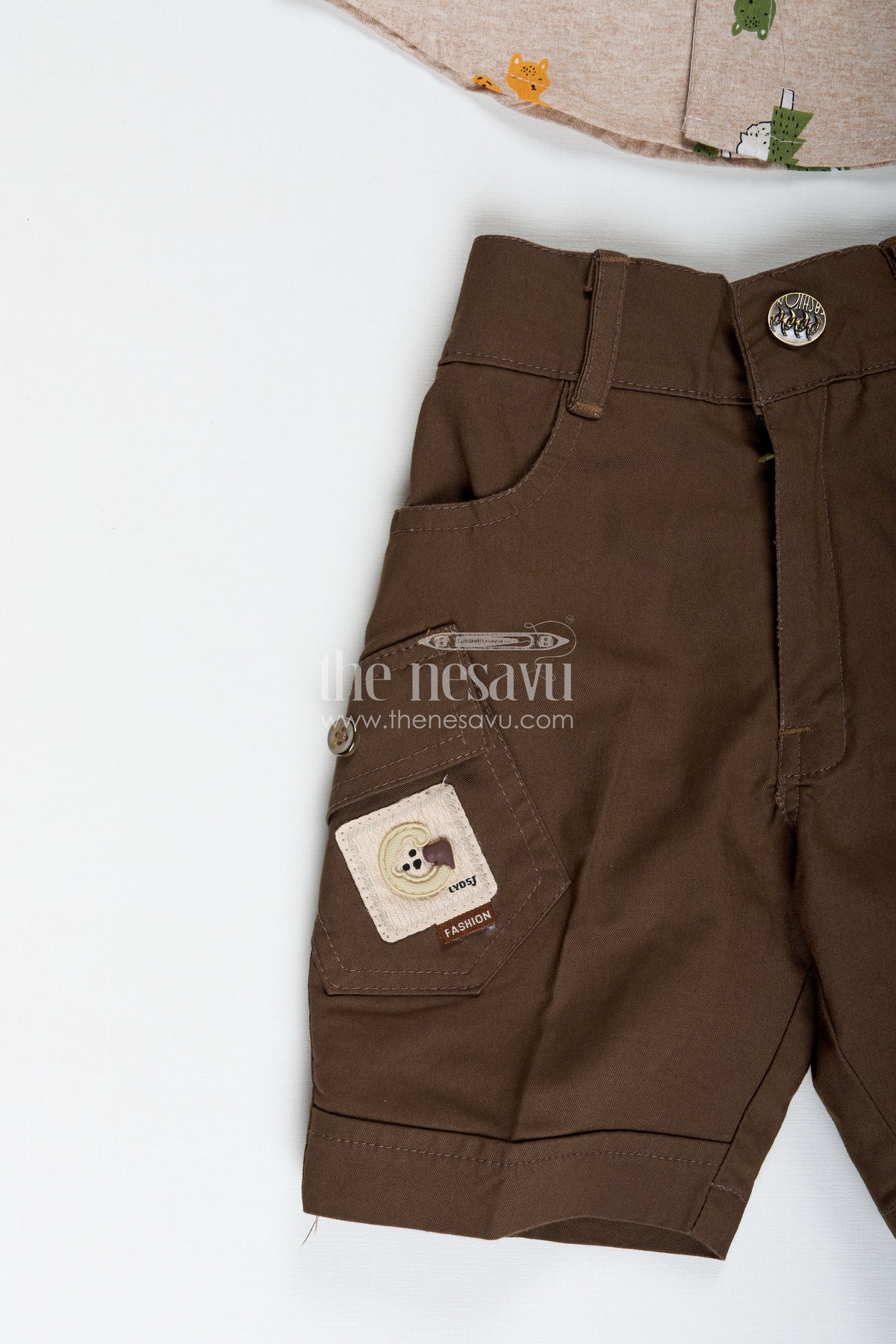 Jungle print shirt and shorts set for toddler boys brings playful wilderness charm to your little one’s wardrobe. Featuring an adorable beige cotton shirt with digital prints of forest animals like foxes, bears, and hedgehogs, this set is perfect for nature-loving tots. The shirt is paired with rugged brown cargo-style shorts equipped with buttoned flap pockets for added functionality. Crafted from breathable cotton, this outfit ensures all-day comfort and freedom of movement. Ideal for outdoor play or casual outings, the earthy tones and fun prints make it a versatile go-to for your growing explorer.