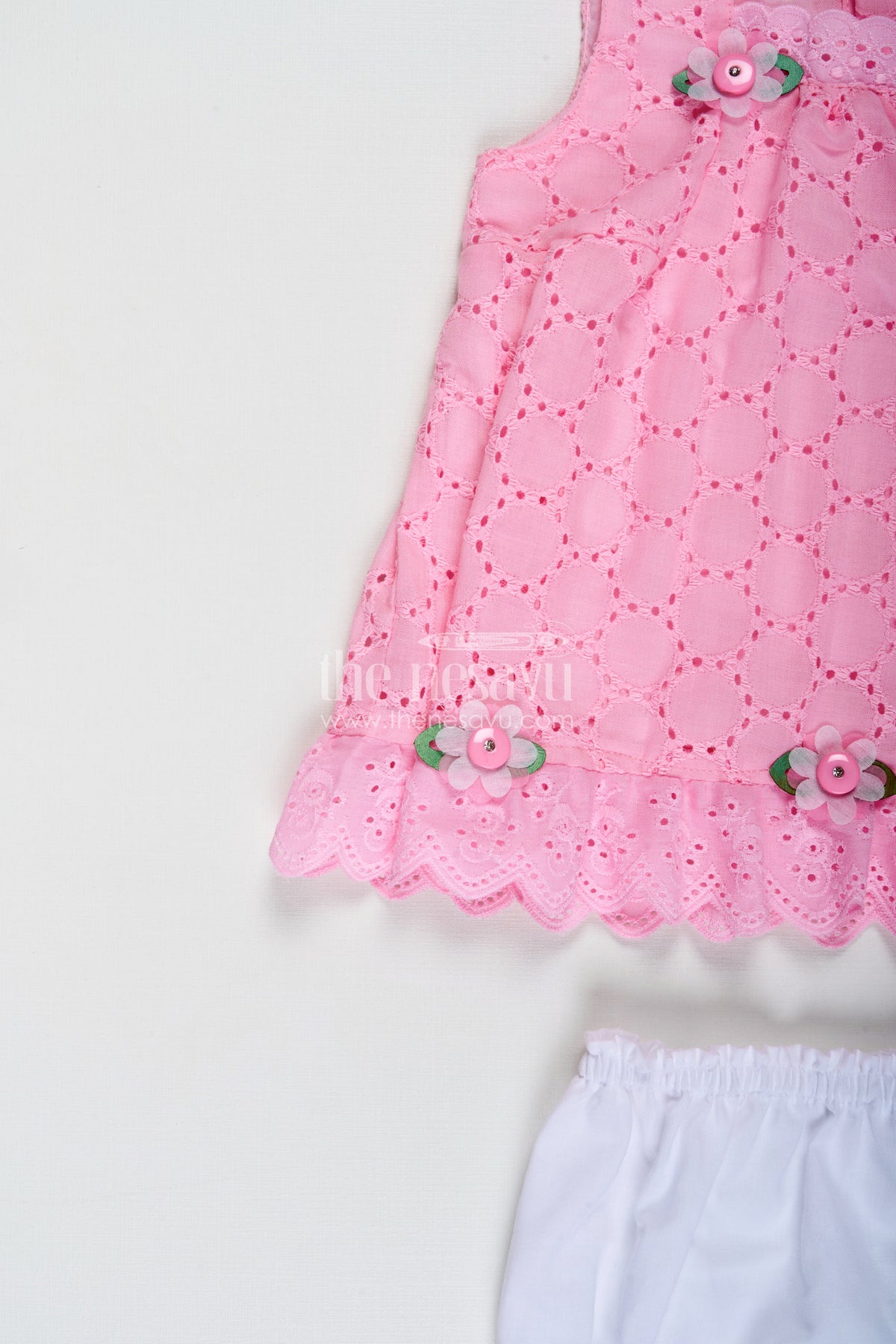 The Nesavu Baby Cotton Frocks Party Cotton Dress for Girls Hakoba Bloomer Set Nesavu Nesavu Pink Cotton Embroidered Party Frock Girls Floral Trim Matching Bloomer