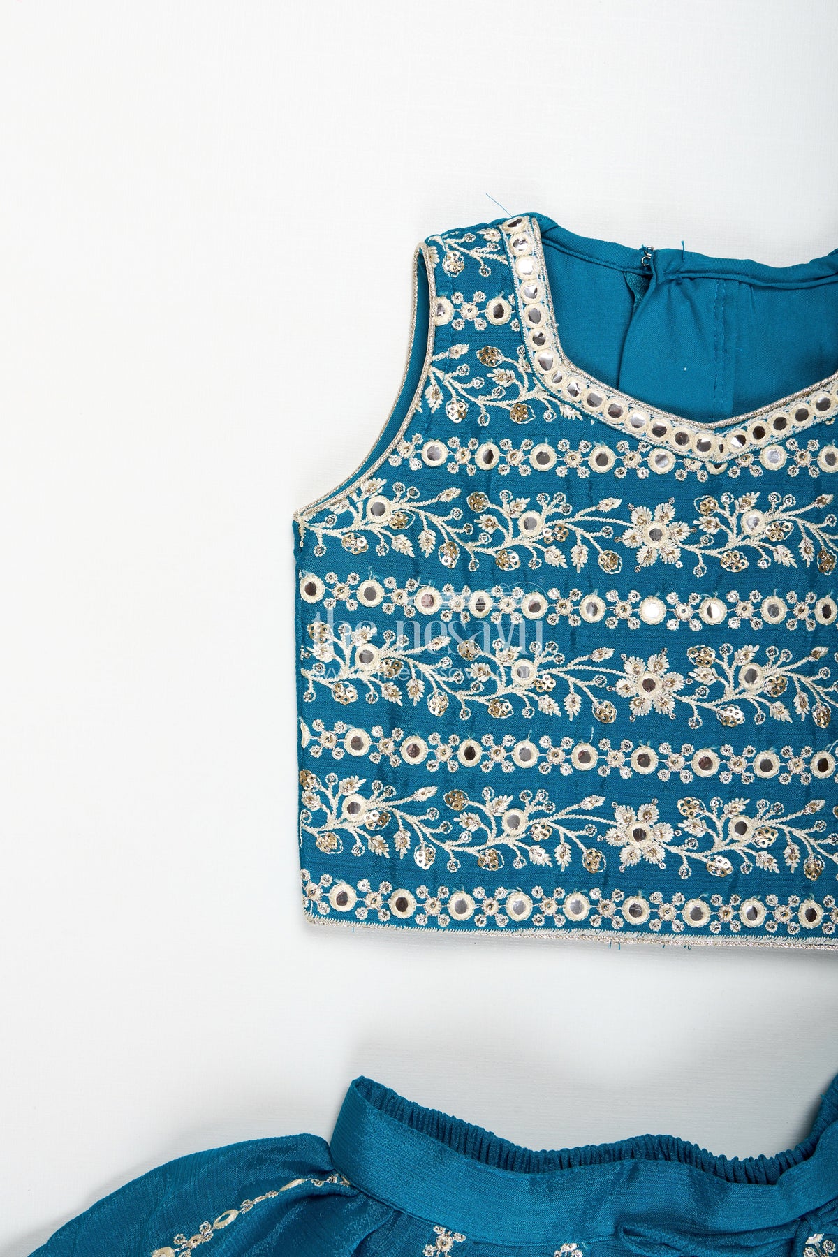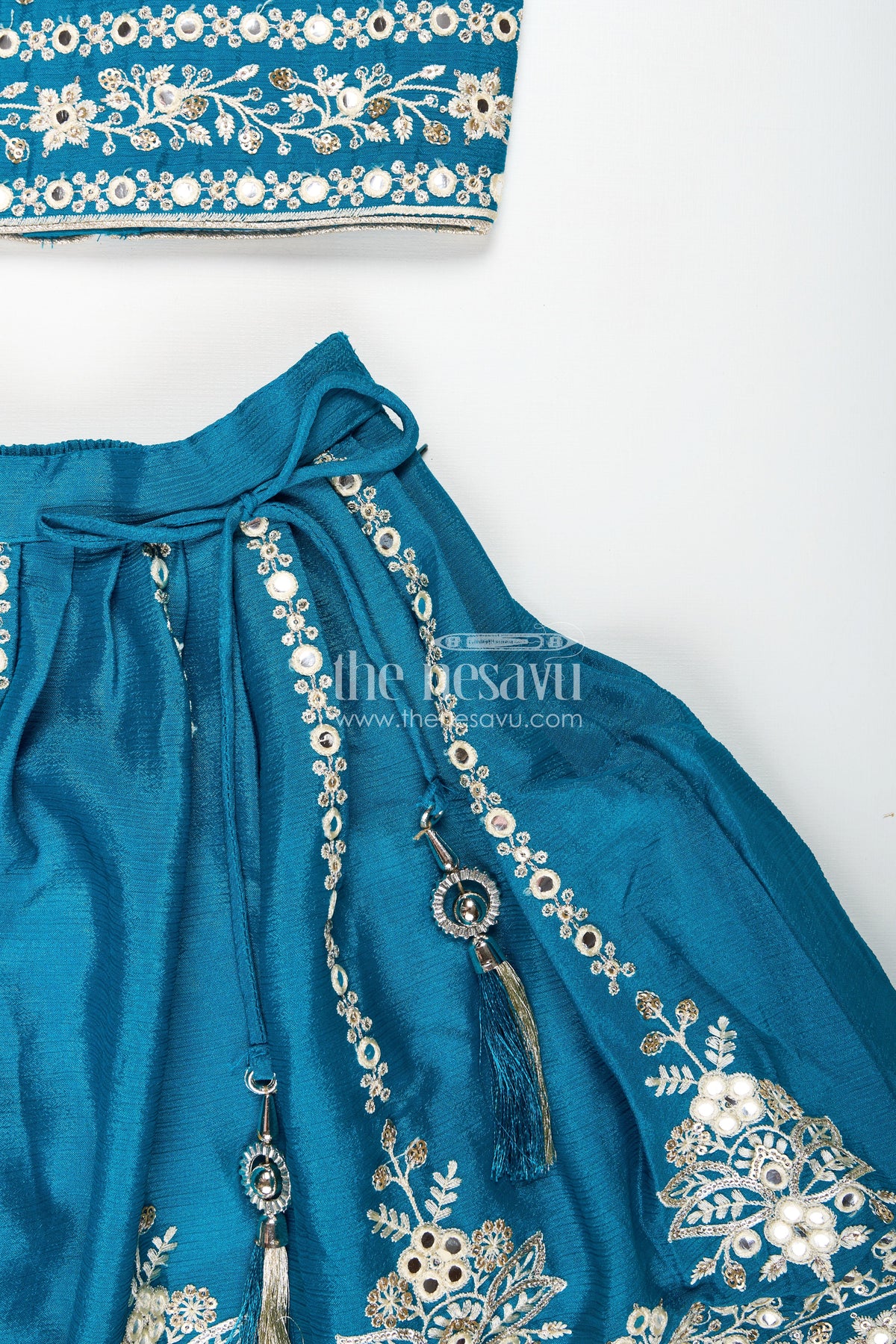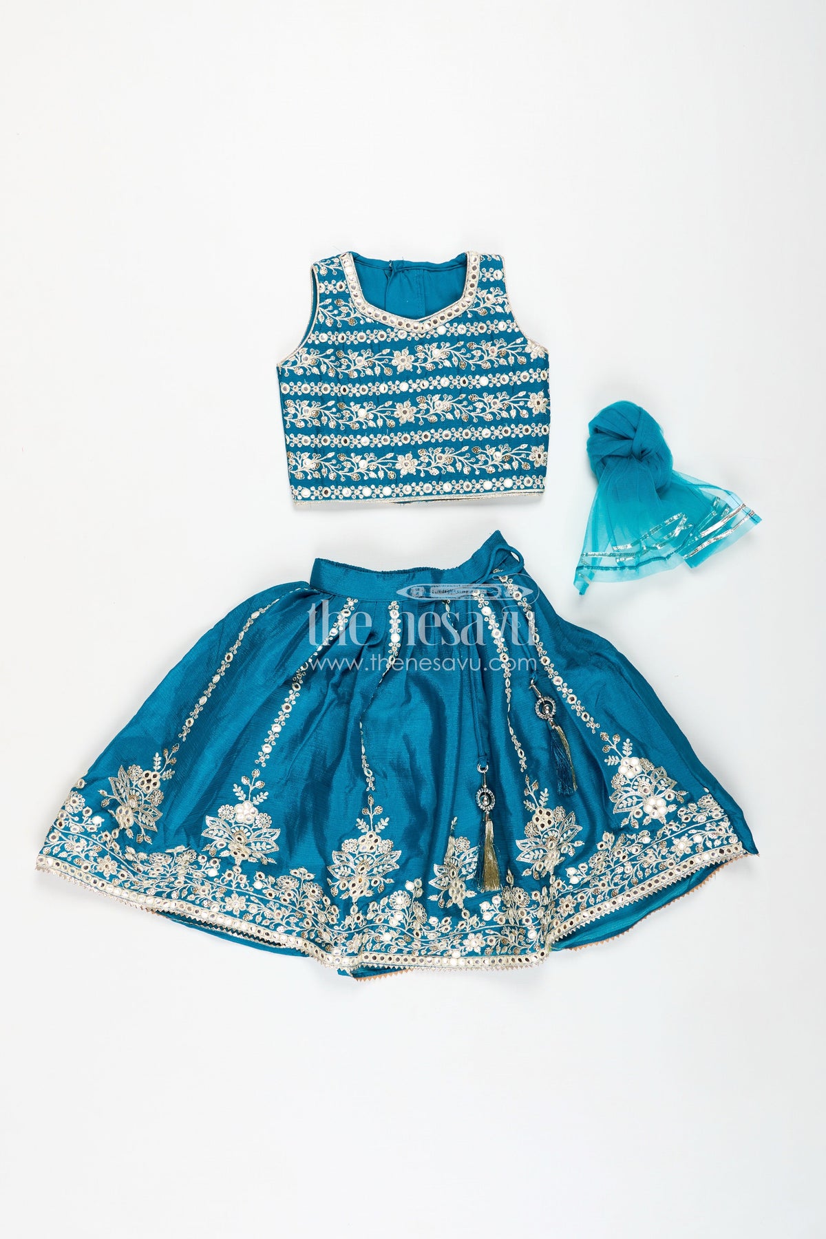 Lehenga for girls parties is an exquisite teal ensemble crafted from luxurious chinon silk. The flared lehenga skirt is adorned with ornate thread and sequin embroidery at the hemline, complemented by a matching blouse richly decorated with pearl and threadwork. This designer outfit includes a coordinating dupatta with border detailing that elevates its festive charm. The soft fabric ensures comfort, while the elegant structure makes it a standout choice for weddings, receptions, or festive celebrations. With premium finishing and intricate craftsmanship, this set blends classic style with contemporary fashion - giving your little girl a royal feel with every twirl.
