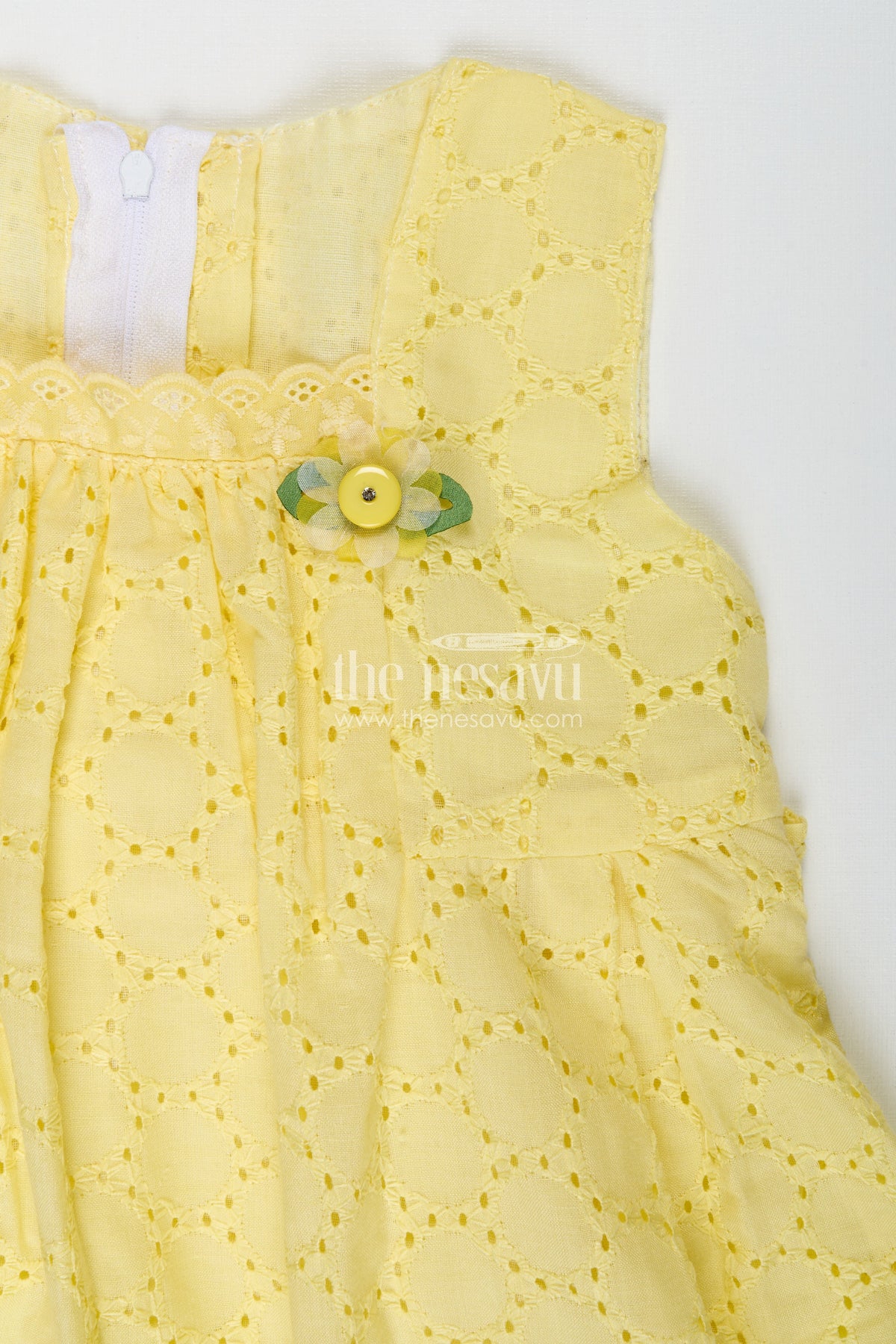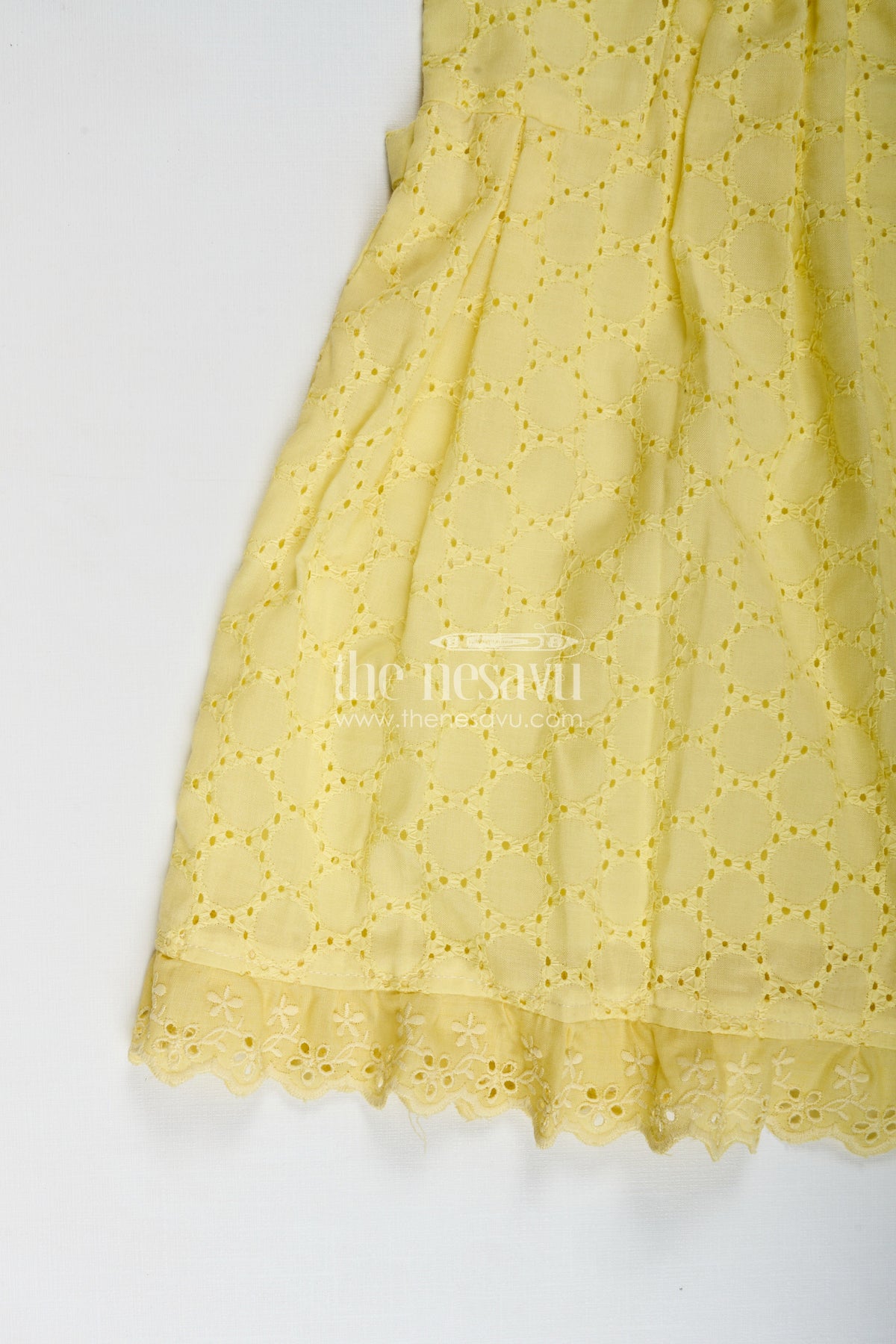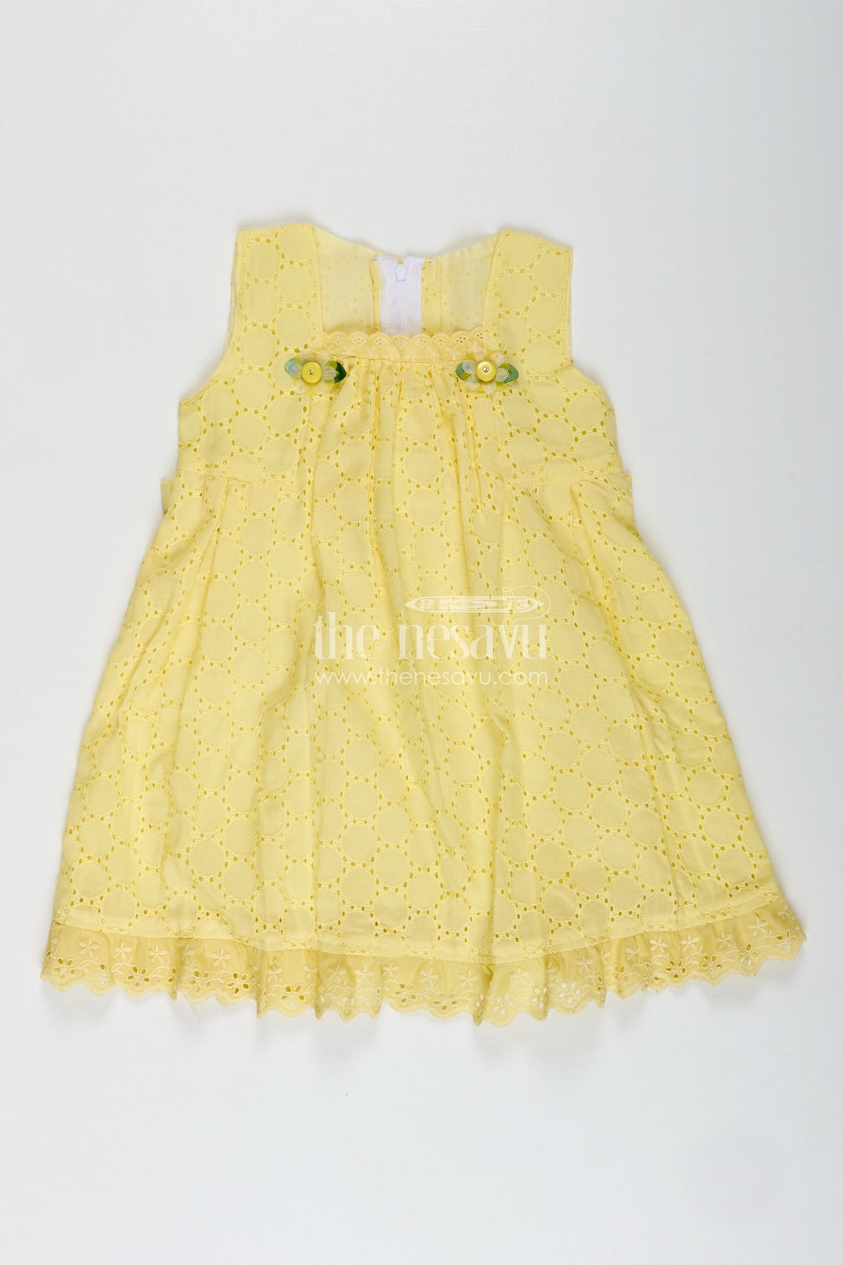 Lightweight Cotton Frock for Girls is a sunny and cheerful addition to any young wardrobe. Made from breathable Hakoba cotton, this sleeveless frock features intricate floral eyelets that create a delicate, airy texture ideal for warm weather. The vibrant yellow hue adds brightness and joy to the design, while pleats on the bodice and subtle floral button embellishments enhance its girlish charm. The scalloped hem with embroidered edgework provides a graceful finish, making it a standout piece. The back zip closure ensures easy wearability, and the fabric is gentle on the skin, perfect for everyday adventures. This dress offers effortless style and all-day comfort for your little one.