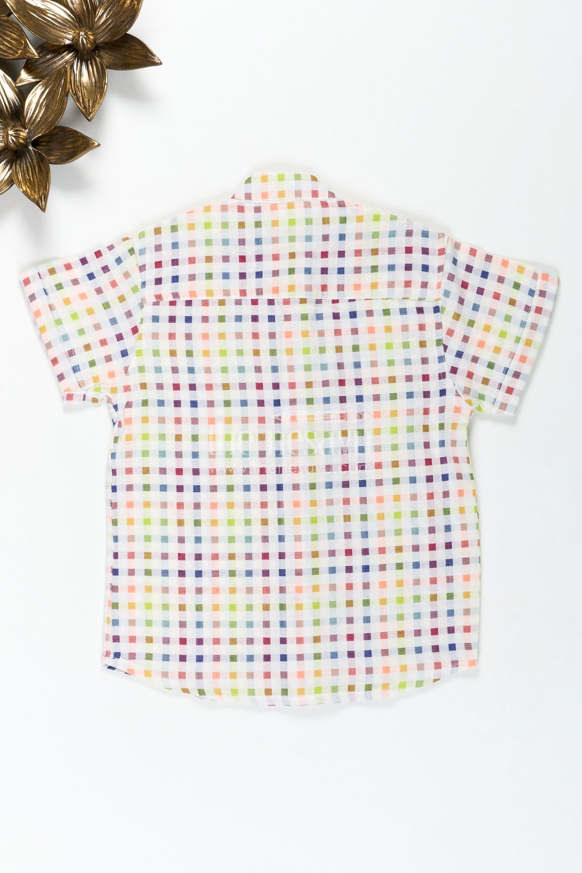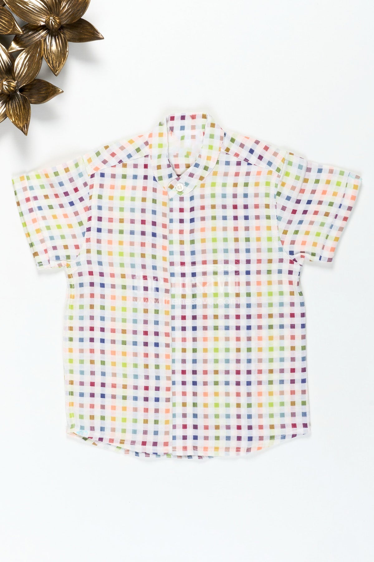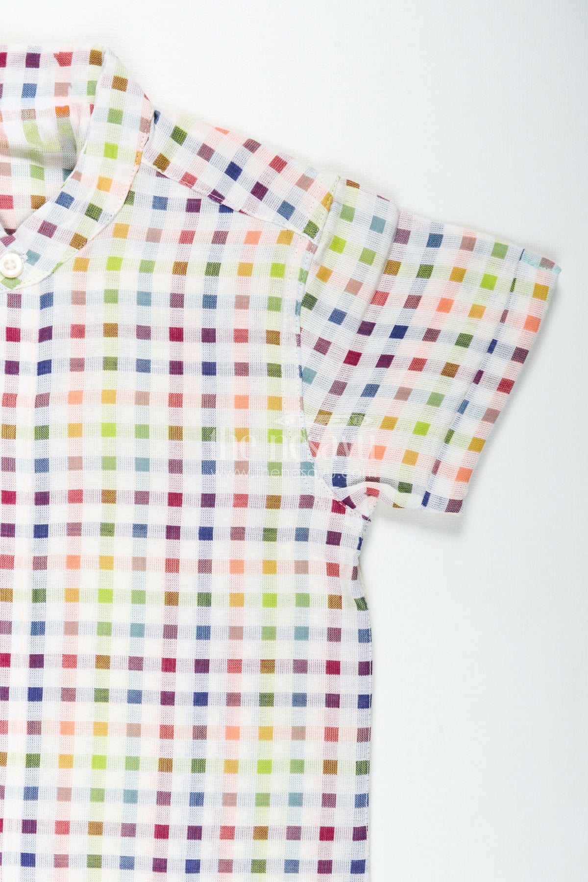 Multicolour Shirt for Boys is a cheerful and breezy choice for warm days. Made from ultra-soft muslin cotton, this shirt ensures complete comfort for kids who love to move freely. The shirt features a vibrant grid pattern with shades of green, orange, purple, and red—creating a fun and eye-catching look. The lightweight weave offers breathability and keeps your child cool all day long. With a classic collar and short sleeves, it is perfect for school, casual outings, or playdates. Easy to pair with jeans or shorts, this shirt is a colourful essential for a lively wardrobe.