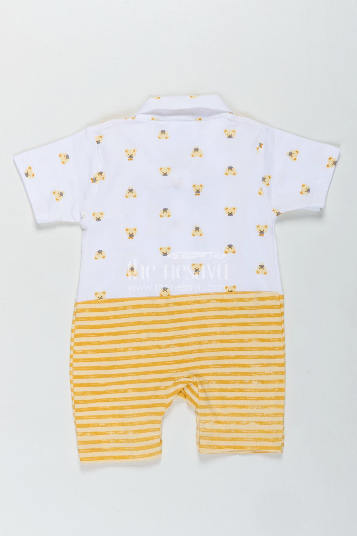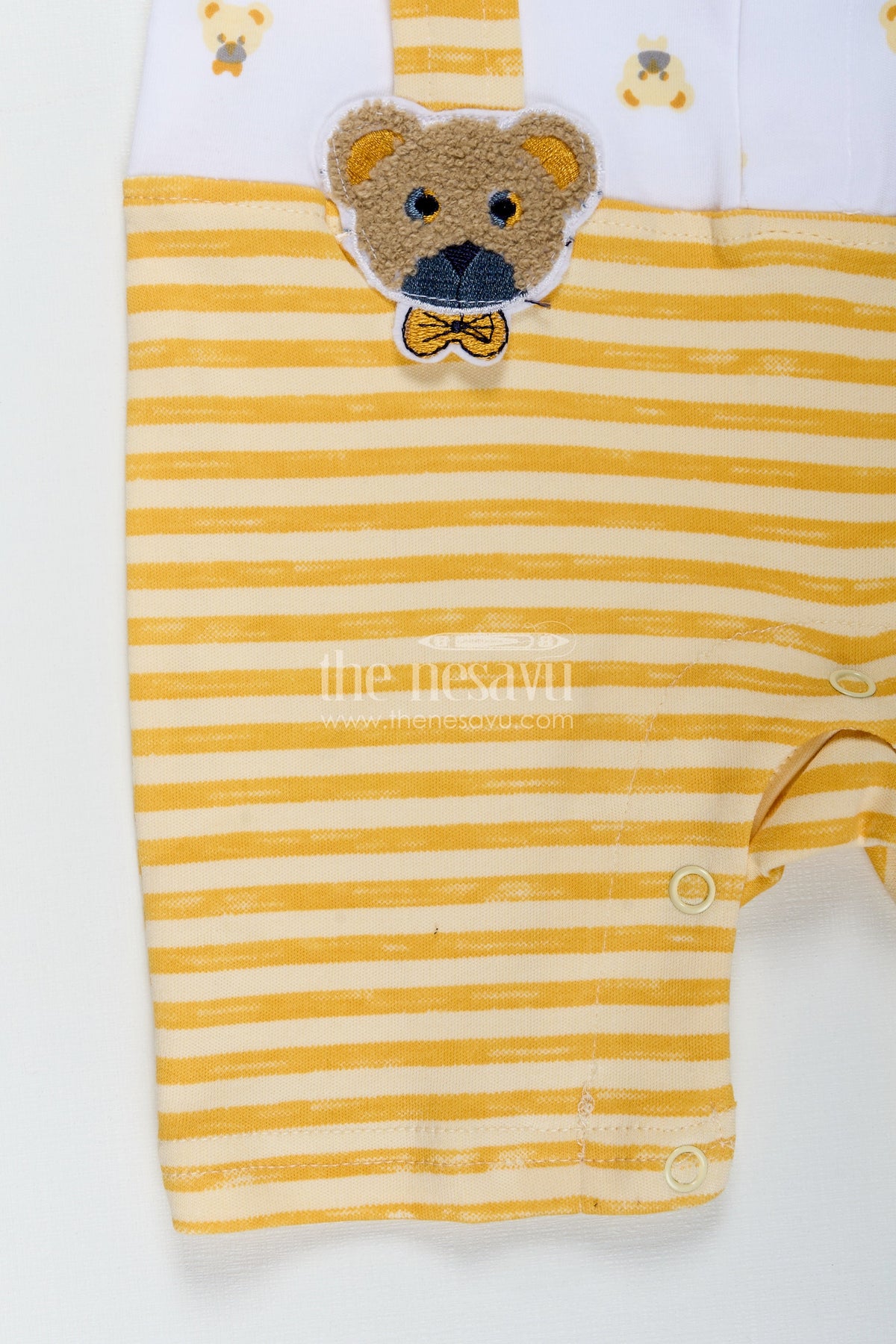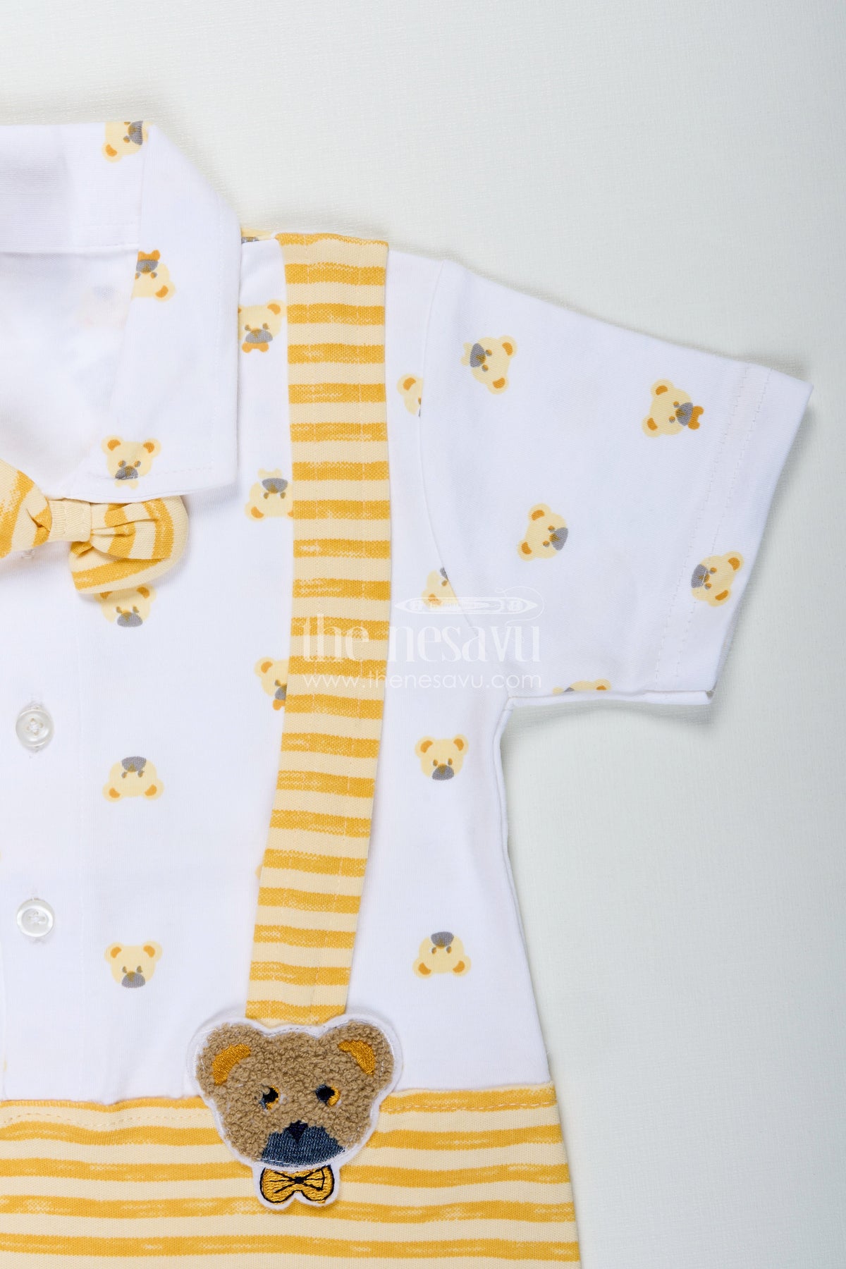 Dress your little one in charming style with this newborn boy romper for party by Nesavu. Crafted from soft, breathable knitted cotton jersey with all over print, this romper is designed for maximum comfort and irresistible cuteness. The white top is printed with adorable bear faces, while the yellow striped bottom features playful faux suspenders with 3D bear face patches for a fun twist. The attached yellow striped bow tie adds a dash of sophistication, making it perfect for baby parties, birthdays, or family photos. Snap-button closures at the bottom ensure easy diaper changes, while the collared shirt design gives a smart, dressed-up appearance. This romper is the ideal balance between style and practicality for newborn boys ready to shine on special occasions.