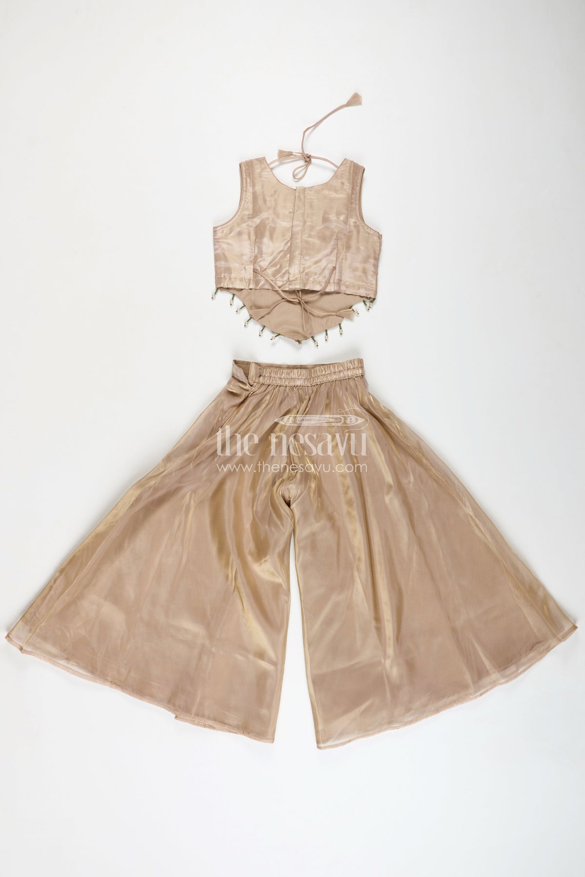 Palazzo Set for Girls is a regal ensemble designed to elevate your little one’s ethnic wear game. Featuring a richly embroidered crop top adorned with colorful sequins, beads, and mirror work, this outfit delivers a luxurious aesthetic with playful flair. Made from glazed organza, the fabric offers a subtle sheen and a structured yet lightweight feel that’s comfortable for long wear. The flared palazzo pants ensure ease of movement, while the matching sheer dupatta with tassel accents adds a festive touch. The crop top’s structured silhouette and tie-up back ensure a snug fit, and the embroidery showcases intricate craftsmanship. Ideal for cultural events, celebrations, or family gatherings, this set brings together traditional artistry and contemporary comfort for girls who love to stand out.