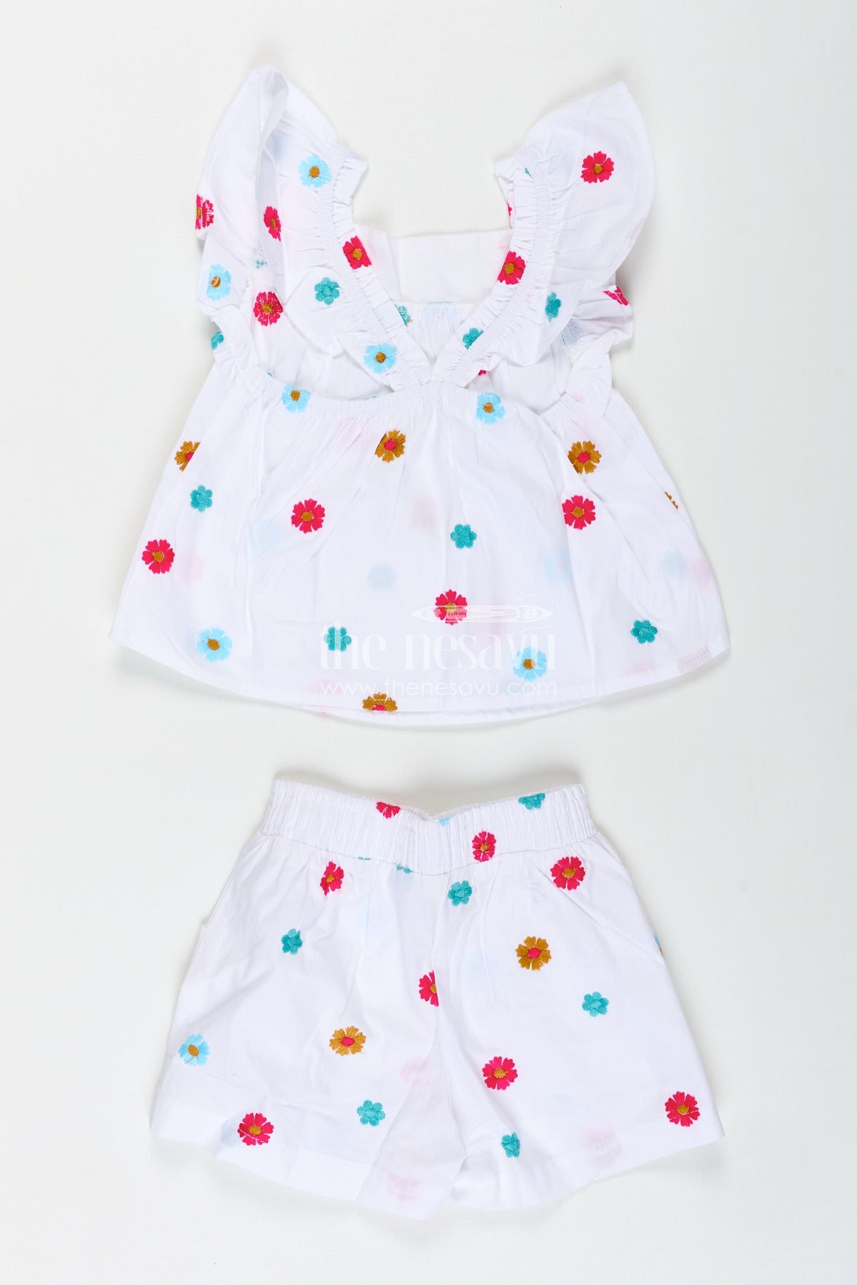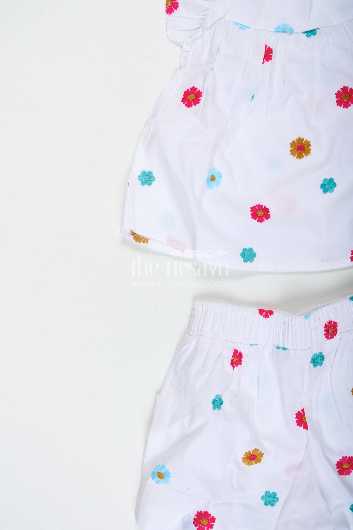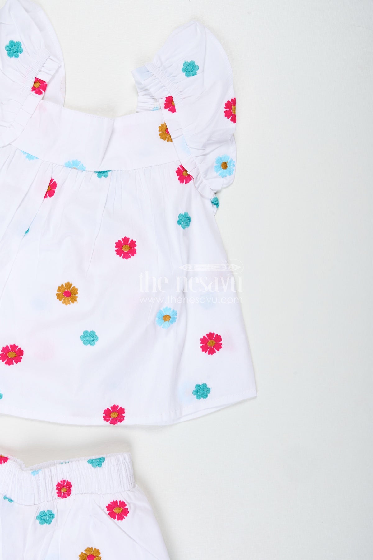 Playful cotton outfit for baby girl with colorful detailing is a charming ensemble designed for style and comfort. Made from soft white cotton with vibrant thread embroidery, this sleeveless top-and-shorts set features eye-catching pom-poms and a breezy cut for maximum airflow. The top has a gentle flare with frilled shoulders, and the shorts come with an elastic waistband for easy dressing. Whether for a playdate or a day out, this set brings together fun design and practical wear in one adorable package.