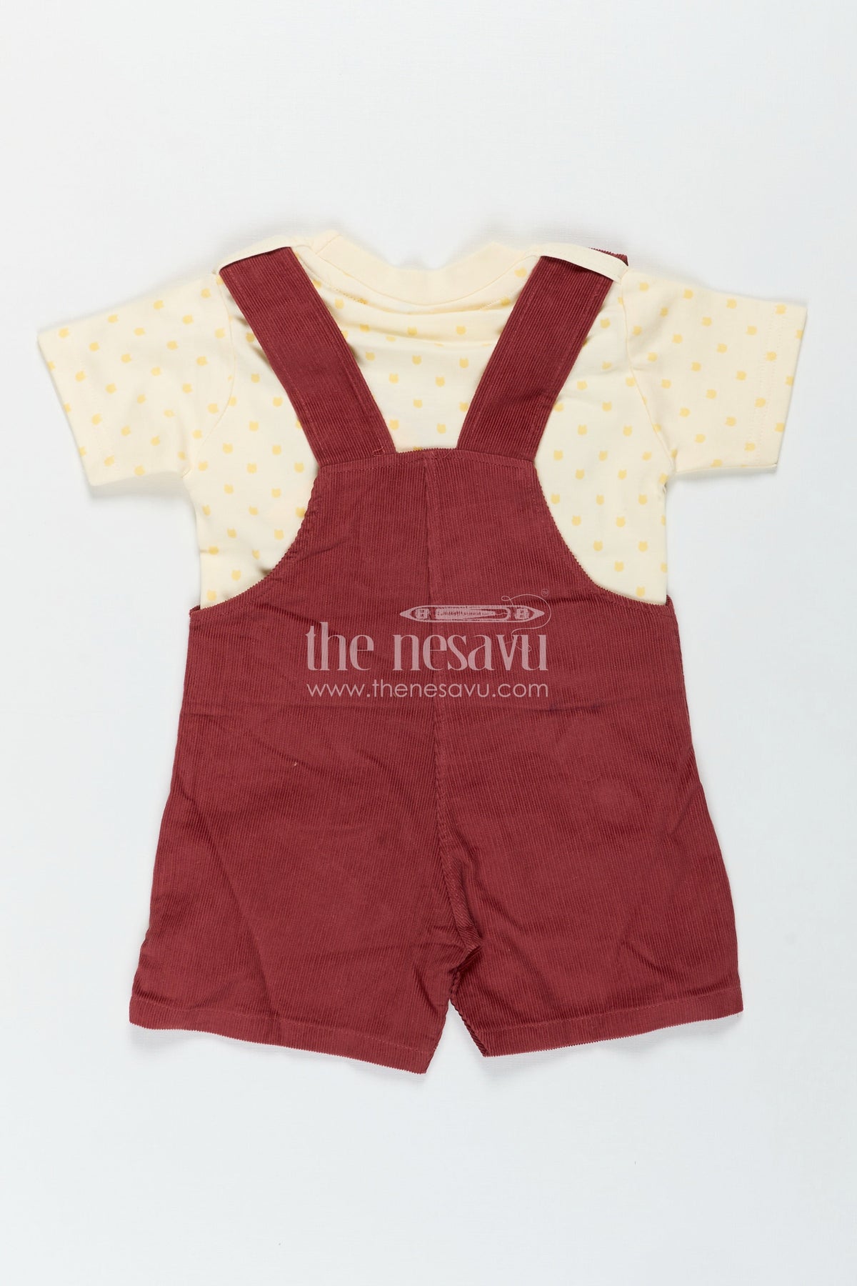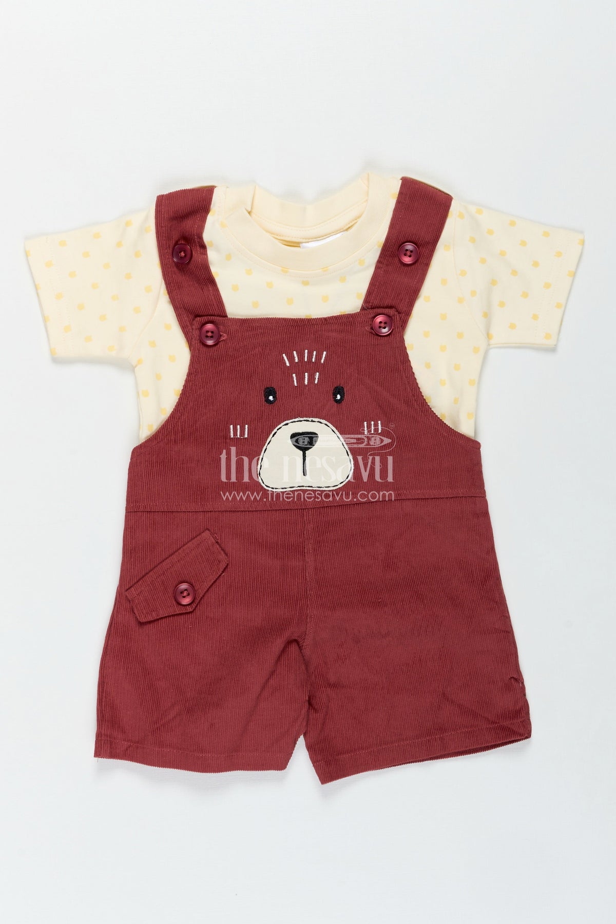 Add charm and cheer to your child's wardrobe with this playful toddler dress from Nesavu. This set features a pale yellow polka-dotted cotton jersey T-shirt and rust-toned corduroy dungarees embroidered with an endearing bear face. The overall design offers practicality with a buttoned pocket detail and adjustable shoulder straps for the perfect fit. Crafted from soft, breathable fabrics, it keeps your toddler comfortable during play or rest. The earthy tones, cozy textures, and animal-themed accents make it a delightful pick for casual outings, daycare days, or simply lounging in adorable style.