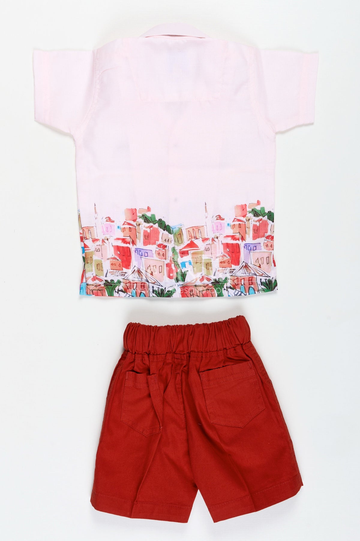 Playful toddler outfit with cute town print design brings joyful charm to your little one's daily wardrobe. The cotton shirt, adorned with an adorable digital townscape print in cheerful colors, creates a storybook-like appeal that's sure to delight both kids and parents. Paired with deep red shorts featuring an elastic waist and drawstring, this two-piece set offers both style and flexibility for all-day movement. Made from breathable cotton fabric with a soft texture, it's gentle on sensitive skin and perfect for active toddlers exploring their world in comfort and color.