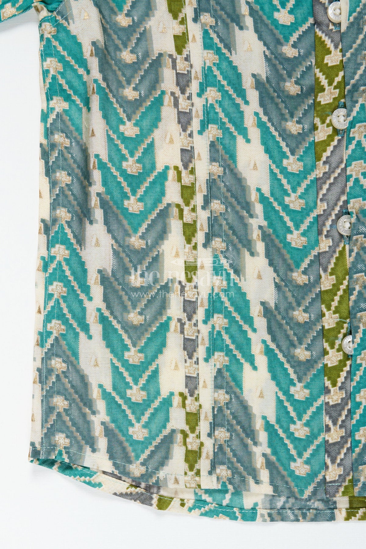 Printed casual shirt for baby boys is designed for effortless everyday style with a playful yet trendy twist. Made from lightweight modal silk with digital print, this shirt ensures breathability and all-day comfort for your little one. The design features an eye-catching chevron arrow pattern in shades of green, teal, and grey, adding a dynamic touch to your child’s wardrobe. With short sleeves, a crisp collar, and a neat button-down front, this shirt is ideal for casual outings, playdates, or relaxed family events. The silky finish and soft texture offer maximum ease, making it suitable even for toddlers with sensitive skin. Perfect for warm days, this shirt pairs well with denim or shorts, offering versatility and timeless charm in every wear.