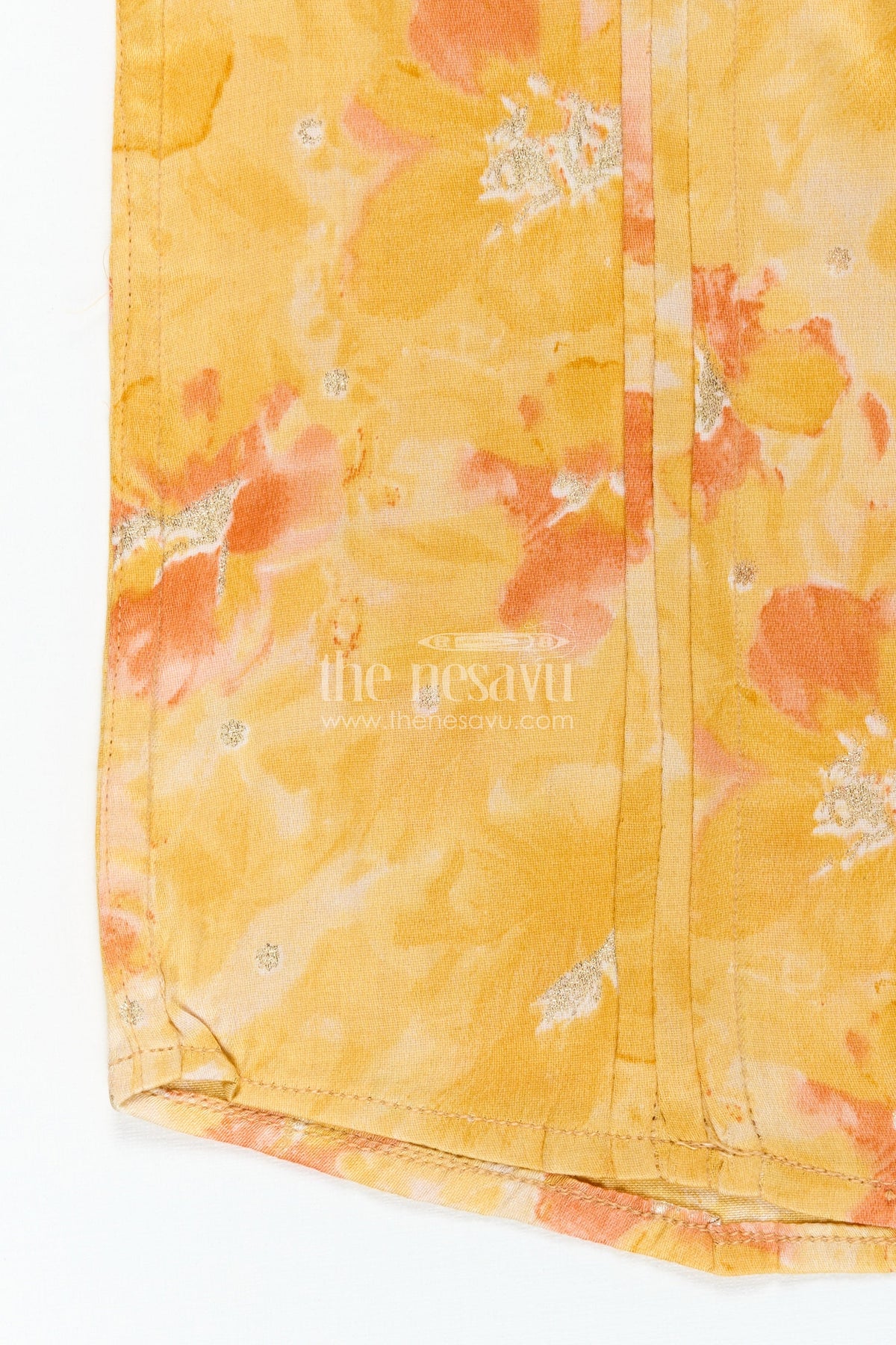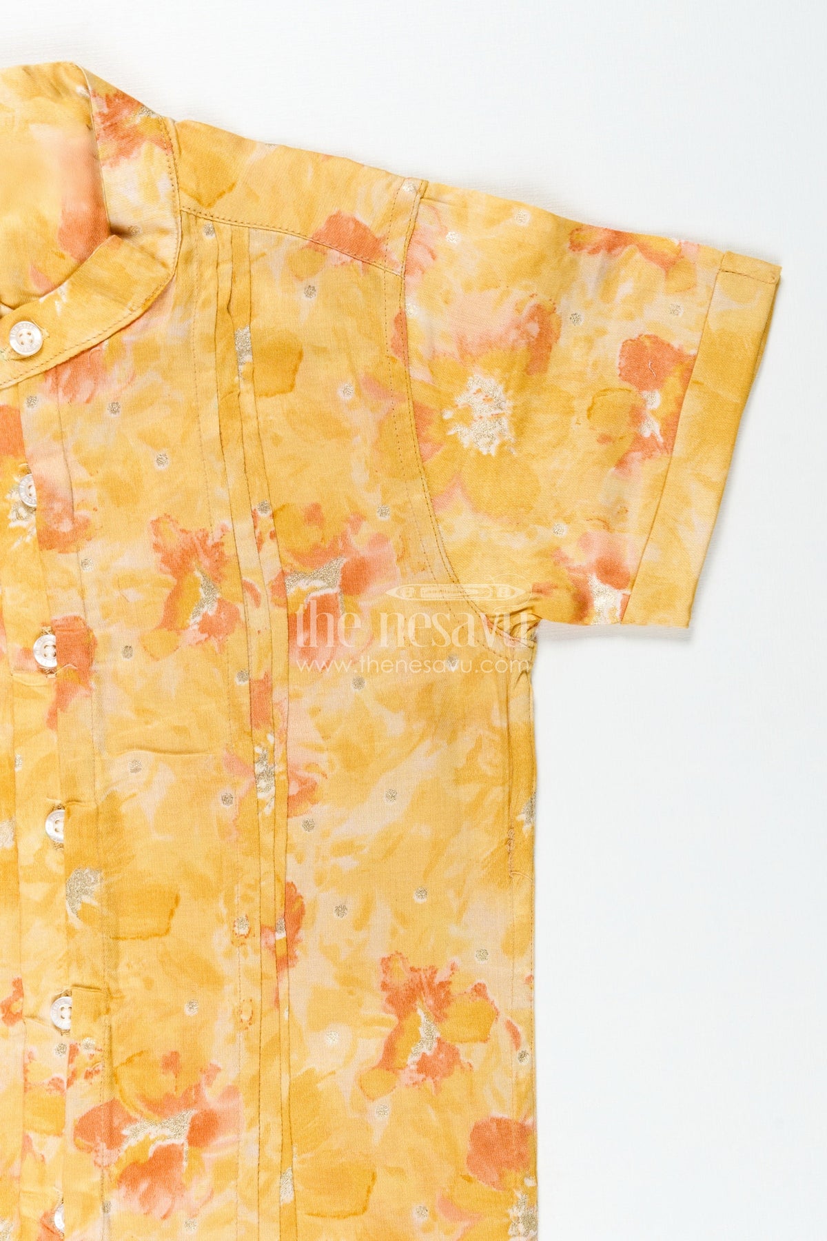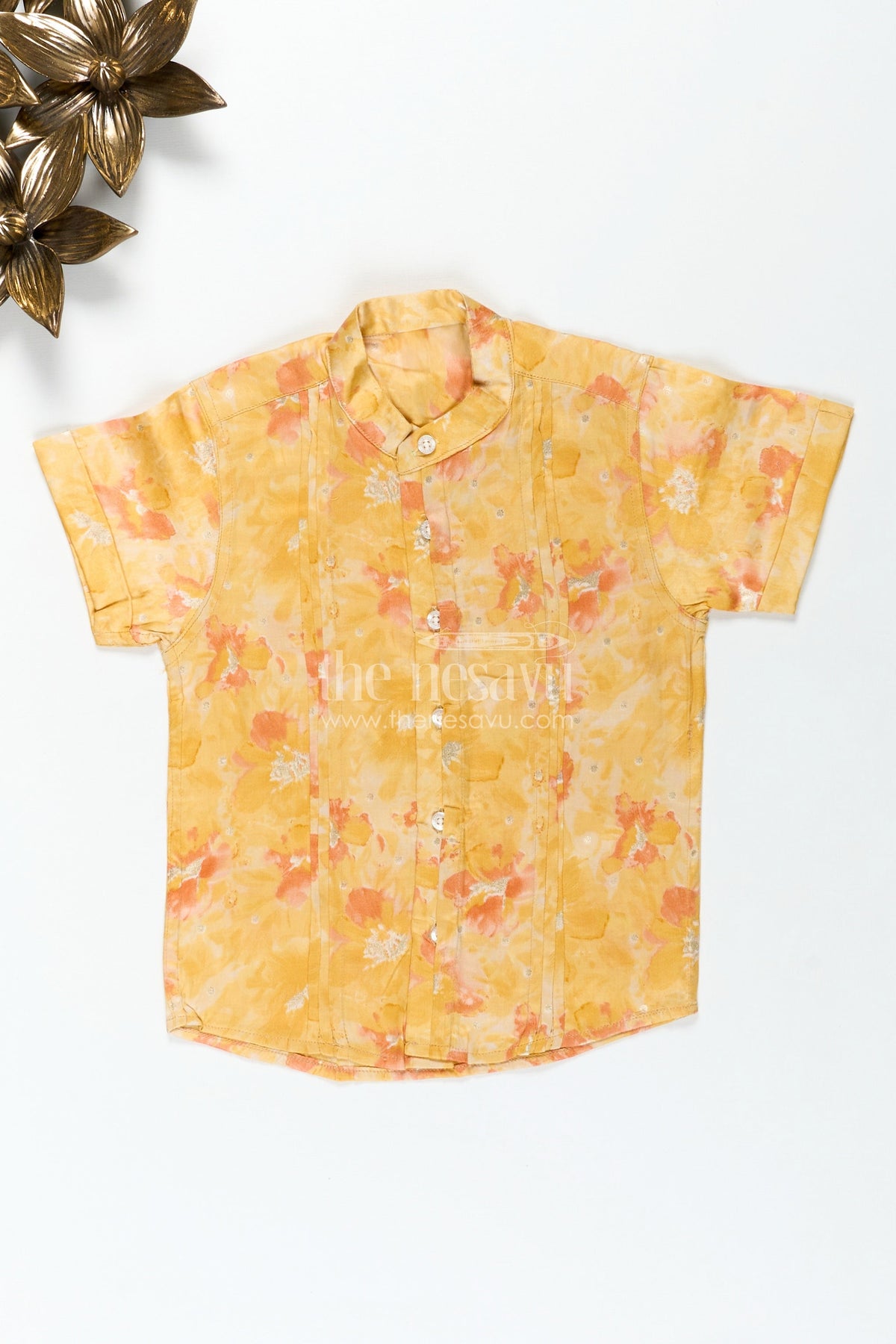 Printed Cotton Shirt for Kids adds a playful yet refined touch to any young boy’s wardrobe. Made from smooth moadal silk with digital print, this shirt is both soft and breathable—perfect for active kids. The vibrant yellow base is accentuated with abstract floral patterns in shades of coral and ivory, giving it a cheerful and summery vibe. The mandarin collar and front button closure add a traditional yet trendy look. Lightweight and easy to care for, this shirt offers both comfort and charm, making it a great choice for casual outings, get-togethers, or festive events. It pairs effortlessly with both jeans and traditional bottoms, offering great styling versatility.