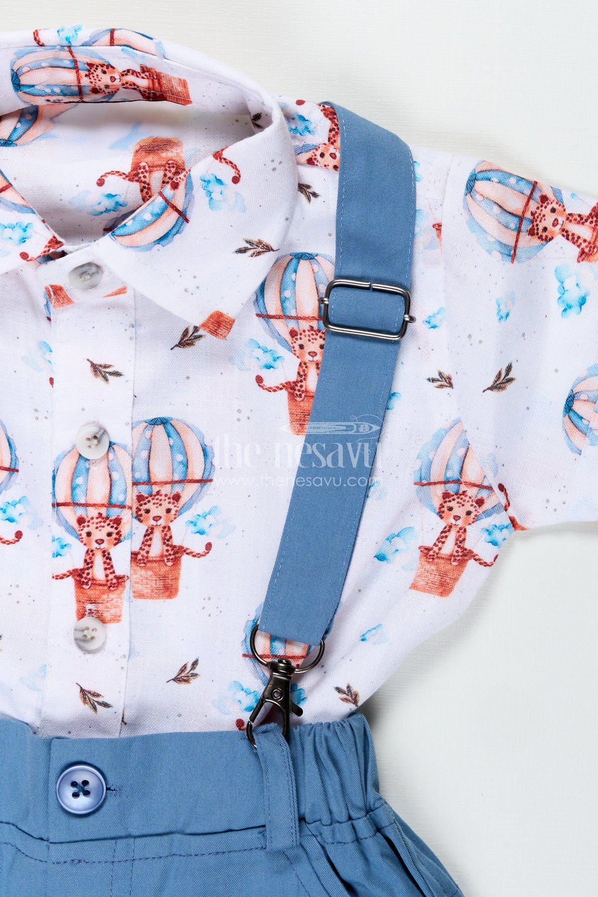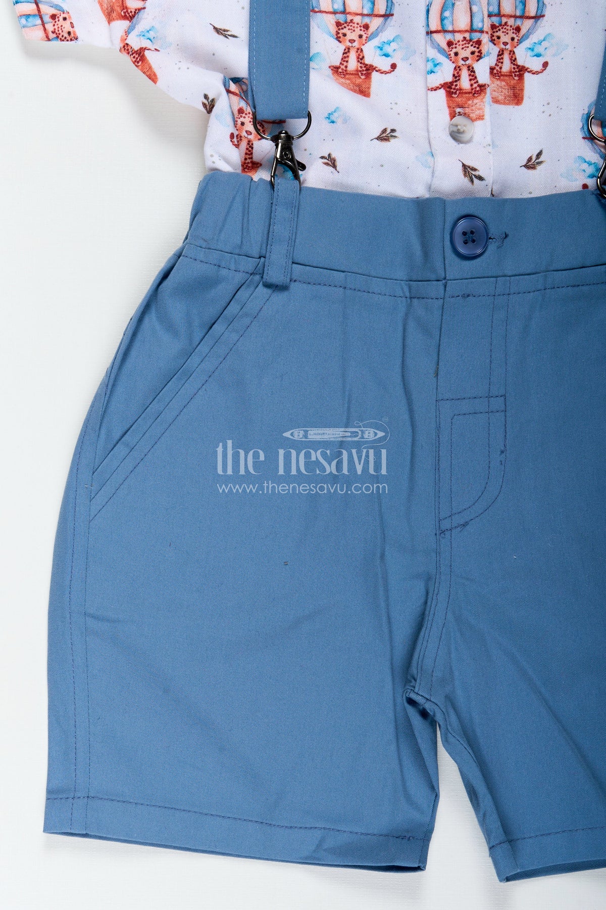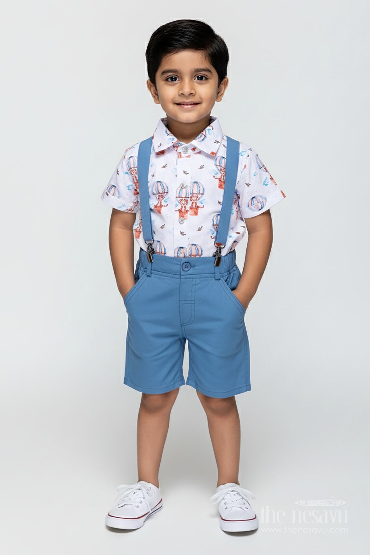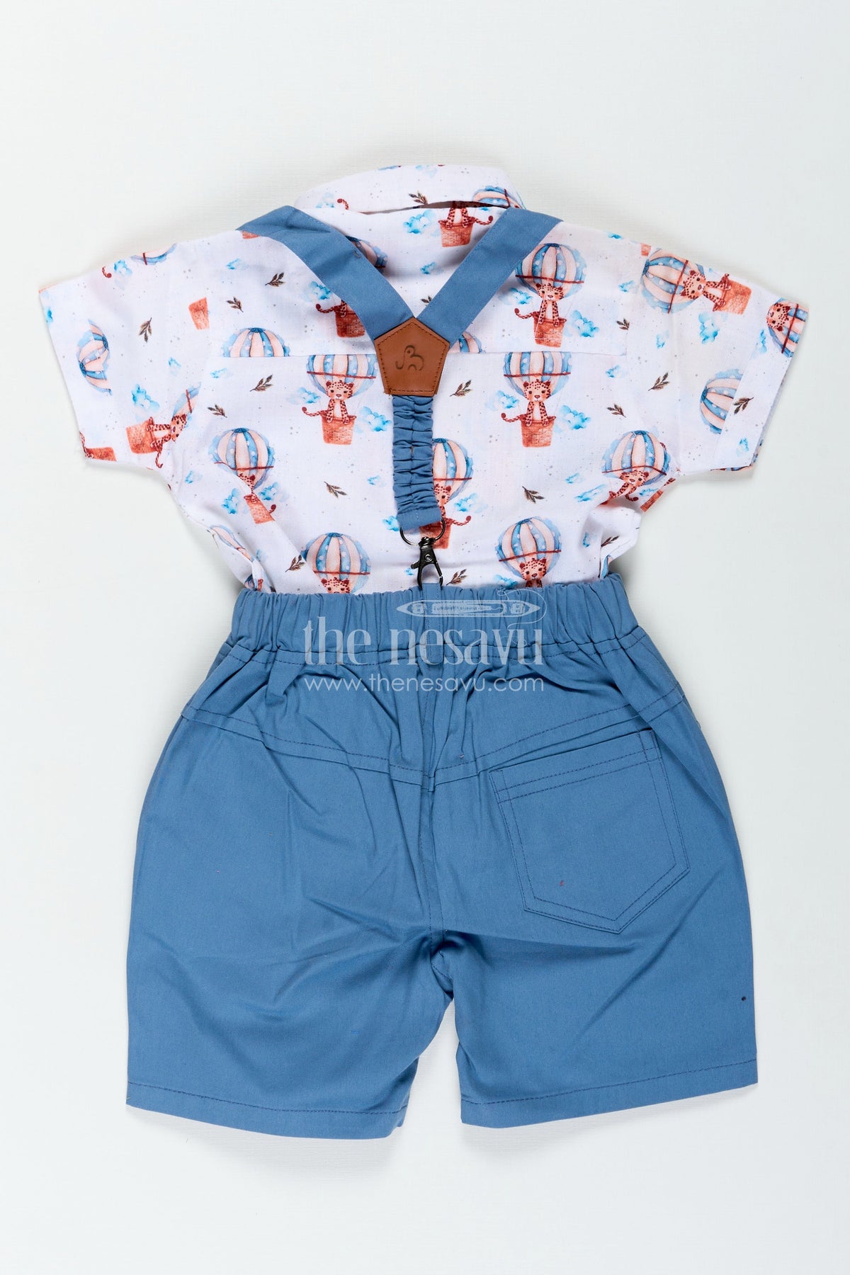 The printed shirt and shorts set from Nesavu brings playful charm and cool comfort to your little boy’s everyday look. Featuring a vibrant digital print of hot air balloons on a white base, the short-sleeve shirt is designed to delight kids with its fun and imaginative pattern. Complemented by a pair of soft blue shorts and a matching detachable bow tie, this outfit is perfect for sunny days, birthdays, or casual outings. Made from breathable cotton with digital print, it ensures freedom of movement while keeping your child comfortable. The shirt’s button-down style and tailored finish add a smart touch, while the elastic waistband on the shorts allows for an adjustable fit. This two-piece set is a practical yet eye-catching addition to your child's summer wardrobe.