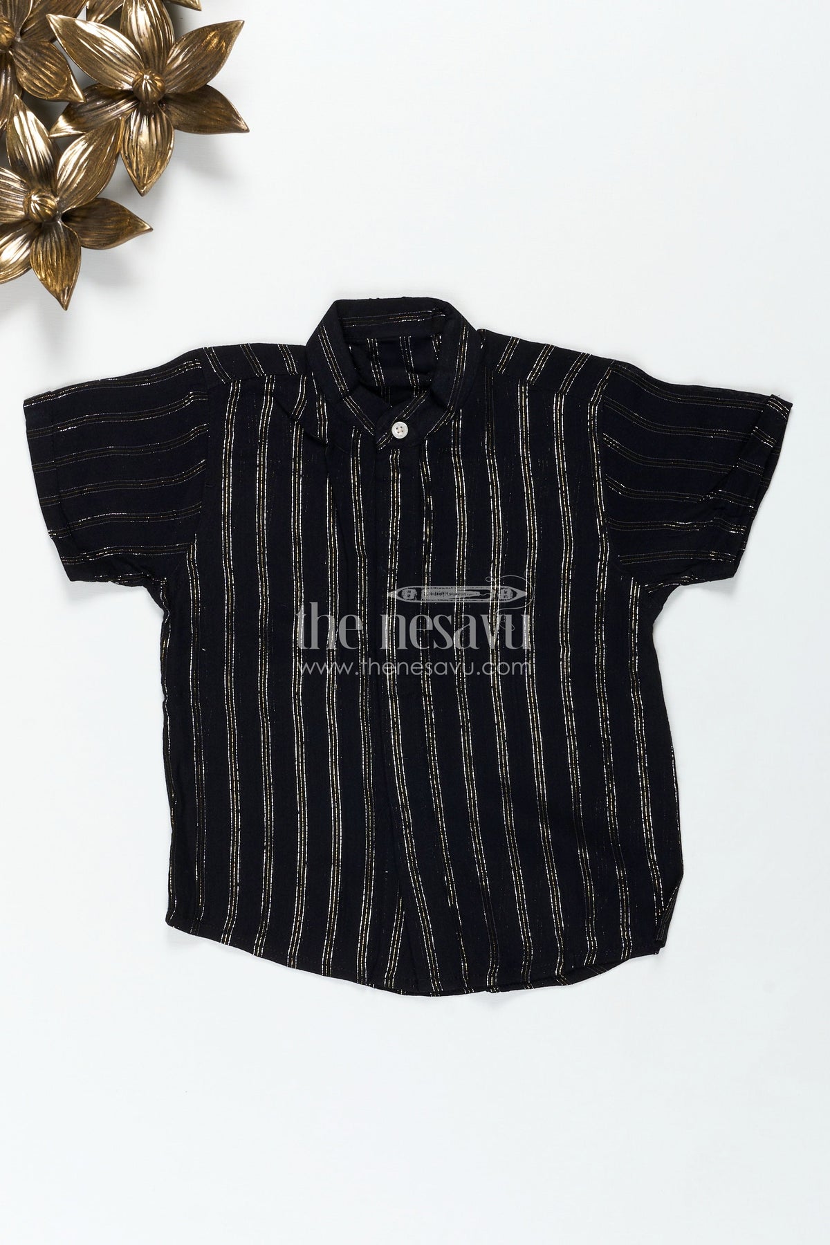 Striped Kidswear Shirt delivers refined fashion with a playful edge. This elegant black shirt is made from a soft semi silk blend, featuring gold-toned vertical stripes that add a sense of height and sleekness. The structured silhouette is complemented by a neat mandarin collar and short sleeves—ideal for festive or formal looks. Lightweight and gentle on the skin, this shirt offers a breathable fit while keeping kids stylish and well-dressed. Perfect for pairing with trousers or ethnic bottoms, it’s a versatile piece that balances tradition with trend.
