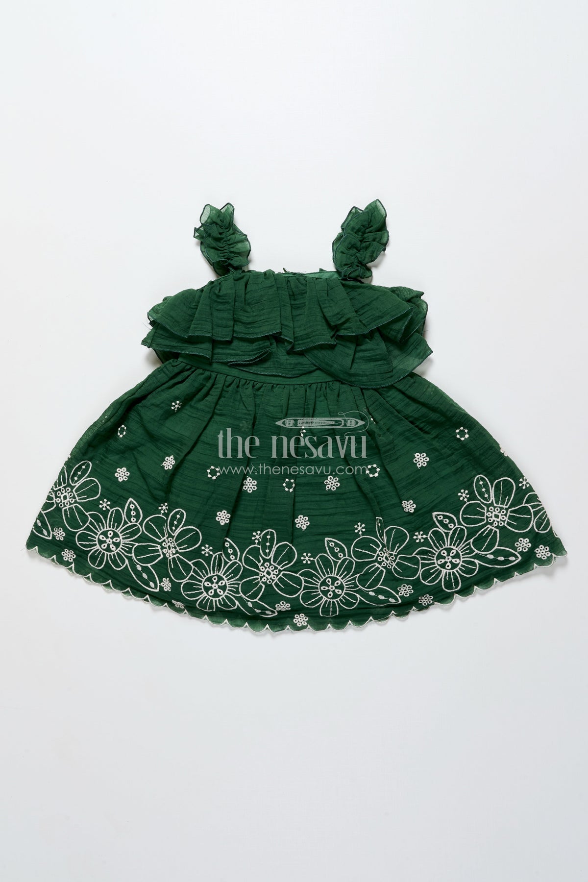 Temple Visit Baby Frock in Traditional Green with Soft Cotton Fabric and Intricate Floral Lace Accents