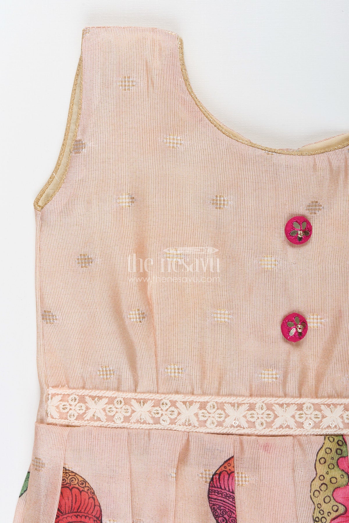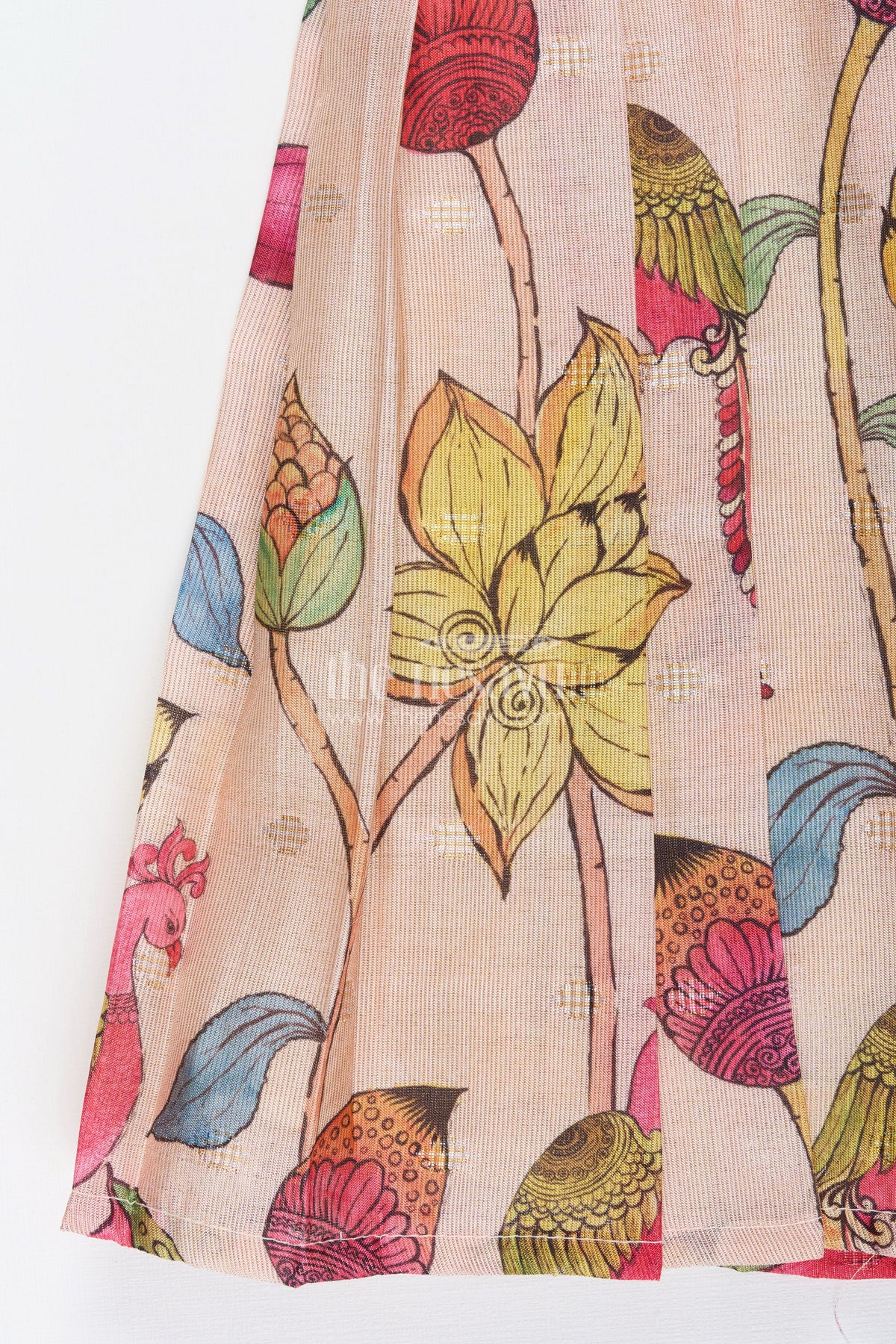 - Top half features zari dotted motifs, while the skirt blooms with bright lotus flower prints