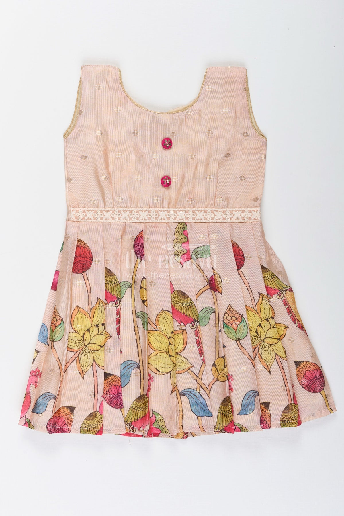 - Sleeveless design with a round neckline and cute pink floral buttons