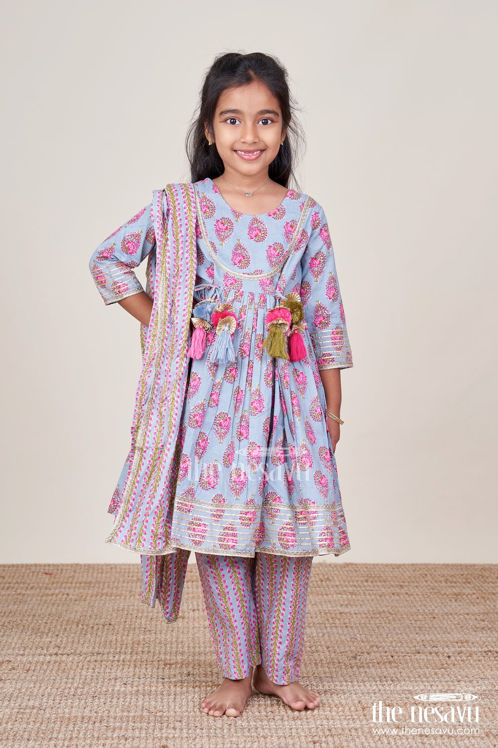 Girls Cotton Kurti Set with Floral Block Print and Festive Tassels