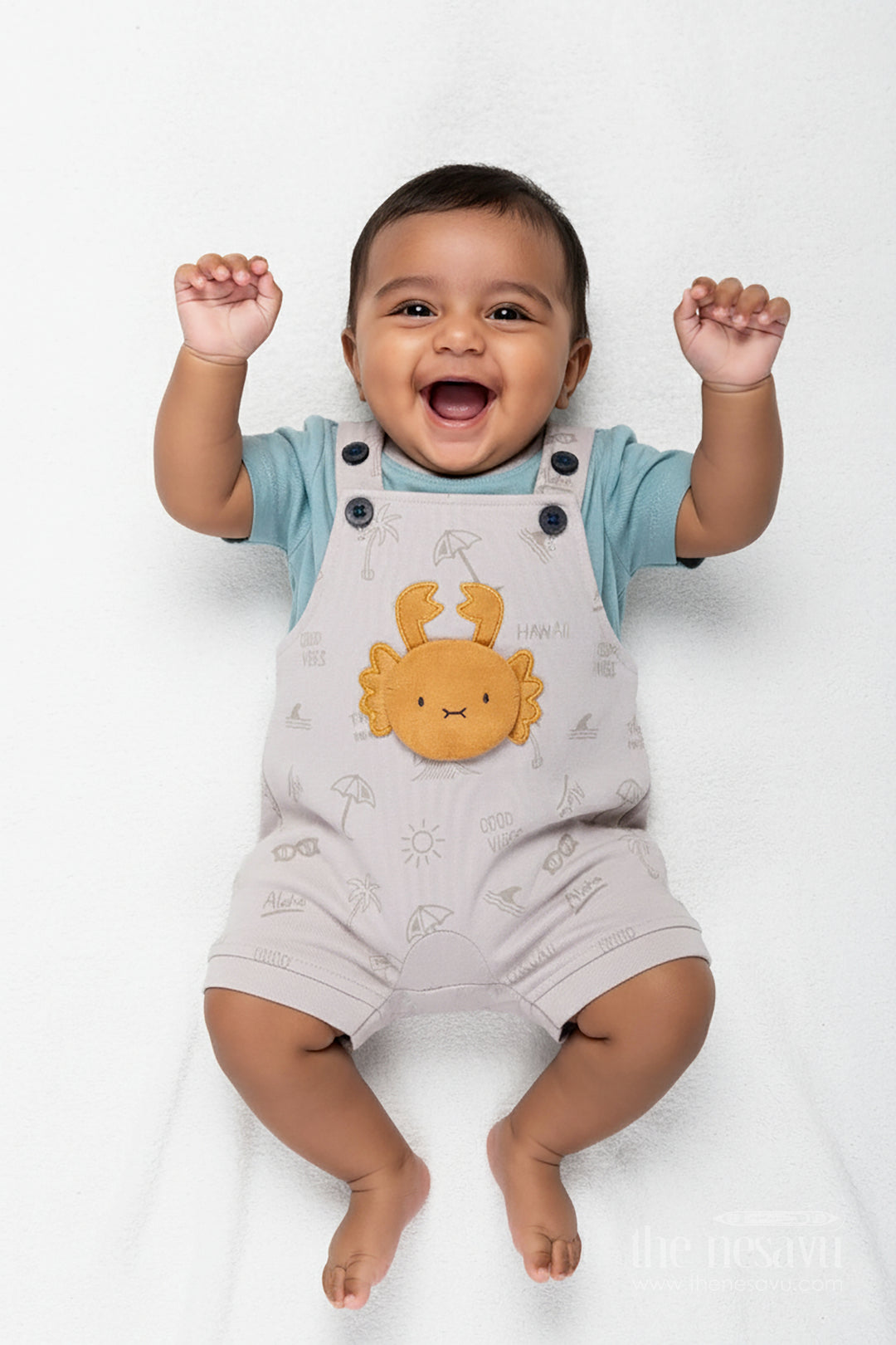 Boys Waffle Shirt and Shorts Set with Mint Green Dungaree and Smiley Face Patch for Playful Comfort