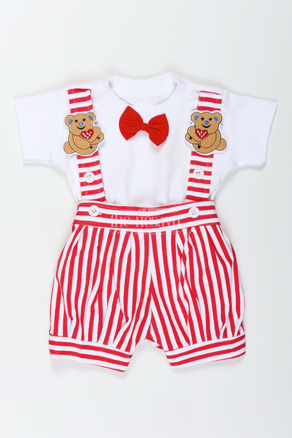 Dress Shirt and Bow for Boys in Cotton with Red Striped Dungaree and Teddy Shoulder Accents