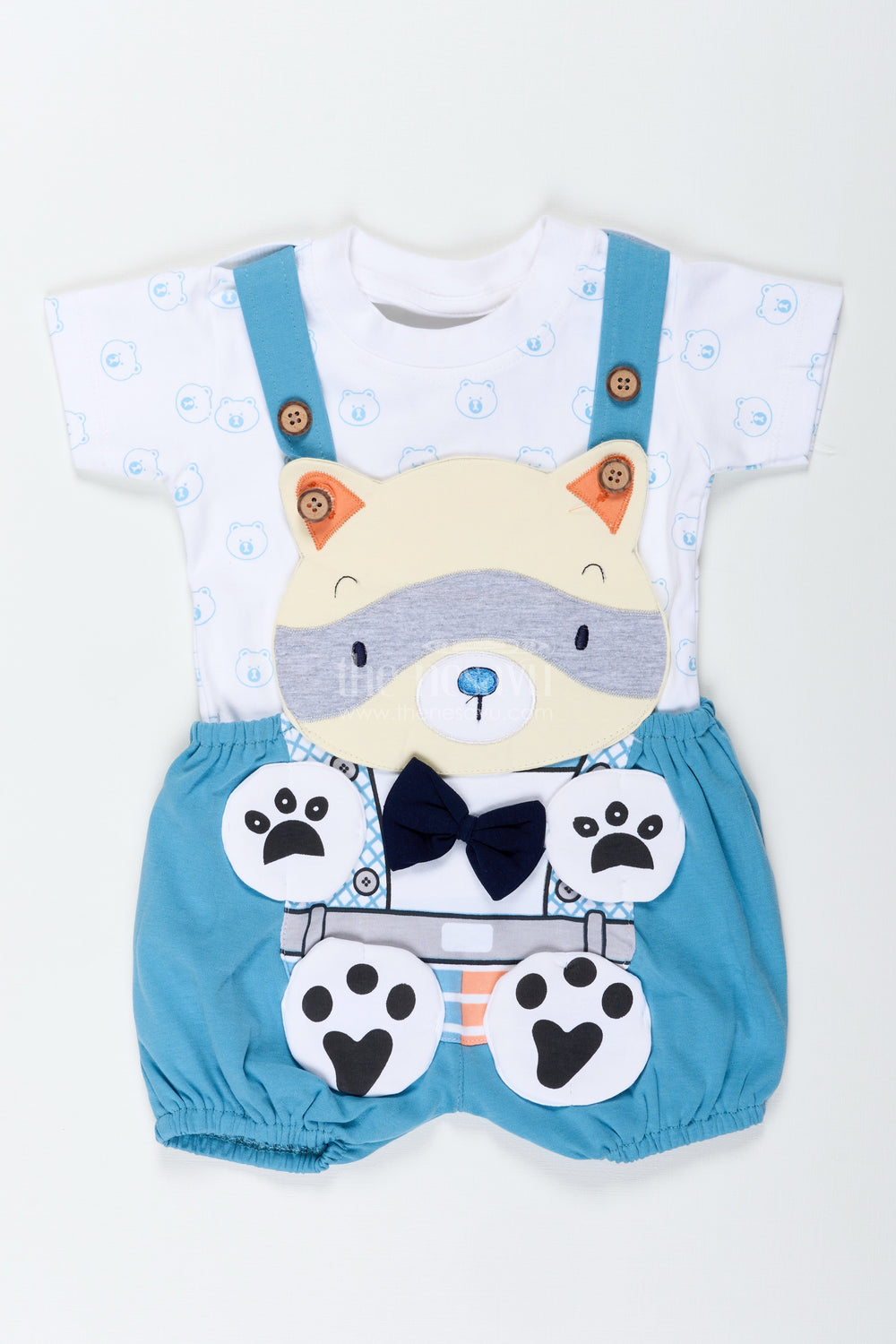 Newborn Teddy Bear Set for Boys in Cotton with Blue Printed Tee and Matching Striped Shorts