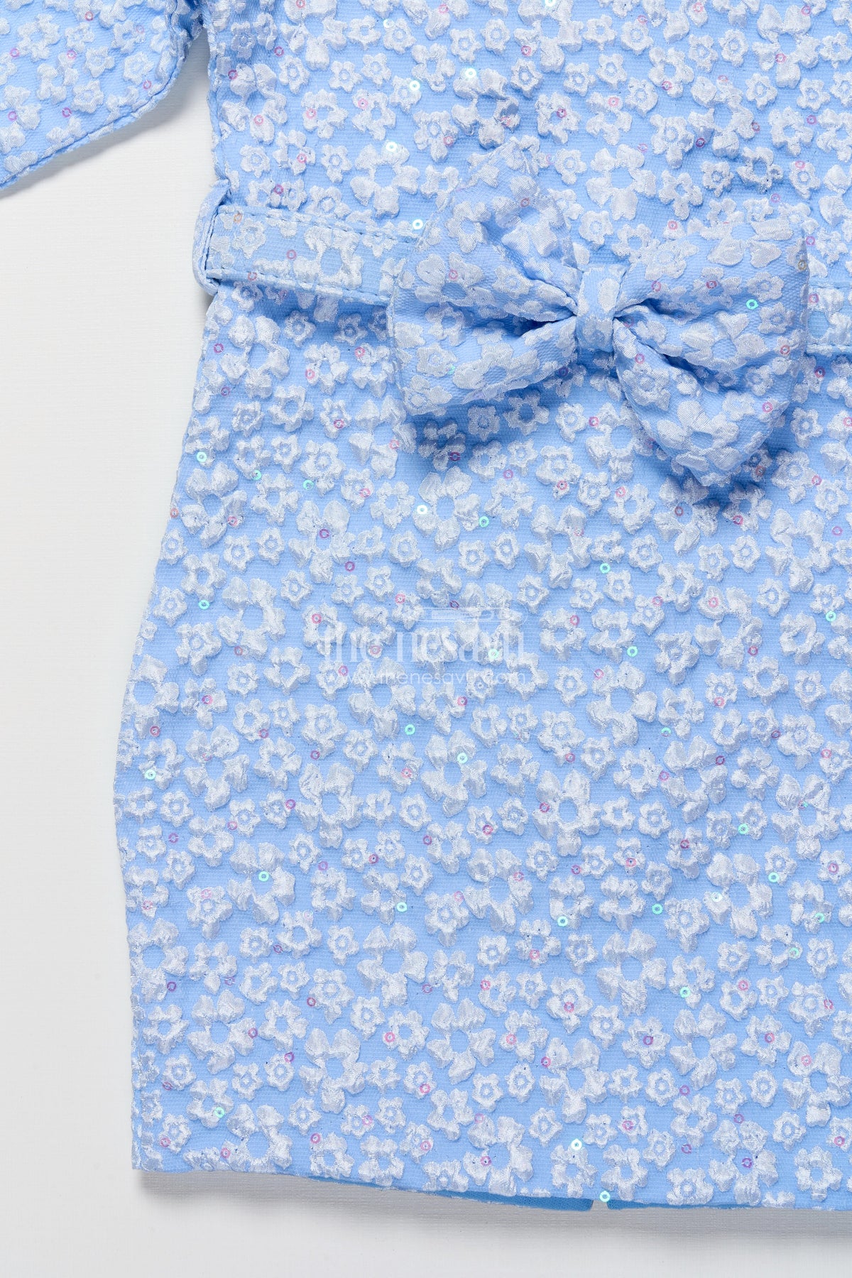 - Design: Floral embossed fabric, waist bow, straight silhouette