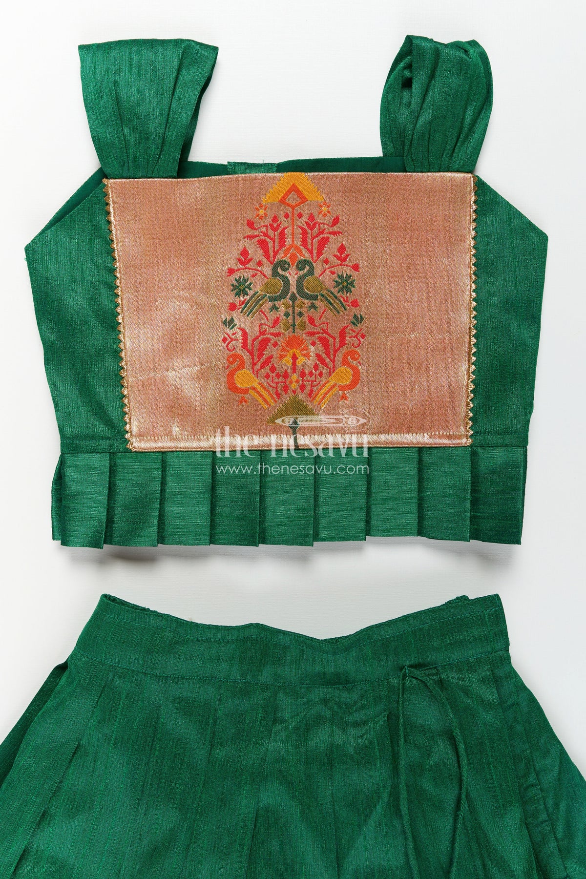 Lehengha pattu brings rich tradition to life in this stunning green pattu pavadai set for girls. Crafted from raw silk, the lehenga features vibrant pleats and a classic paithani border adorned with peacock and floral motifs. The sleeveless blouse is highlighted by a golden yoke embellished with fine embroidery and pleated detailing at the waistline for added flair. Ideal for weddings, cultural functions, or festive celebrations, this set offers regal charm with child-friendly comfort. Its lightweight texture and vivid color make it a standout addition to every young girl’s ethnic wardrobe.