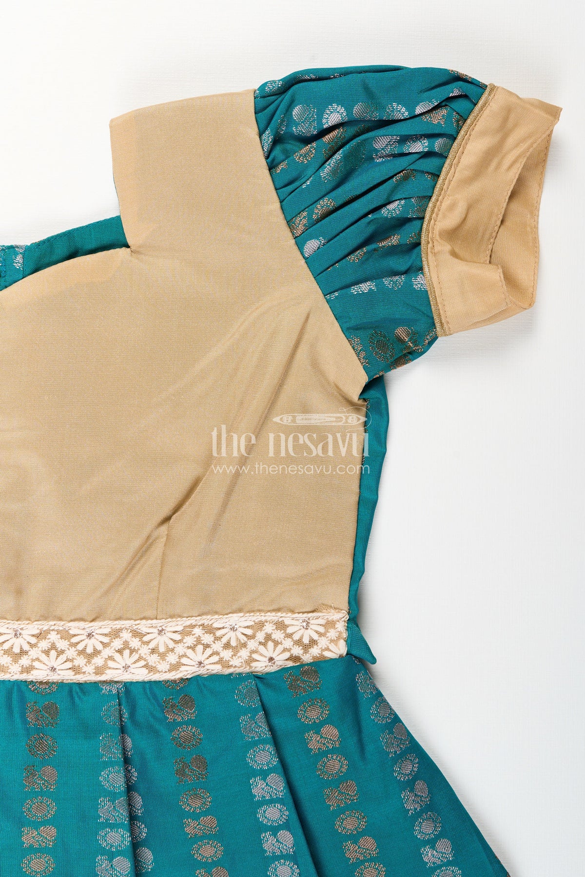 - The rich teal green bodice with golden zari patterns exudes festive charm