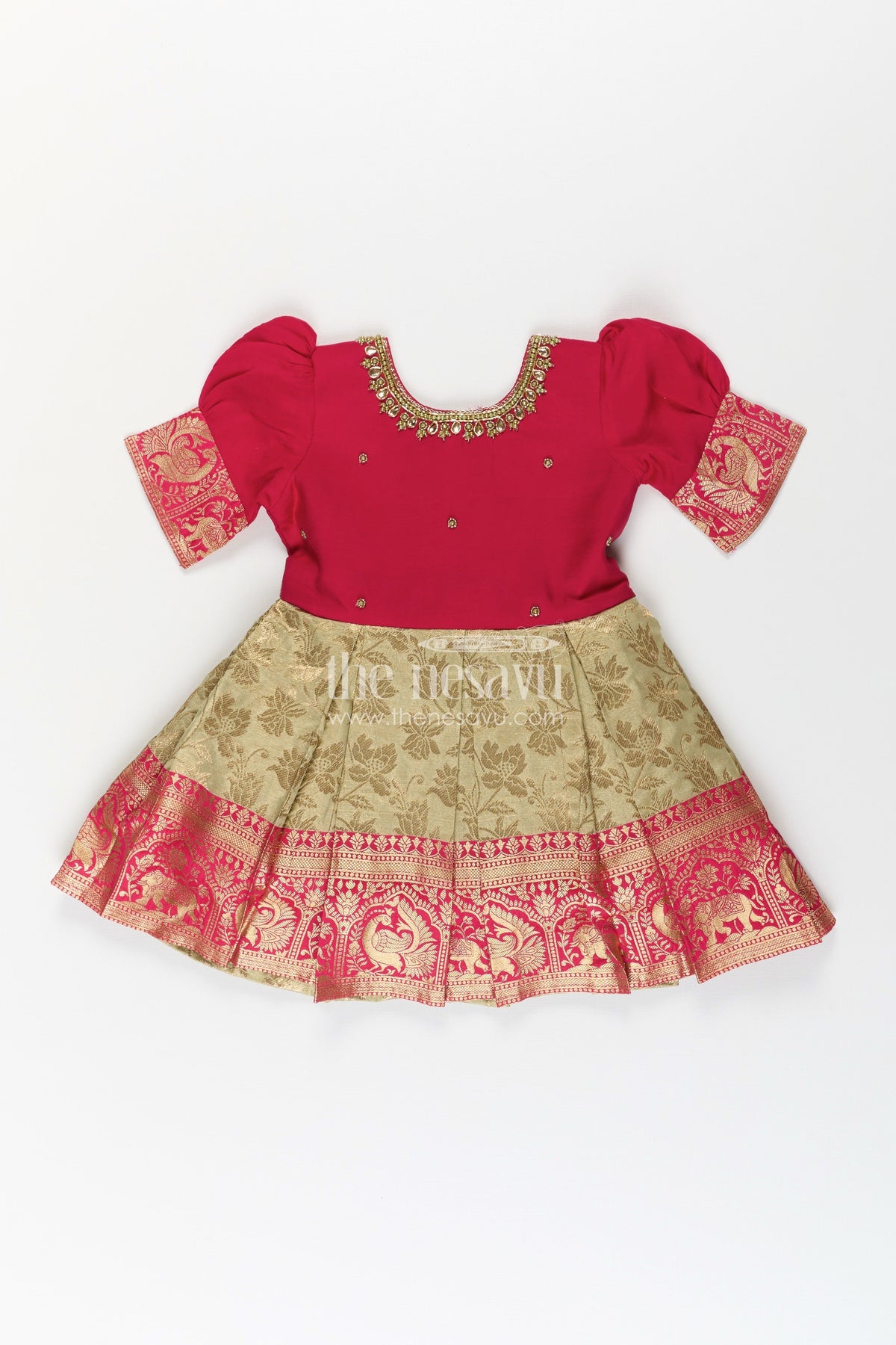 Celebrate your little one’s milestone in grandeur with this first birthday dress that perfectly blends tradition and charm. Designed in luxurious blended Banarasi silk, the dress features a deep maroon bodice embellished with delicate embroidery around the neckline and tiny golden motifs. The short puffed sleeves are enhanced with traditional zari detailing, mirroring the pleated skirt’s intricate Banarasi weave in elegant shades of gold and red. The flared silhouette offers plenty of room for movement while maintaining a classic ethnic look. Comfortable for day-long wear and picture-perfect for memorable celebrations, this frock is a timeless keepsake for your little girl's special day.