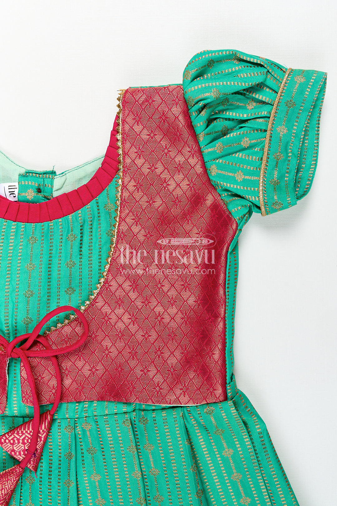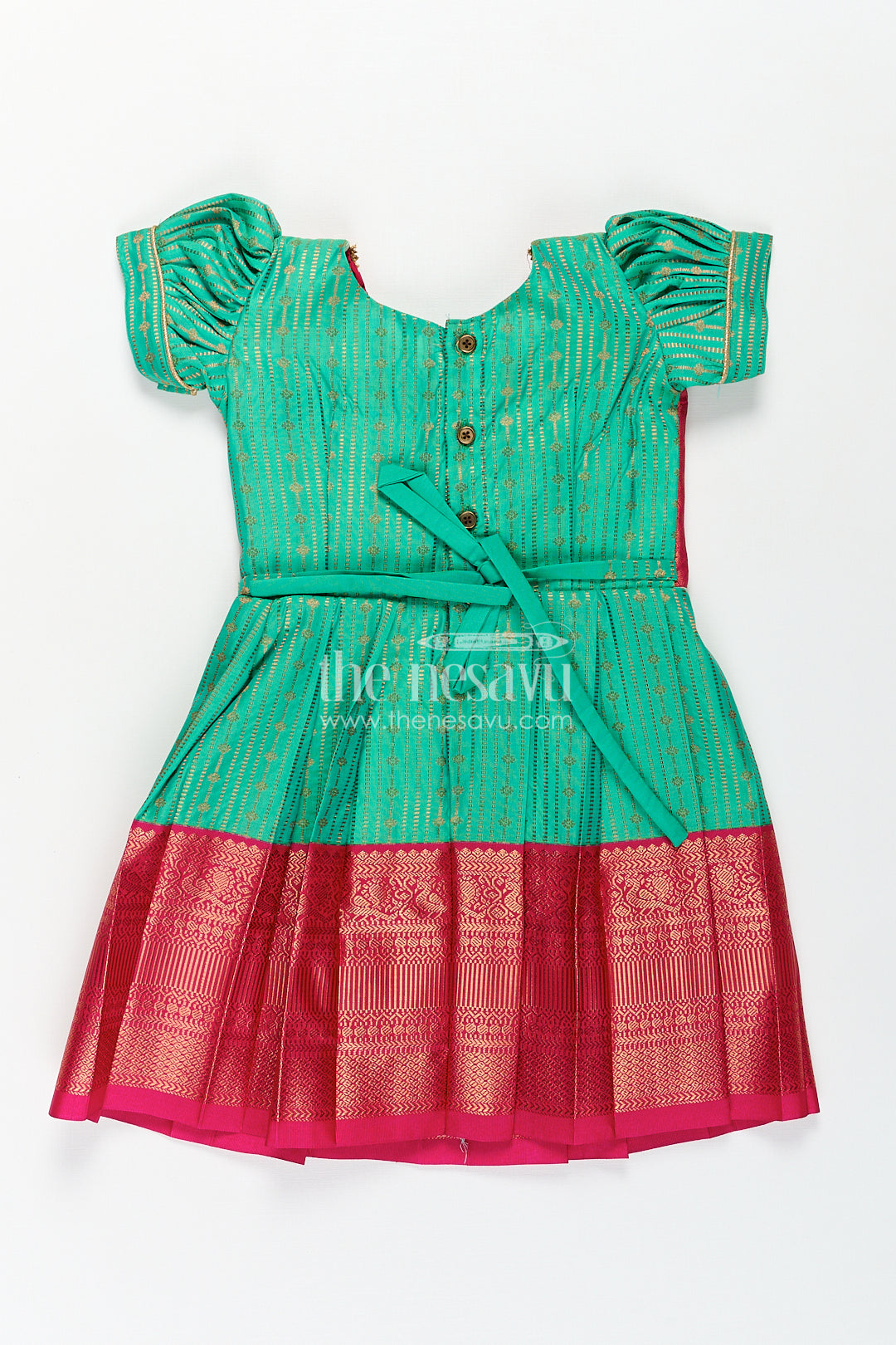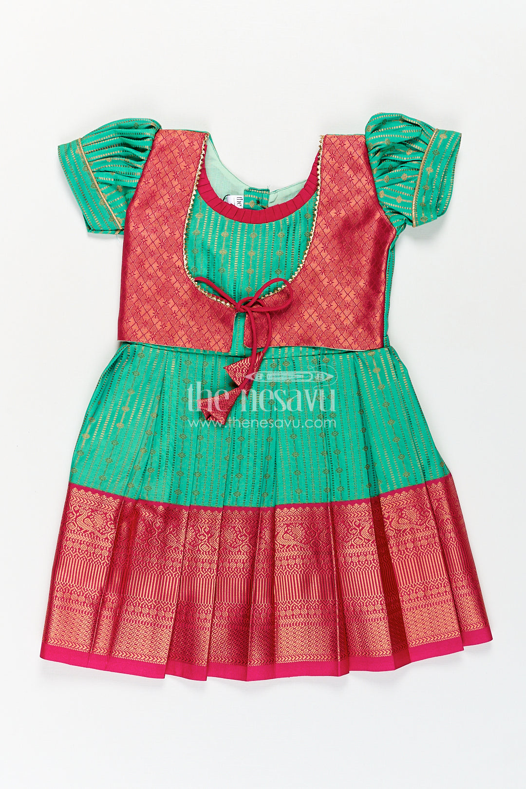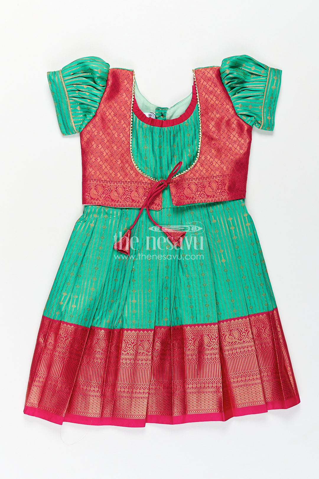 This silk design frock is a vibrant celebration of traditional style blended with playful charm for young girls. Crafted from semi kanchivaram silk, the frock features a stunning combination of emerald green and deep maroon, beautifully highlighted by intricate golden zari weaving. The standout detail is its unique maroon overlay that mimics a jacket-style bodice, complete with tie-up tassels, adding a layered look that enhances the ethnic appeal. The green body is adorned with subtle motifs, while the wide maroon border on the pleated skirt showcases detailed silk craftsmanship. With puffed sleeves and a round neckline, the design ensures comfort while maintaining a regal aesthetic. Ideal for weddings, festive events, or cultural celebrations, this silk design frock is both eye-catching and easy to wear. The soft silk texture and breathable structure make it a comfortable yet elegant choice for girls who love to twirl in style.