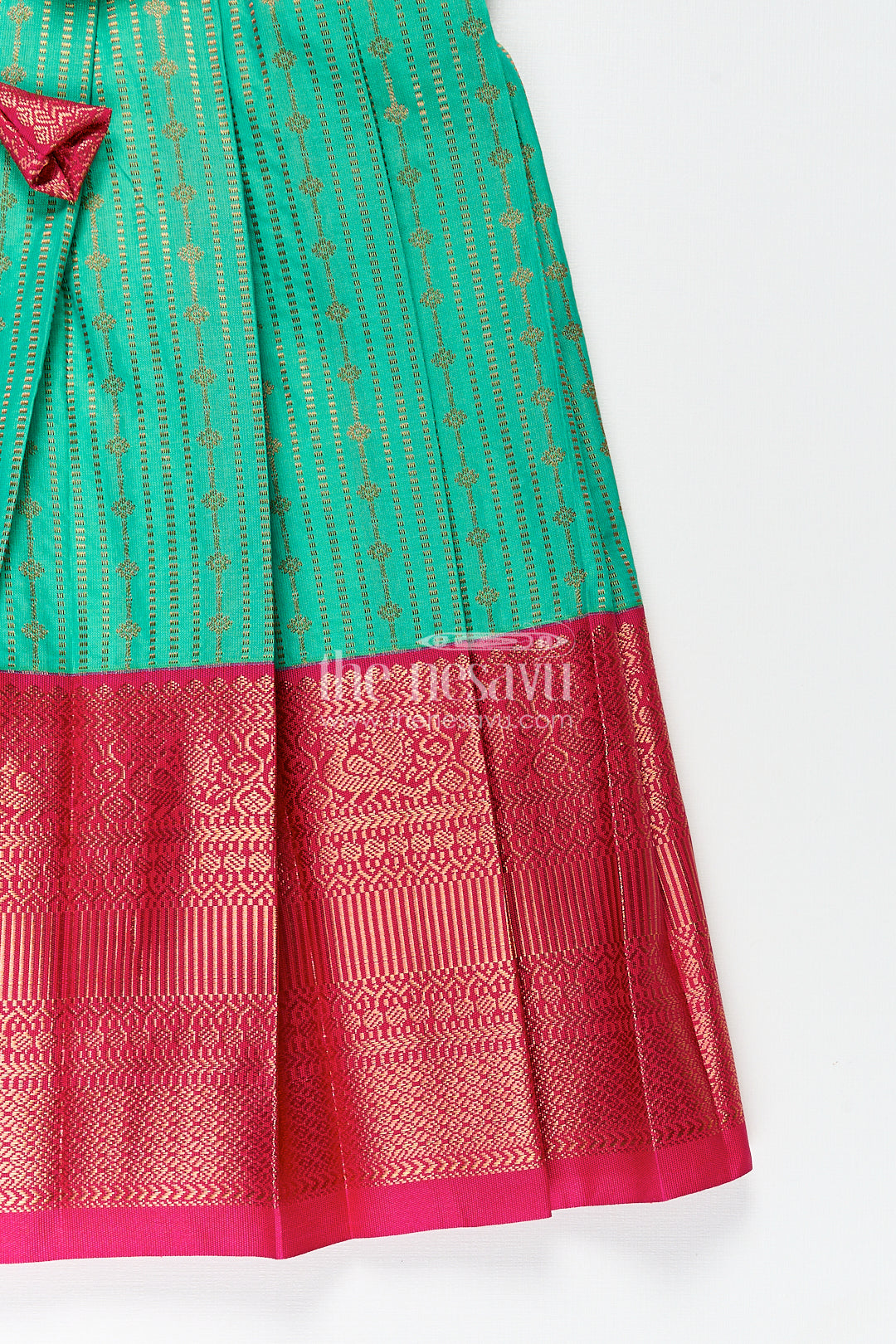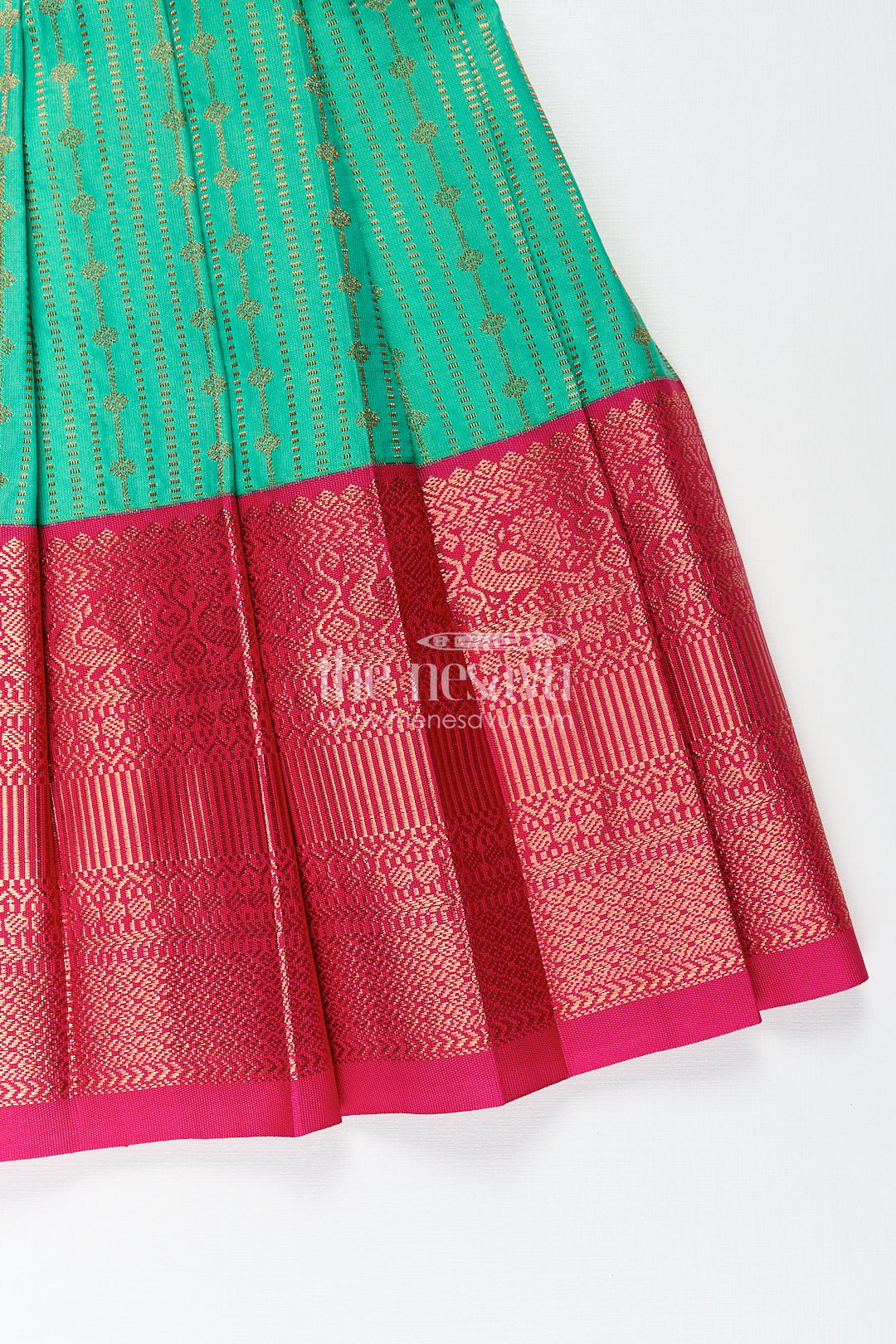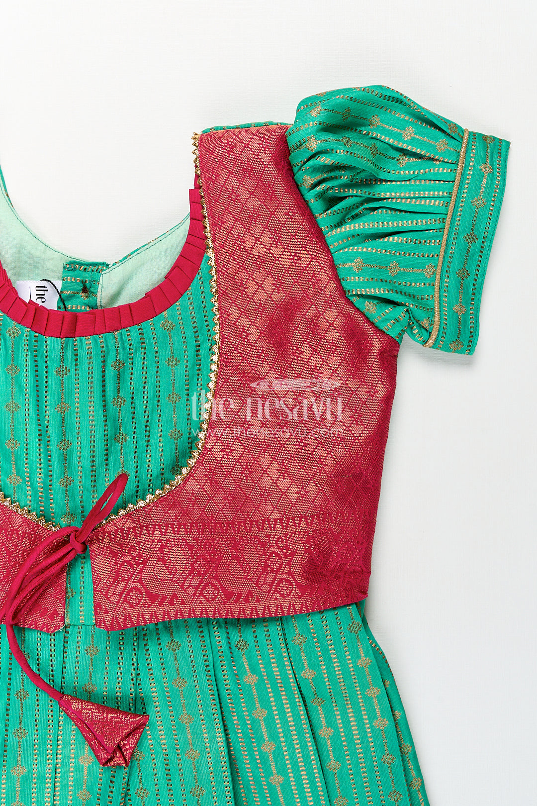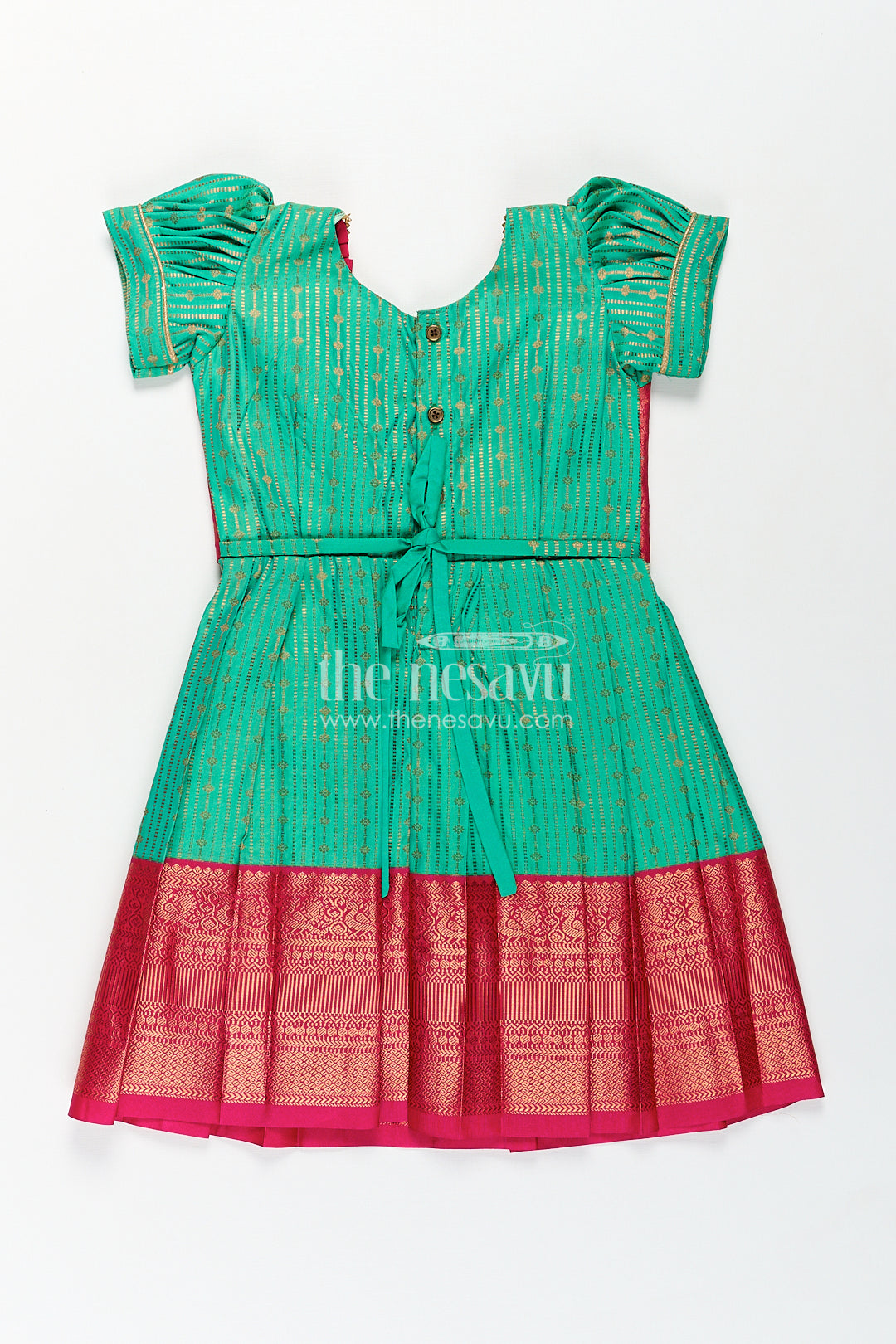 This silk design frock is a vibrant celebration of traditional style blended with playful charm for young girls. Crafted from semi kanchivaram silk, the frock features a stunning combination of emerald green and deep maroon, beautifully highlighted by intricate golden zari weaving. The standout detail is its unique maroon overlay that mimics a jacket-style bodice, complete with tie-up tassels, adding a layered look that enhances the ethnic appeal. The green body is adorned with subtle motifs, while the wide maroon border on the pleated skirt showcases detailed silk craftsmanship. With puffed sleeves and a round neckline, the design ensures comfort while maintaining a regal aesthetic. Ideal for weddings, festive events, or cultural celebrations, this silk design frock is both eye-catching and easy to wear. The soft silk texture and breathable structure make it a comfortable yet elegant choice for girls who love to twirl in style.