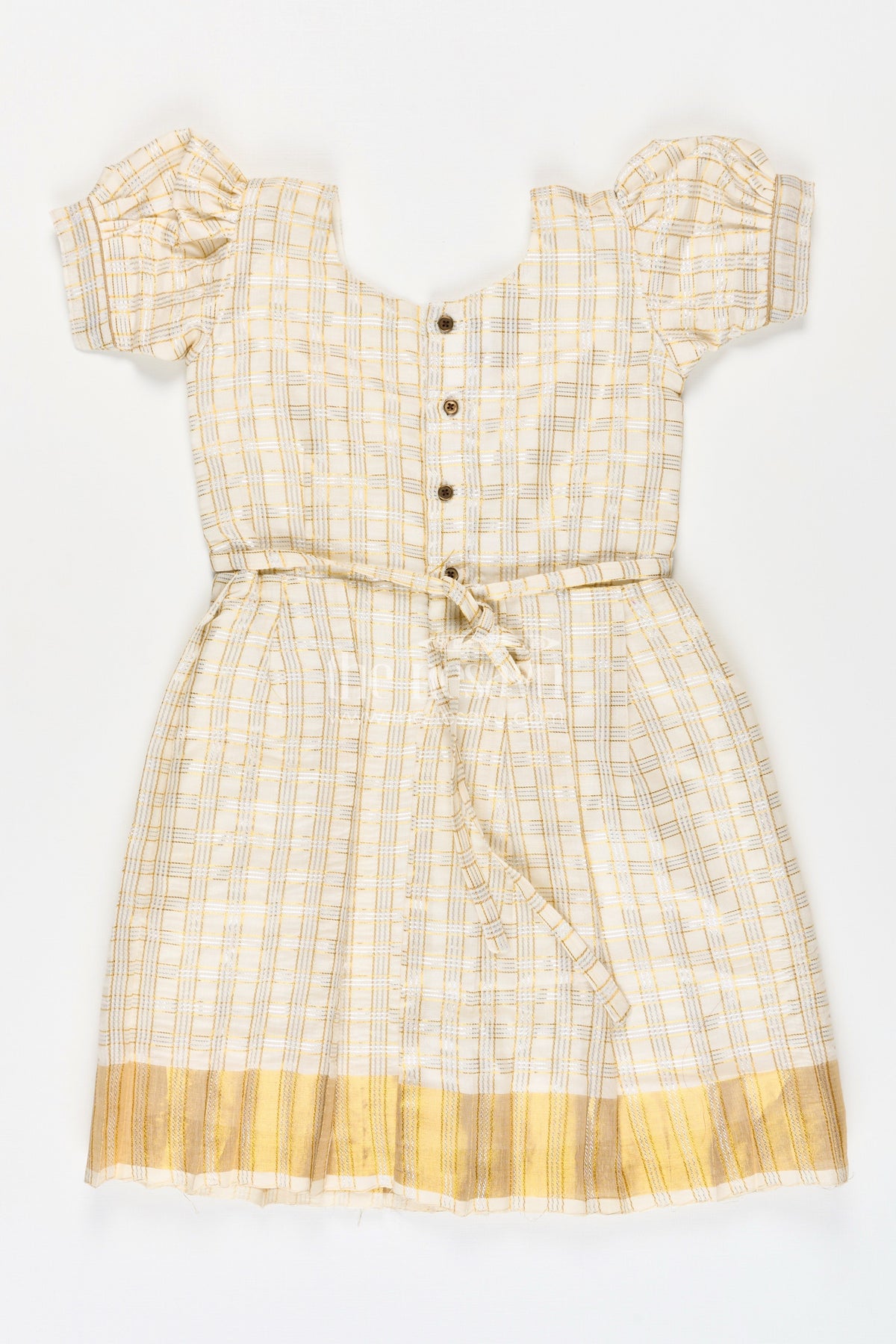 Long frock simple never looked more elegant than in this beige silk frock designed with tradition in mind. Featuring a clean, structured look, this frock uses golden check patterns and pleated details to bring out the richness of the tissue fabric. A neat golden bow at the waist completes the design, adding charm without overpowering the minimal aesthetic. The puff sleeves enhance the traditional shape, making it a go-to outfit for understated celebrations or casual festive wear. It’s simple, stylish, and easy to maintain - a perfect everyday ethnic option.
