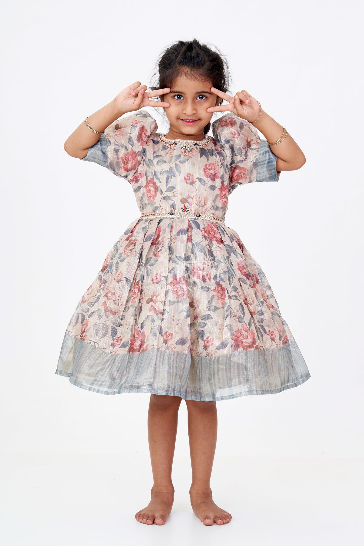 This breathtaking long silk frock is the perfect blend of elegance and comfort for your little girl. Crafted from soft gold tissue fabric with an exquisite floral digital print, this frock features puff sleeves and an intricately embellished neckline. The flared pleated skirt adds an extra dose of charm, making it ideal for weddings, festivals, and birthday celebrations. The luxurious texture of the fabric combined with sparkling beadwork ensures your child looks picture-perfect. The breathable material keeps her comfortable, and the back zip closure allows for easy dressing. Let her shine in this designer frock, perfect for any special occasion.