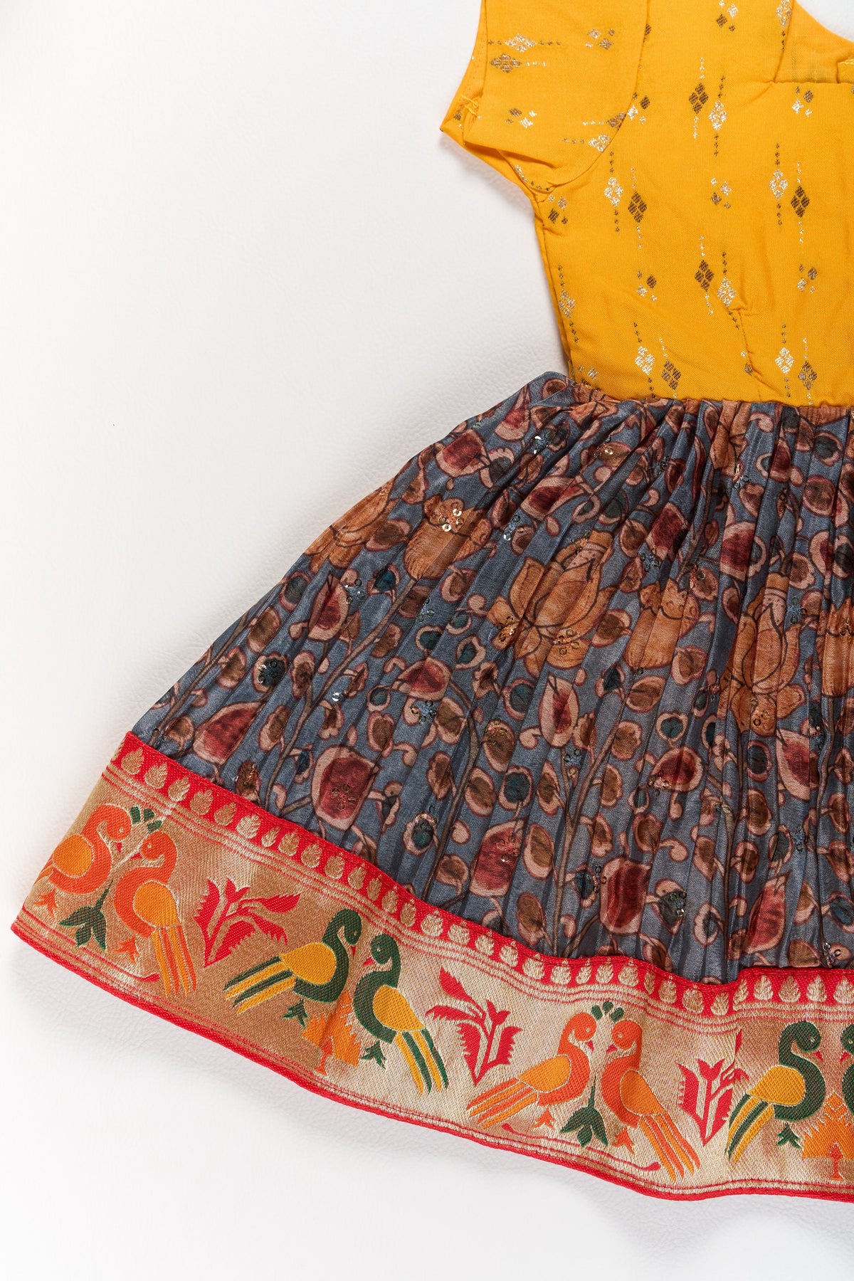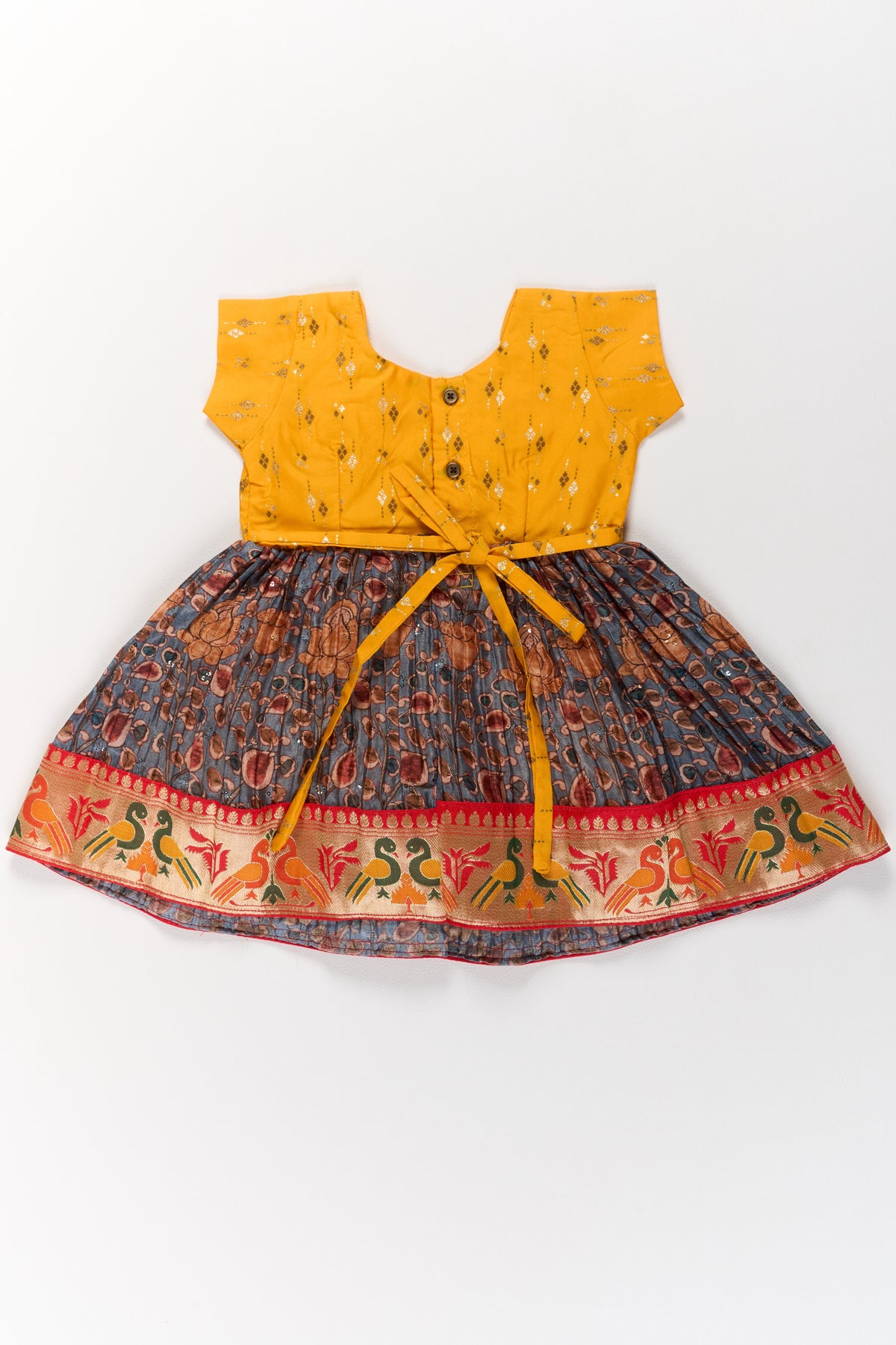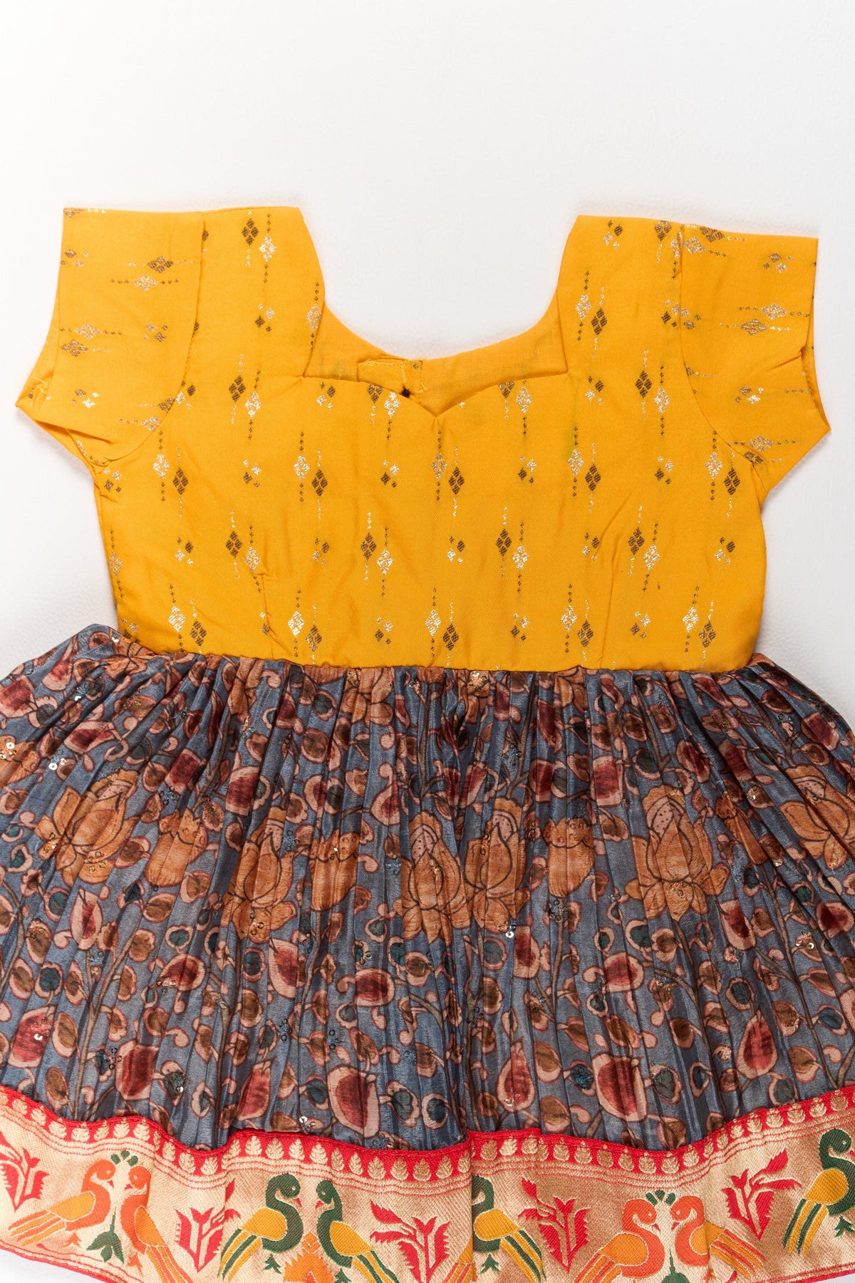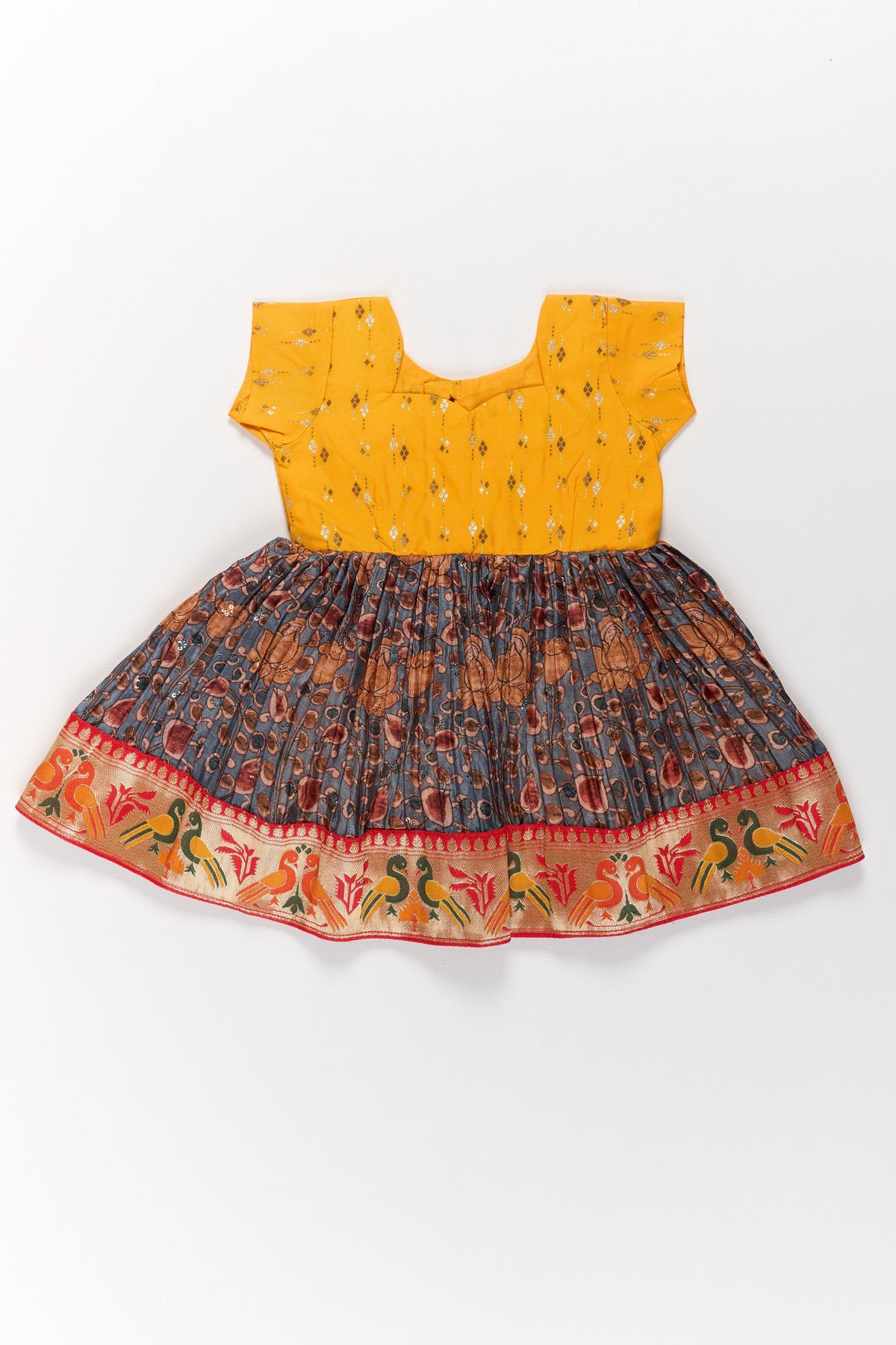 Give your little one a touch of tradition with this beautiful pattu pavadai set. The bright yellow blouse is adorned with delicate motifs, while the contrasting brown skirt features an intricate printed border with traditional elements. Crafted from a premium blend silk fabric, this outfit ensures comfort and elegance, making it perfect for festive occasions, temple visits, and cultural celebrations. The flared skirt allows for easy movement, while the soft fabric ensures breathability throughout the day. Pair it with ethnic jewelry for a graceful look.