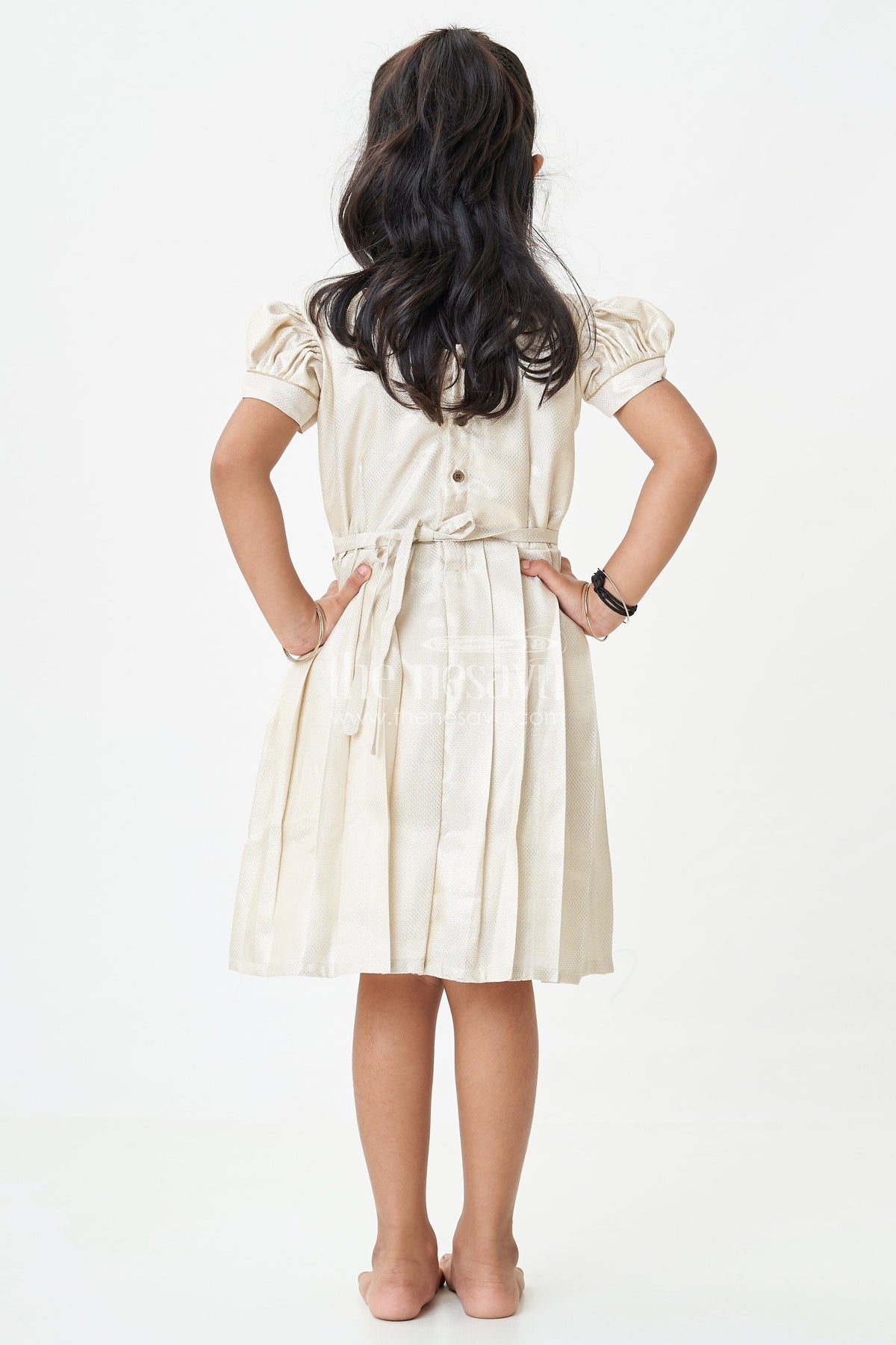 Silk Frock for Baby Girl in Ivory Tissue Silk with Emerald Embellished Yoke and Puff Sleeves