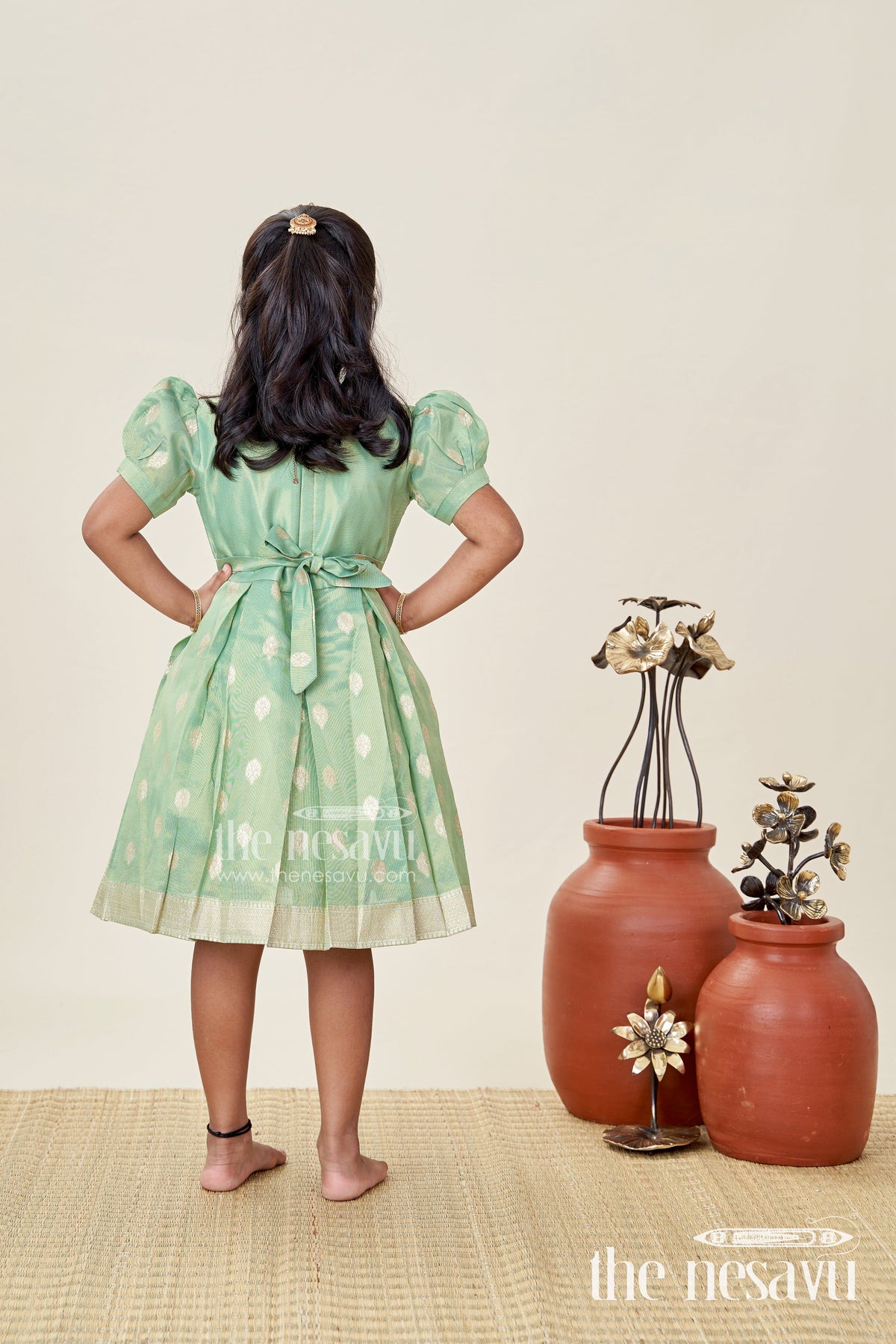 The Nesavu Silk Frock South Indian Traditional Silk Dress for Baby Girls with Zari Work Nesavu Nesavu Traditional South Indian Green Silk Frock Girls Golden Tissue Bottom Zari Accents