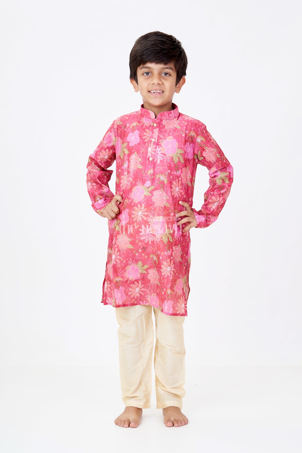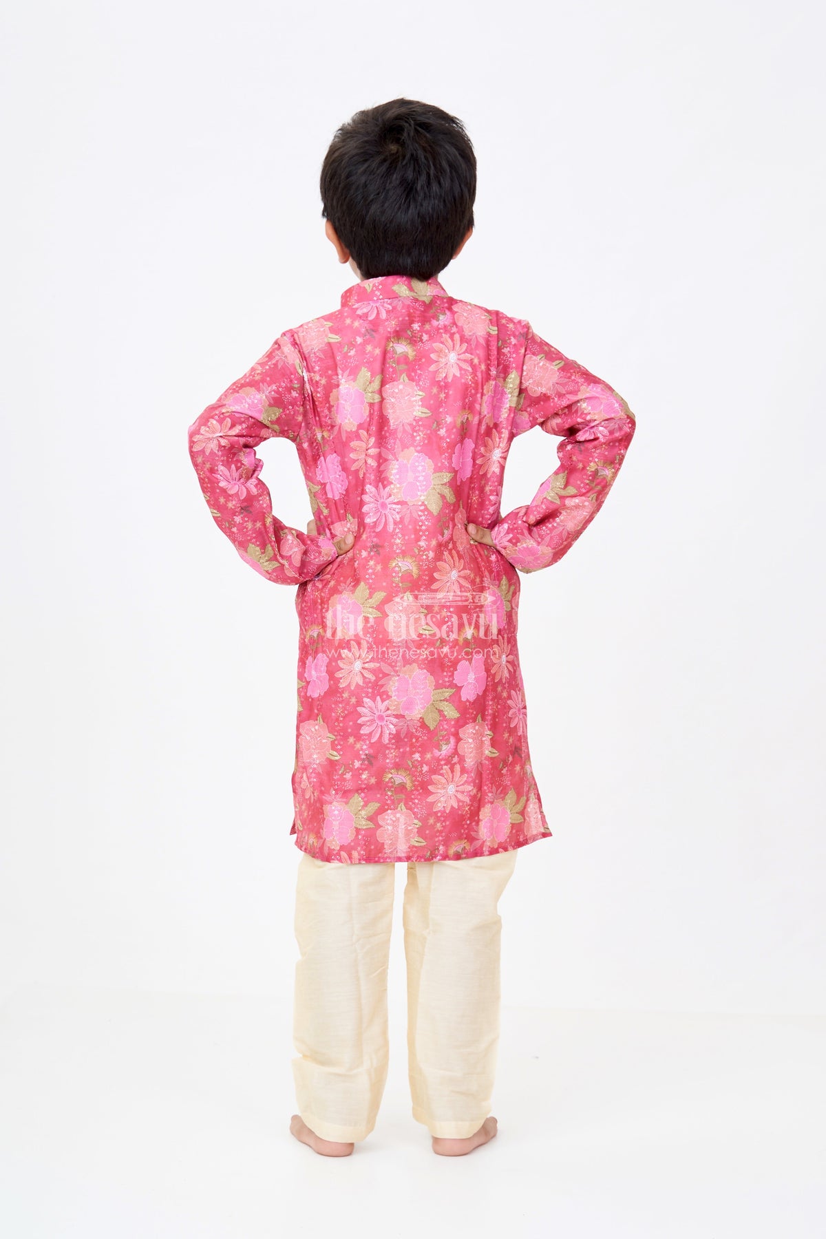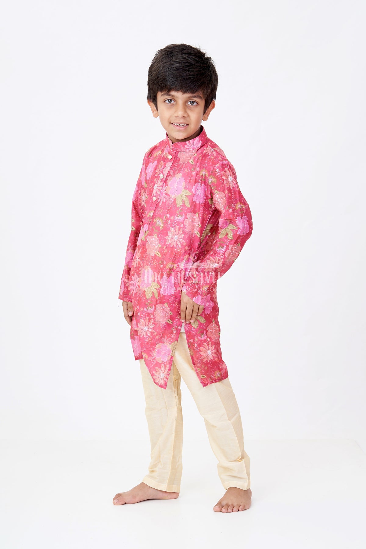 The maroon kurta set is a standout piece for boys, beautifully crafted with intricate self embroidery and vibrant digital prints that highlight its festive charm. Made from high-quality silk cotton, this maroon kurta is soft against the skin and breathable, ensuring all-day comfort for your little one. The rich maroon hue is enhanced with a delightful spread of floral designs, adding a modern yet traditional twist to the outfit. Paired with cream-hued cotton pants, the ensemble balances flair with simplicity. Perfect for lively family gatherings or cultural functions, the kurta's straight-cut fit and long sleeves provide easy movement and a stylish silhouette. With practical details like a comfortable back closure and easy-wash care, this maroon kurta is both fashionable and functional for growing kids.