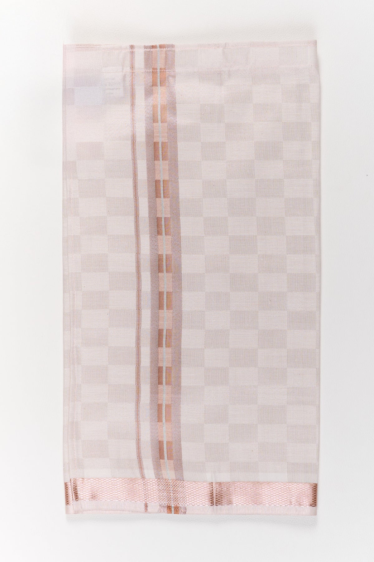 This exquisite boys traditional wear dhoti is crafted from high-quality silk, perfect for cultural occasions and festive gatherings. The subtle rose gold zari border complements the light beige base, creating a refined and sophisticated look. The dhoti is lightweight, ensuring comfort and ease of wear for your child during long celebrations or family functions. Its traditional design, combined with premium silk fabric, makes it a standout piece for occasions like weddings, religious ceremonies, or Pongal festivities. Pair it with a simple shirt or a designer kurta to complete the ensemble.