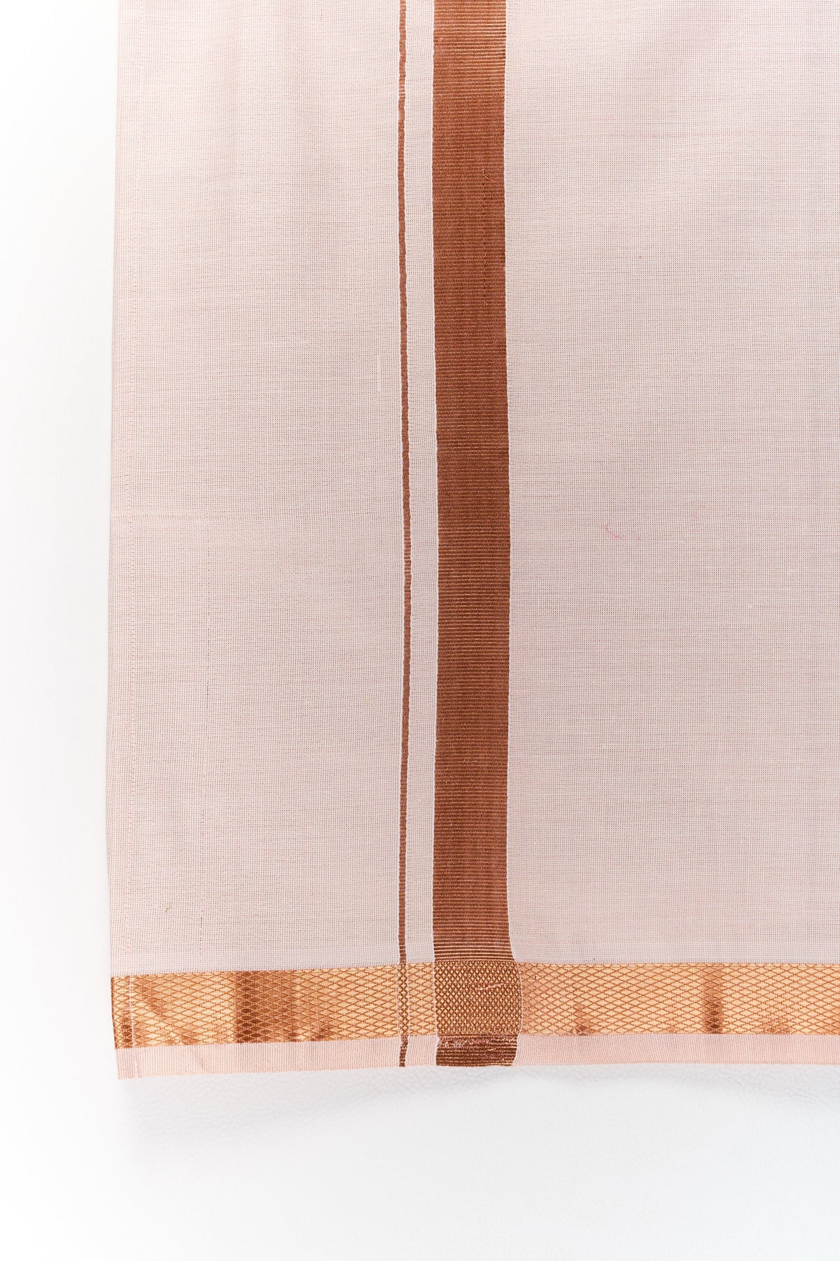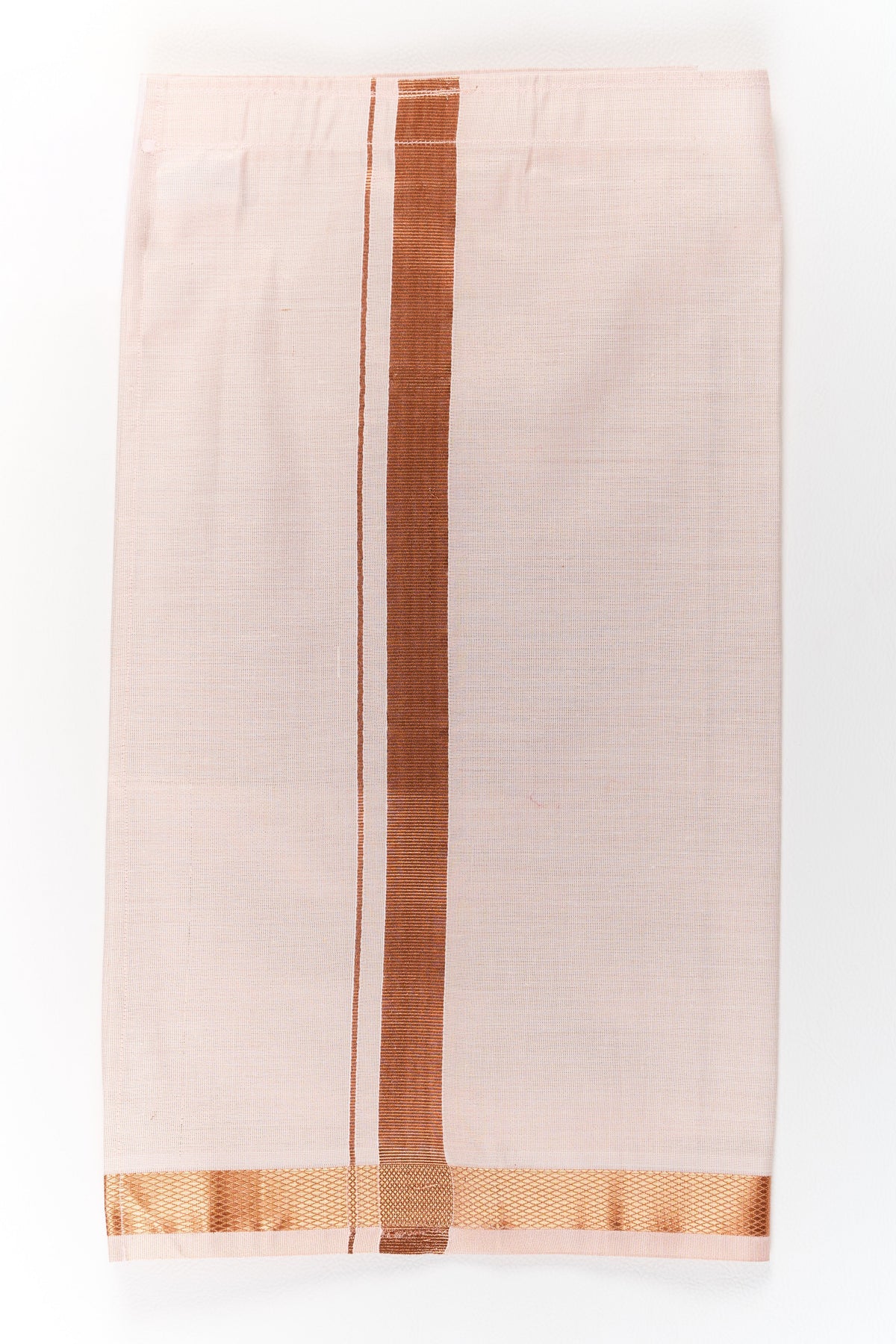 Celebrate South Indian traditions with this exquisite traditional South Indian mens clothing for boys. Crafted from high-quality silk, this vesti features a soft beige base highlighted by a striking copper zari border. Lightweight and comfortable, this vesti is ideal for cultural festivals, weddings, or religious ceremonies. Its classic design ensures a perfect fit and complements any traditional shirt or kurta. Let your child embrace tradition with style and elegance.