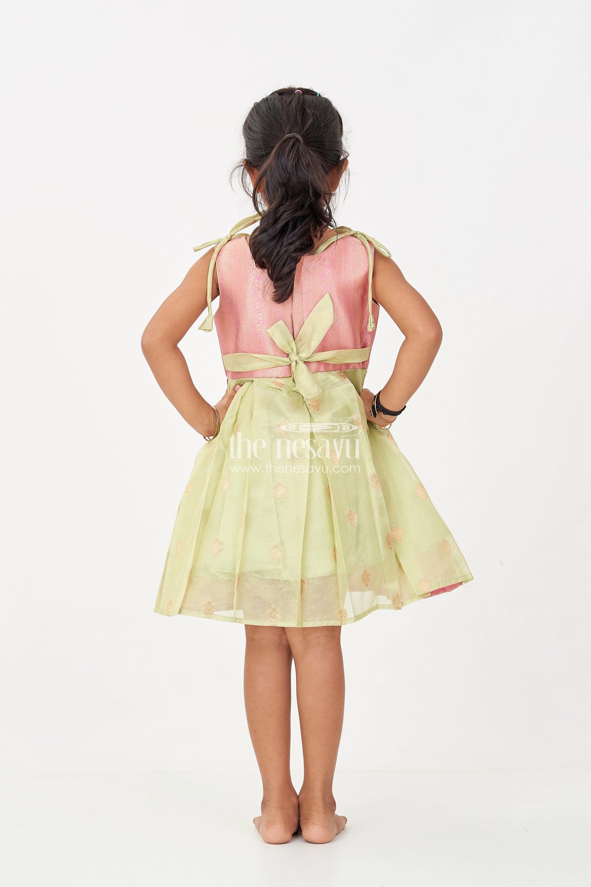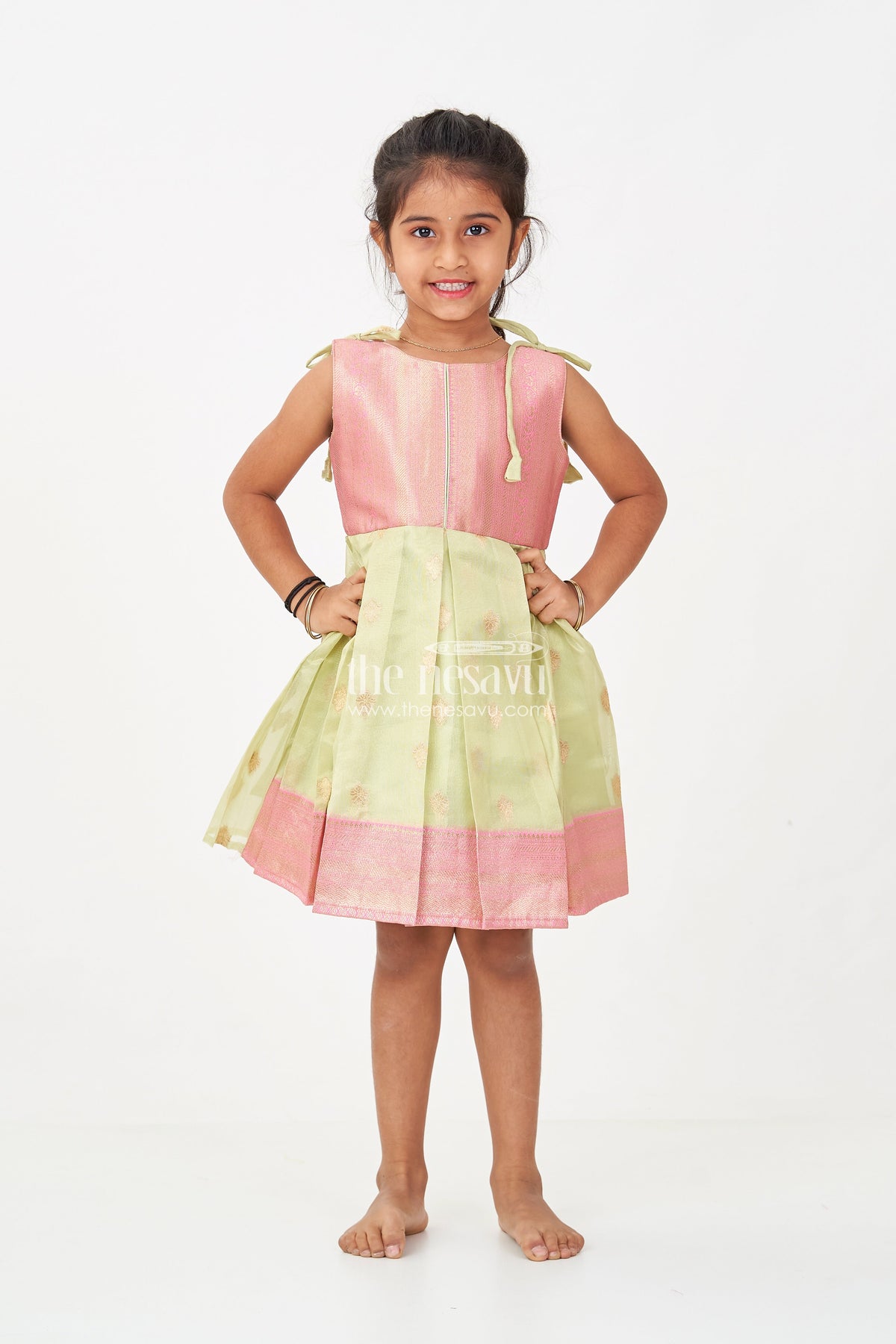This simple silk frock is a beautiful blend of tradition and contemporary style. Crafted from high-quality gold tissue Banarasi jacquard silk blend, this frock features an elegant dual-tone design with a soft green base and contrasting pink border. The sleeveless cut and back tie-up detailing add to its modern appeal while ensuring a comfortable fit. The pleated skirt enhances movement, making it ideal for cultural events, family functions, and festive occasions. Lightweight yet regal, this dress is a graceful choice for your little one.