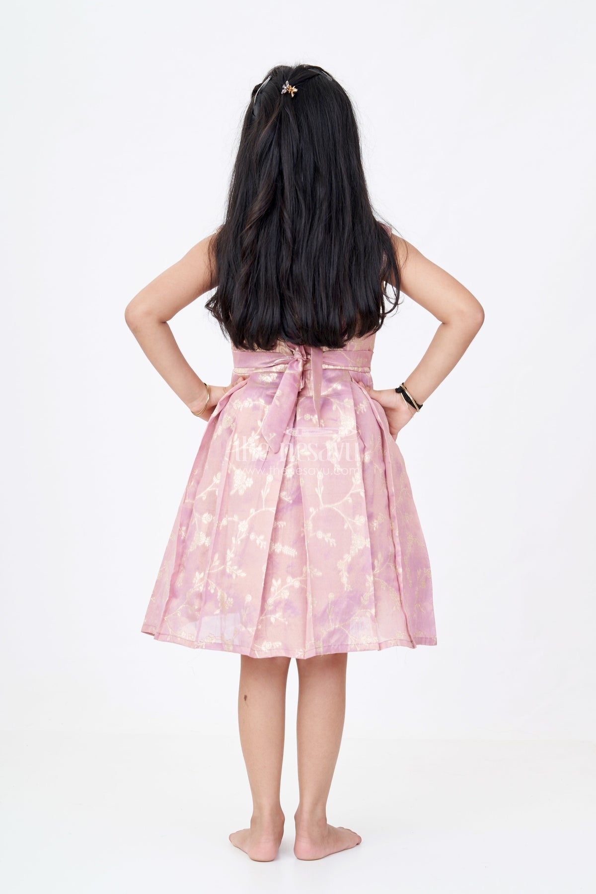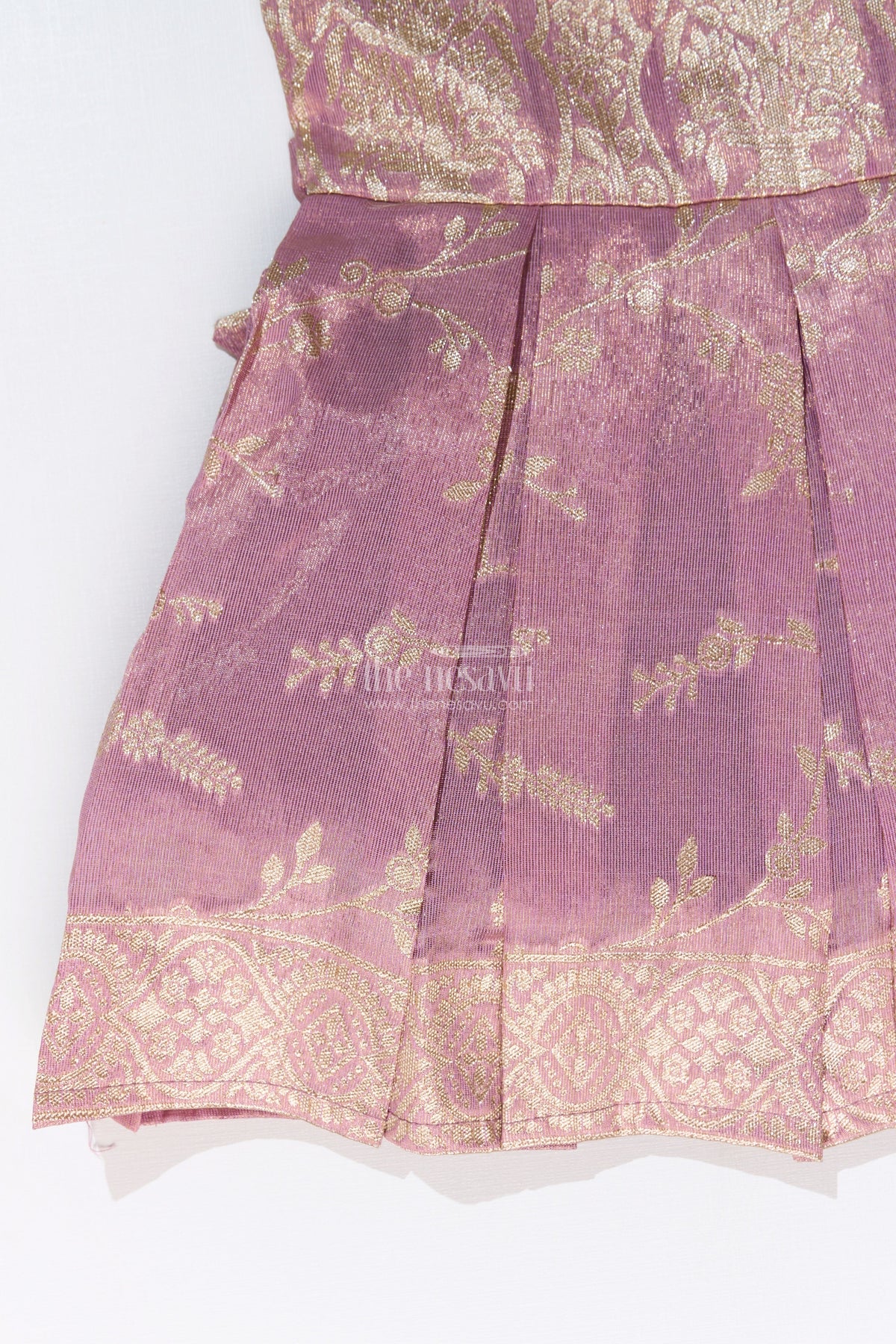 This exquisite purple silk frock is designed for little girls who love a touch of royalty. Made from a premium gold tissue Banarasi jacquard silk blend, this dress features intricate golden motifs and an embroidered neckline for a luxurious finish. The flared pleated skirt adds volume and grace, making it an ideal pick for weddings, cultural gatherings, and special celebrations. Its sleeveless style and lightweight fabric ensure comfort while exuding traditional charm. Elevate your child’s ethnic wardrobe with this timeless piece.