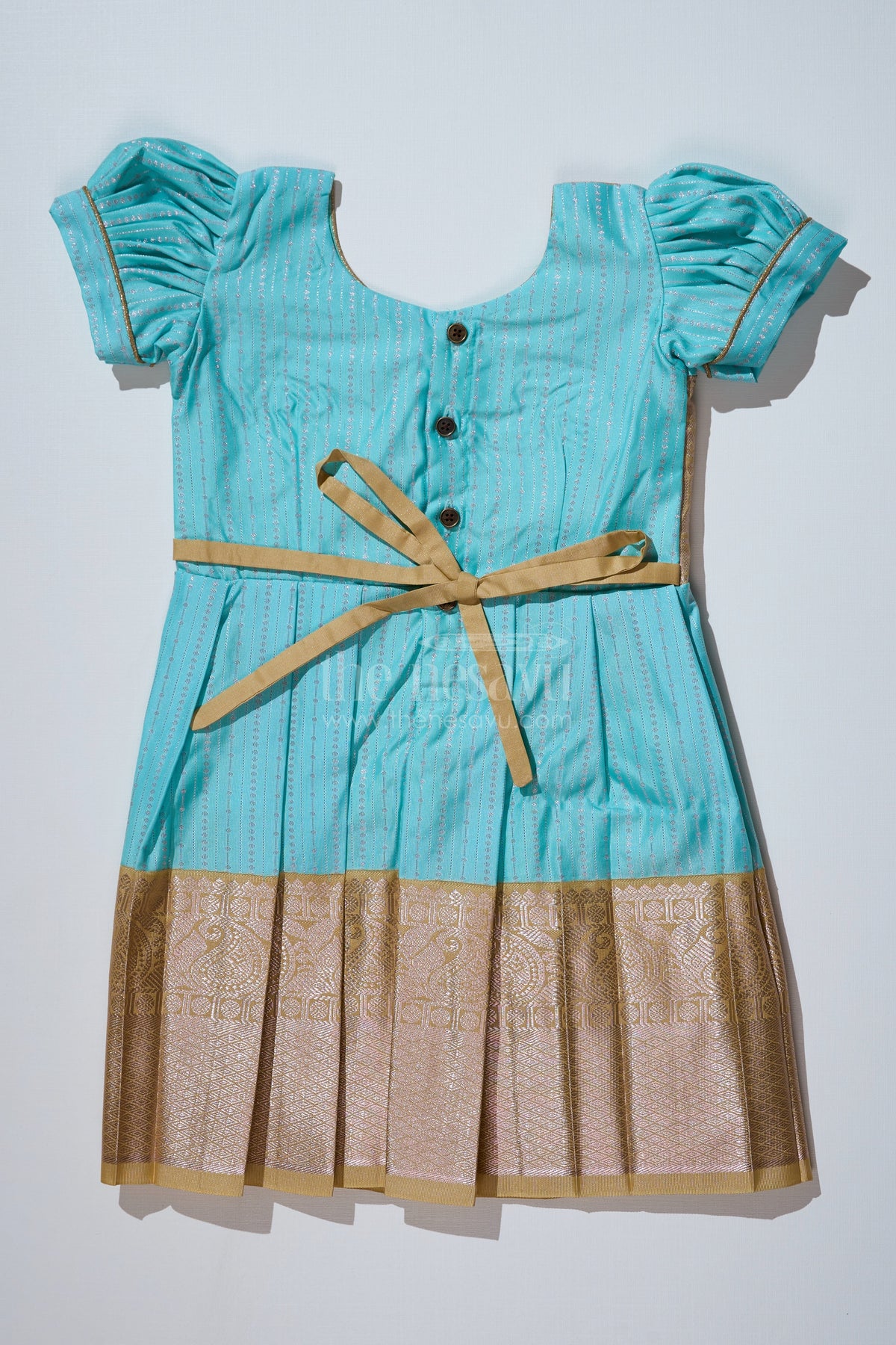 This gorgeous sky blue frock is designed to bring out the beauty of tradition with a modern touch. Made from pure Kanchipuram silk-inspired blended fabric, this frock features a soothing sky-blue shade complemented by rich golden zari detailing. The crossover yoke design adds a sophisticated appeal, while the puff sleeves with delicate golden piping enhance its traditional charm. The pleated skirt, adorned with intricate gold zari patterns, gives it a regal look, making it a perfect choice for weddings, festivals, and other special occasions. Designed for comfort and elegance, this dress allows your little one to move freely while looking effortlessly graceful. Pair it with traditional jewelry and matching footwear for a complete festive ensemble.
