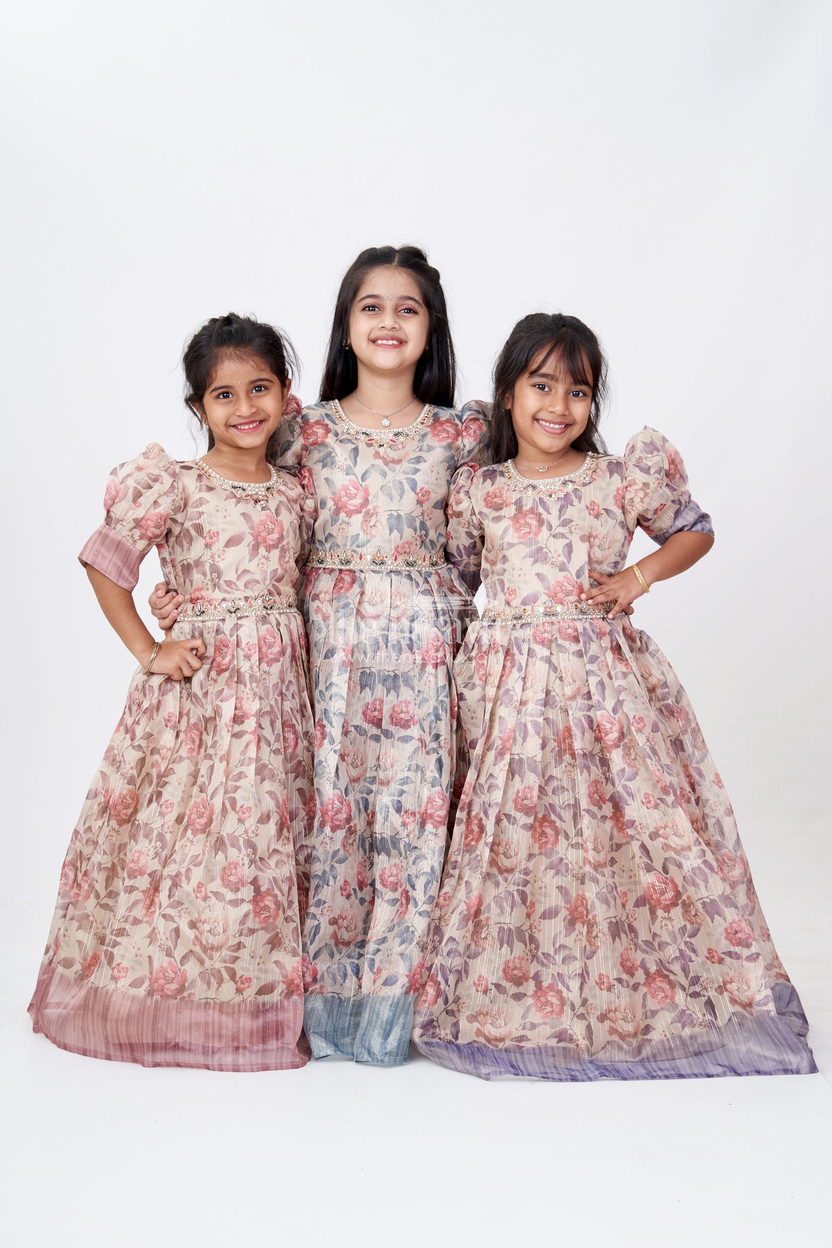 Let her shine in this stunning party gowns piece designed with rich gold tissue and an allover floral digital print. The dress flows gracefully from a fitted bodice with puff sleeves into a voluminous skirt that sways with every step. Elegant in its rose garden-inspired print, this gown features intricate beadwork at the neckline and waist, enhancing its luxurious appeal. Whether it's a party, family celebration, or special gathering, this gown ensures she feels like royalty in every moment.