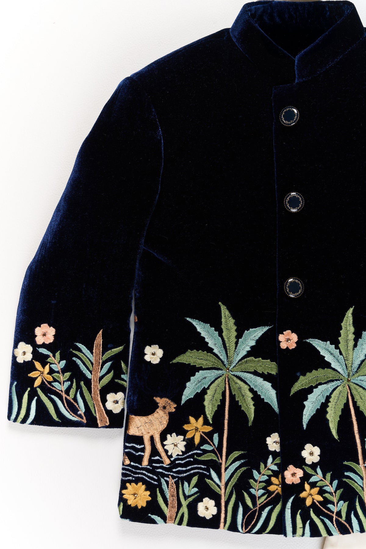 This stunning indo western wedding outfit for boys is a perfect blend of tradition and modernity. The set features a royal velvet jacket in navy blue with intricate nature-inspired embroidery, paired with cream-colored tailored pants. The velvet fabric adds a luxurious touch, while the lightweight design ensures comfort for your little one. Ideal for weddings, receptions, or festive gatherings, this outfit ensures your child looks stylish and feels comfortable throughout the day. Pair it with traditional footwear for a complete look.