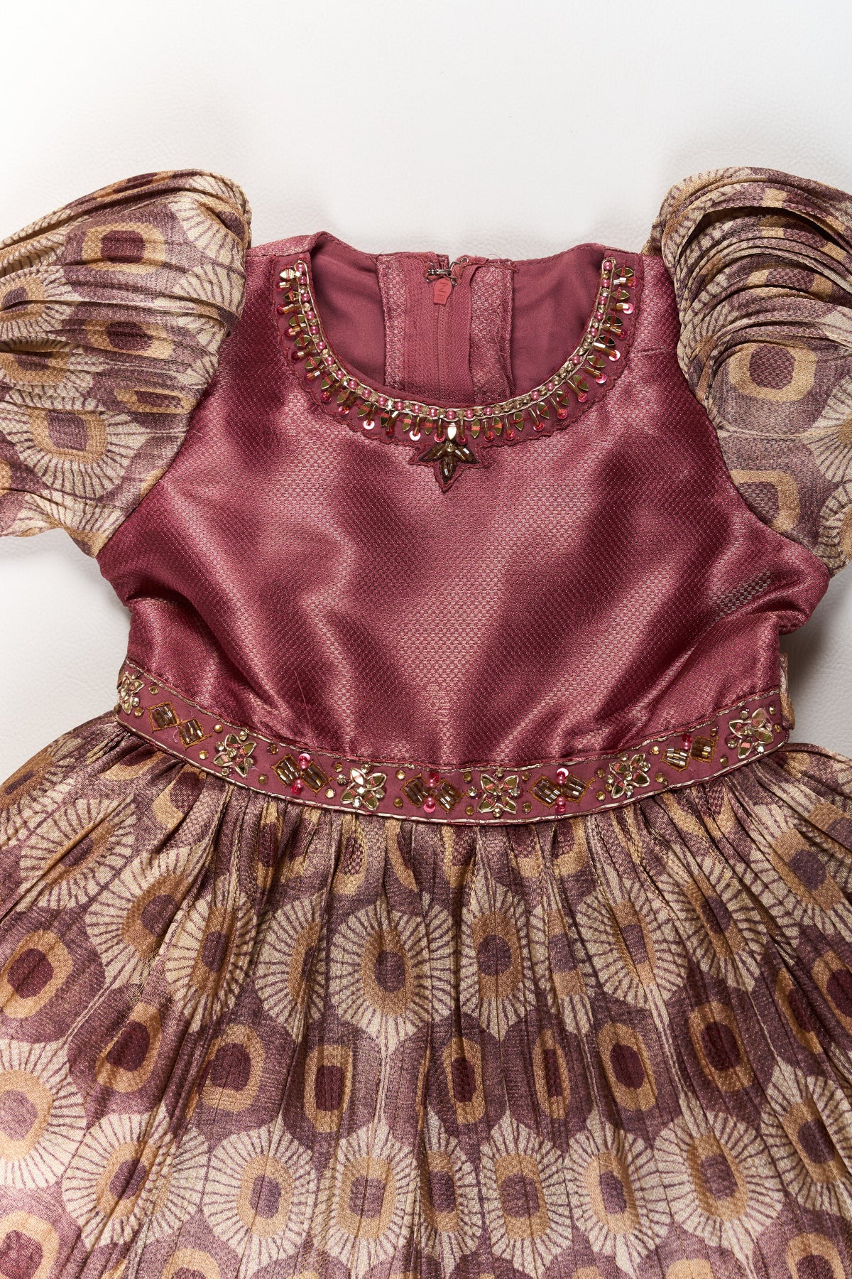 This gorgeous silk dress is designed to make your little girl shine at any special event. Crafted from soft organza with an elegant printed pattern, this peach-colored fancy frock radiates charm and sophistication. The puff sleeves add a vintage-inspired touch, while the flared hem enhances the dress’s graceful movement. The high-quality fabric ensures both comfort and durability, making it ideal for weddings, birthdays, and grand celebrations. The fitted bodice with a back zip closure provides a secure fit, while the voluminous skirt creates a princess-like silhouette. Whether styled with ballet flats or accessorized with a tiara, this organza frock is a must-have for every fashion-forward girl’s wardrobe.