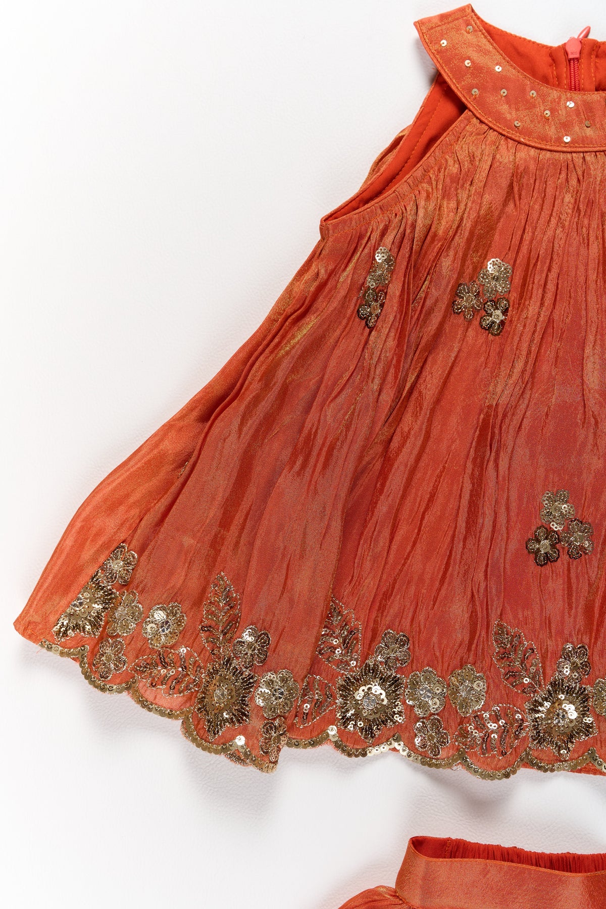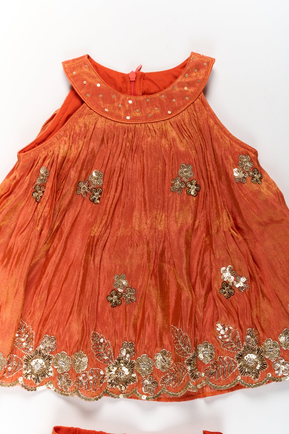 This exquisite girls holiday dress set features a beautifully crafted sharara with a matching embroidered cape, perfect for festive celebrations and family gatherings. Made from premium viscose silk, the outfit offers a rich texture with a luxurious feel. The vibrant orange hue adds a festive charm, while the intricate embroidery on the cape enhances its elegance. The flowy sharara pants ensure ease of movement, making it both stylish and comfortable. Ideal for weddings, Diwali, and other cultural festivities, this sharara set will make your little one stand out with grace. The breathable silk fabric keeps her comfortable, while the structured design ensures a flattering fit. Pair it with traditional juttis and accessories for a complete ethnic look.