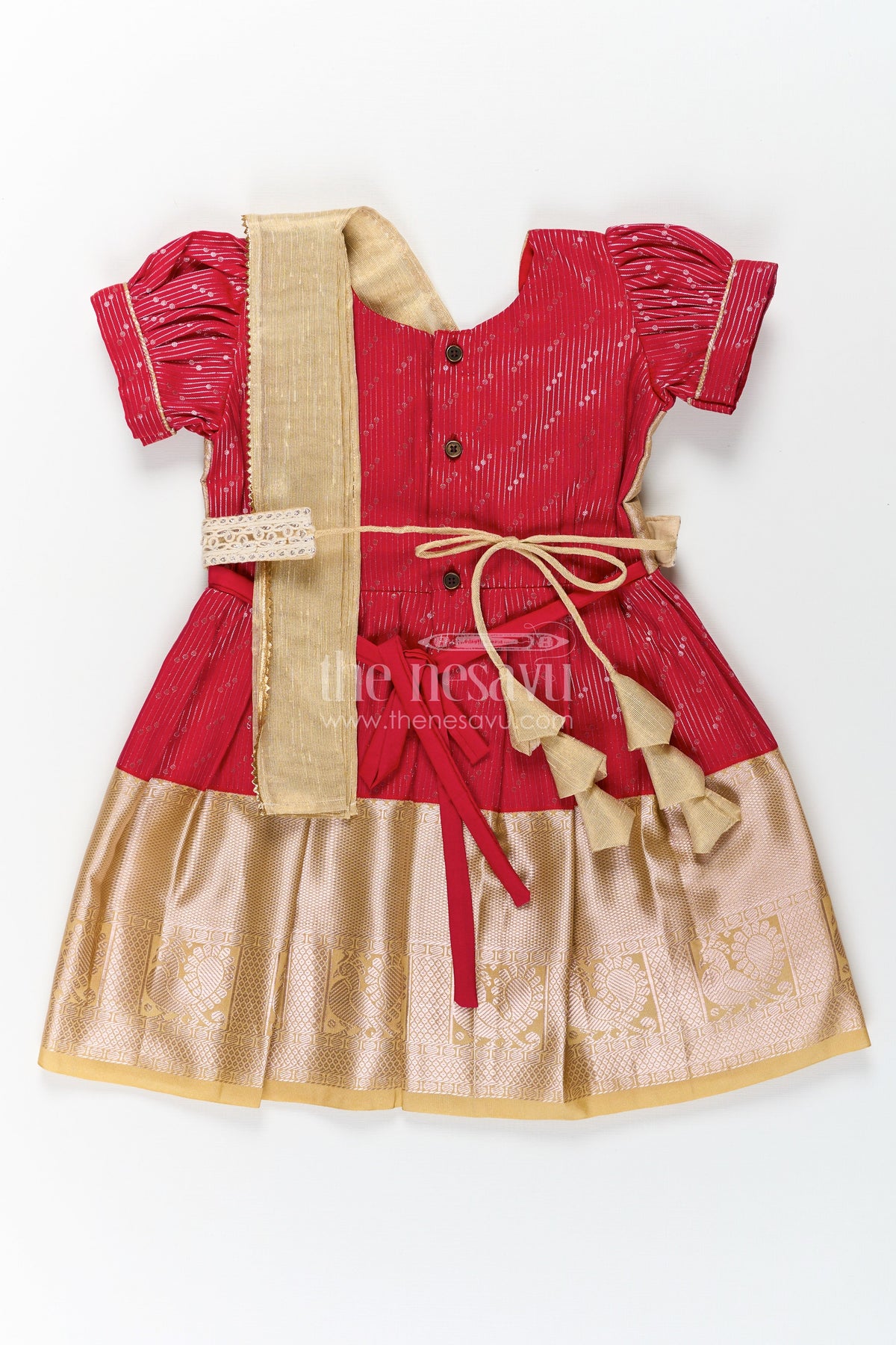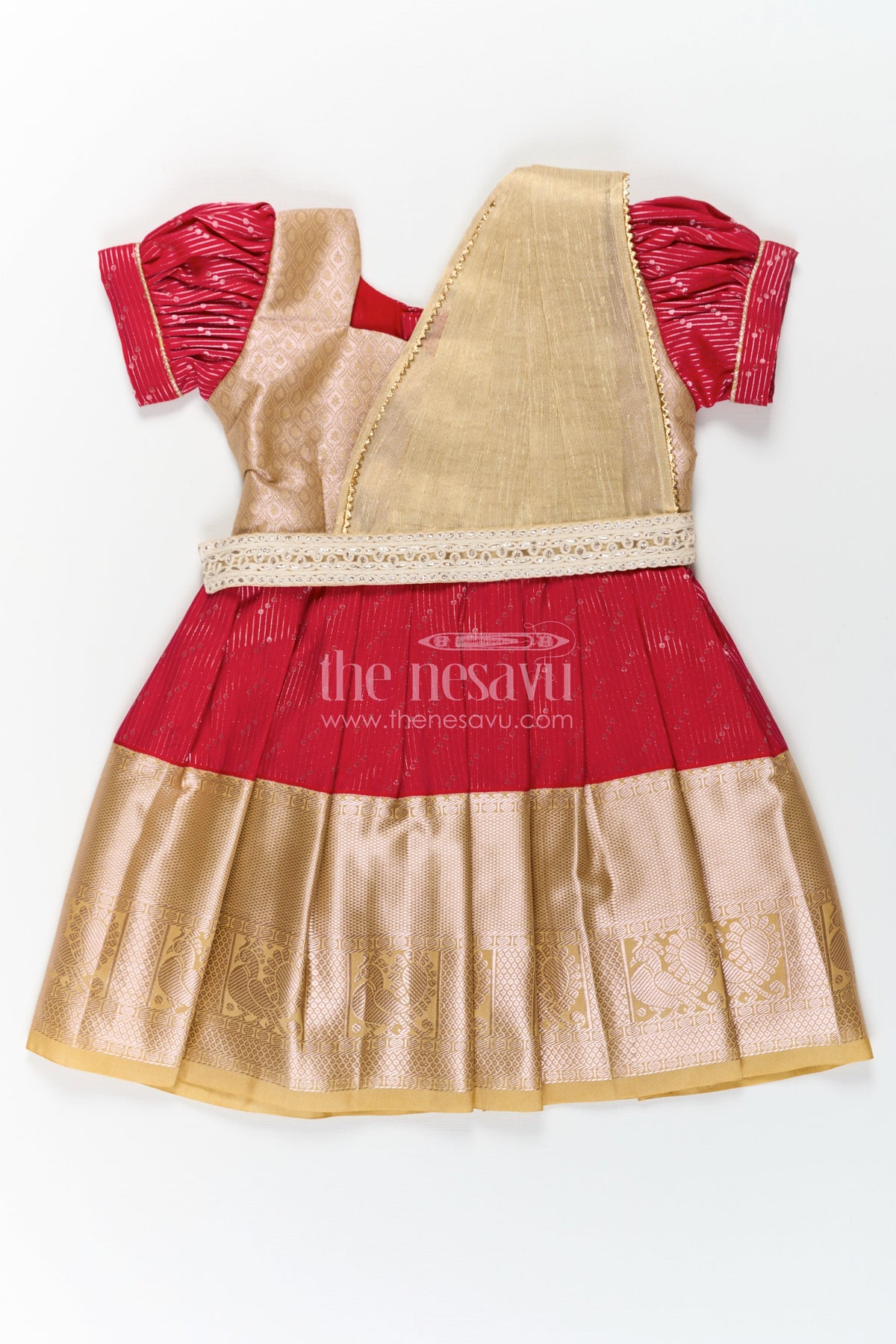 This beautifully designed girls pattu pavadai set is a perfect choice for festive occasions, temple visits, and cultural celebrations. The rich red blouse features delicate golden detailing, while the beige pleated skirt is adorned with a broad zari border, enhancing its traditional charm. The outfit comes with an attached dupatta, adding a graceful touch. Crafted from high-quality blend silk, this set ensures comfort and style, making it an ideal pick for weddings, Navratri, and Pongal festivities.
