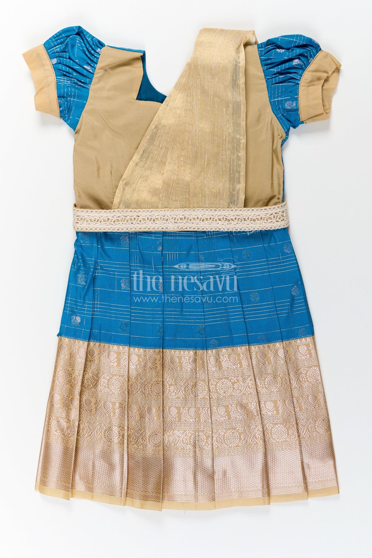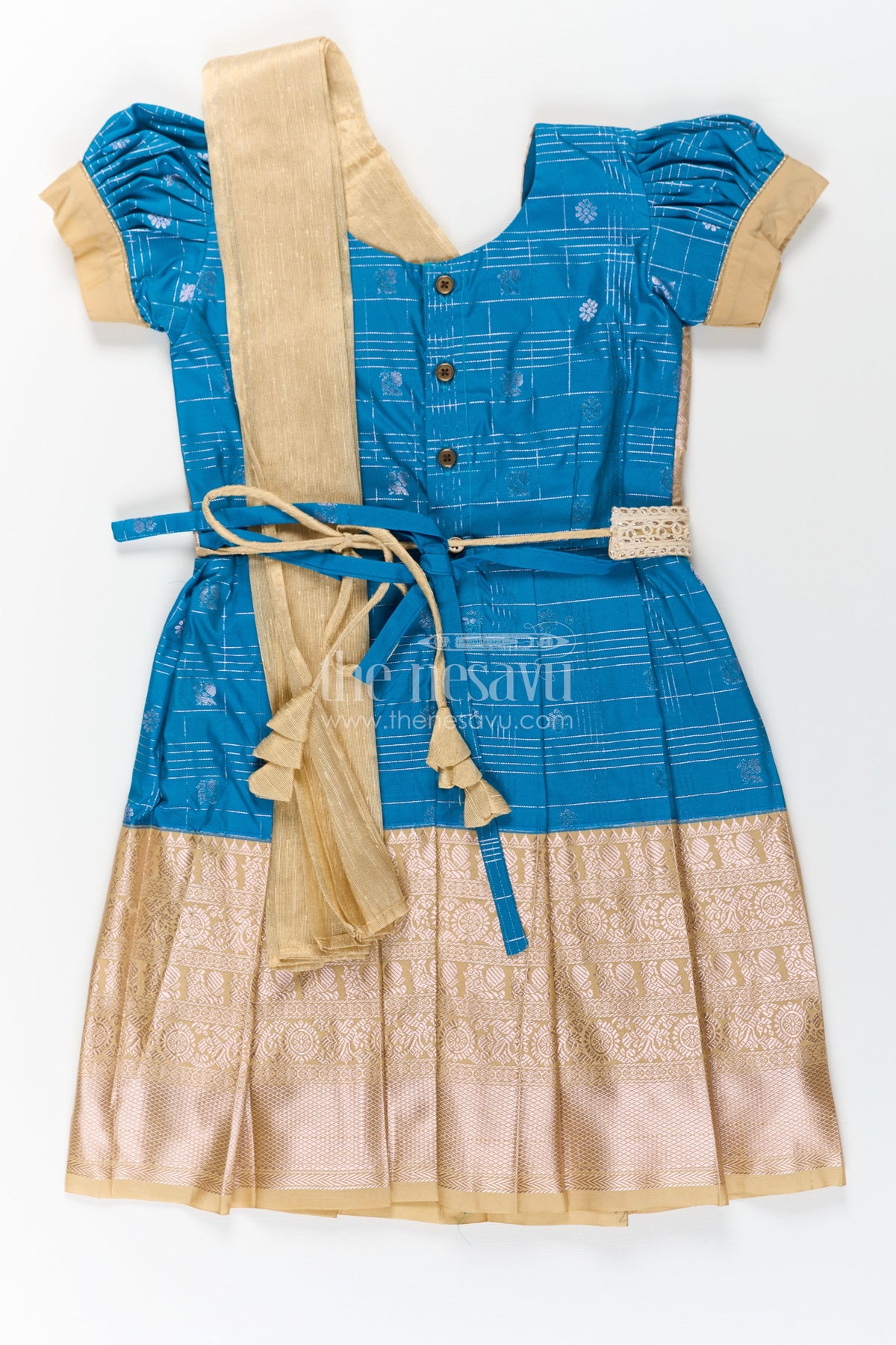 Designer silk dresses are the perfect fusion of traditional richness and contemporary comfort, and this charming girls Kanchi silk frock exemplifies just that. Crafted from semi Kanchivaram silk, this frock boasts exquisite thread embroidery and an embellished lace dupatta detail that adds a regal touch. The top features a shimmery beige yoke contrasted with pleated blue and golden woven patterns on the skirt, giving it a festive look while remaining versatile enough for various cultural settings. Puff sleeves with gold trim add a delightful vintage flair, while the soft fabric ensures breathability and ease of movement for little ones. Designed for girls who love to twirl, this dress is ideal for stylish everyday wear or special celebrations. The thoughtful pleats, smooth lining, and intricate borders reflect expert craftsmanship, making this a wardrobe staple that’s both stunning and kid-friendly.